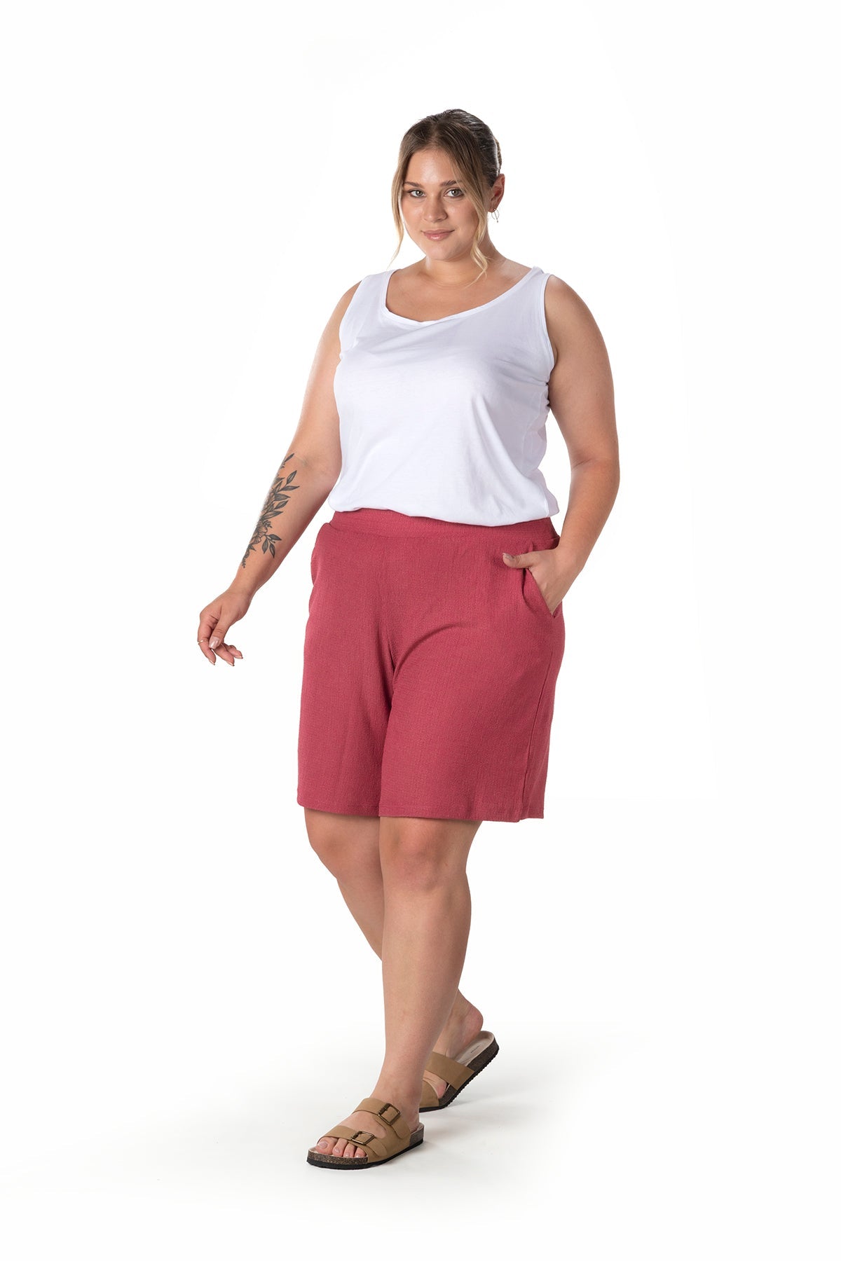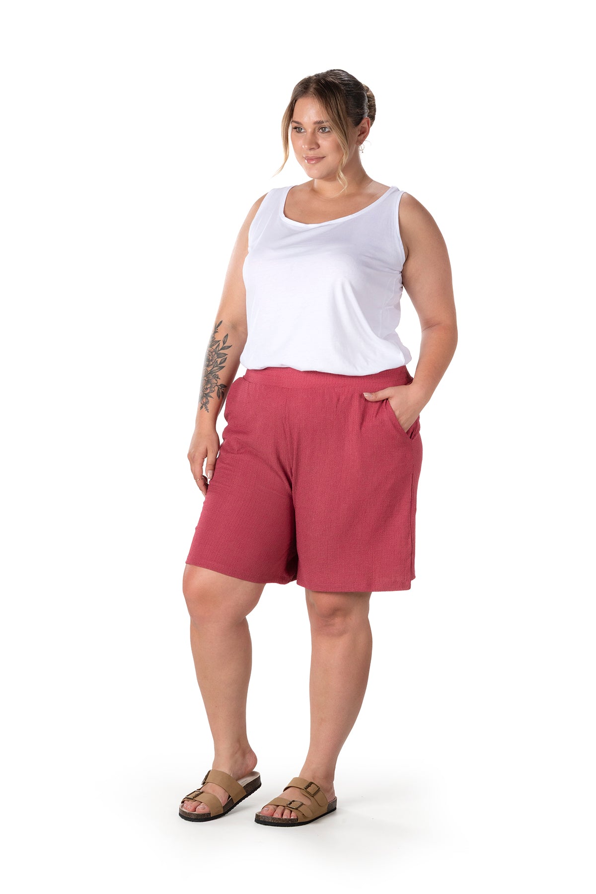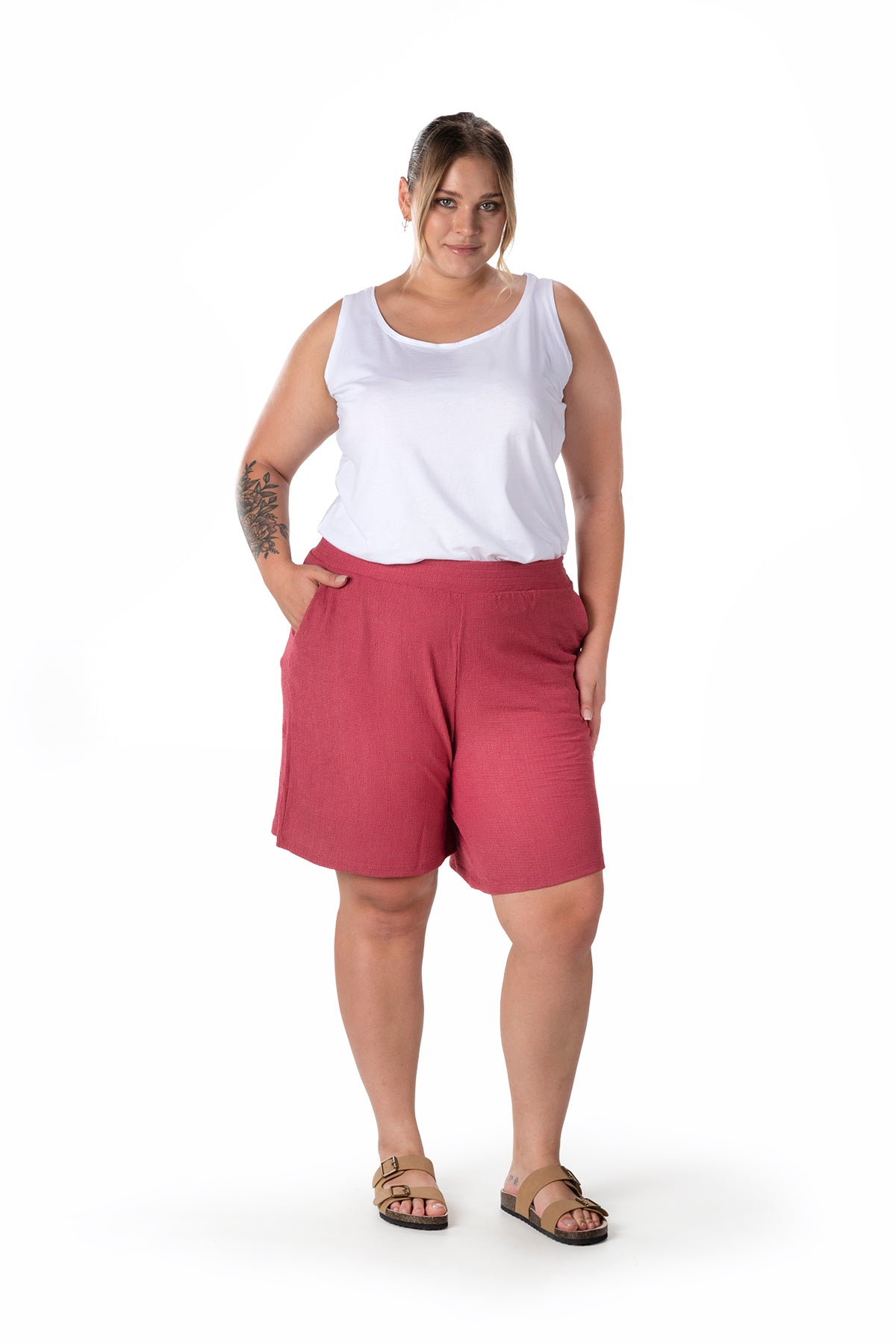 Moda Notu: Yaz aylarının vazgeçilmezi olan bu şort, beli lastikli ve cepli tasarımıyla hem konfor hem de pratiklik sunuyor. Basic bir atlet ve sandaletlerle kombinleyerek rahat ve şık bir yaz stili yaratabilirsiniz.