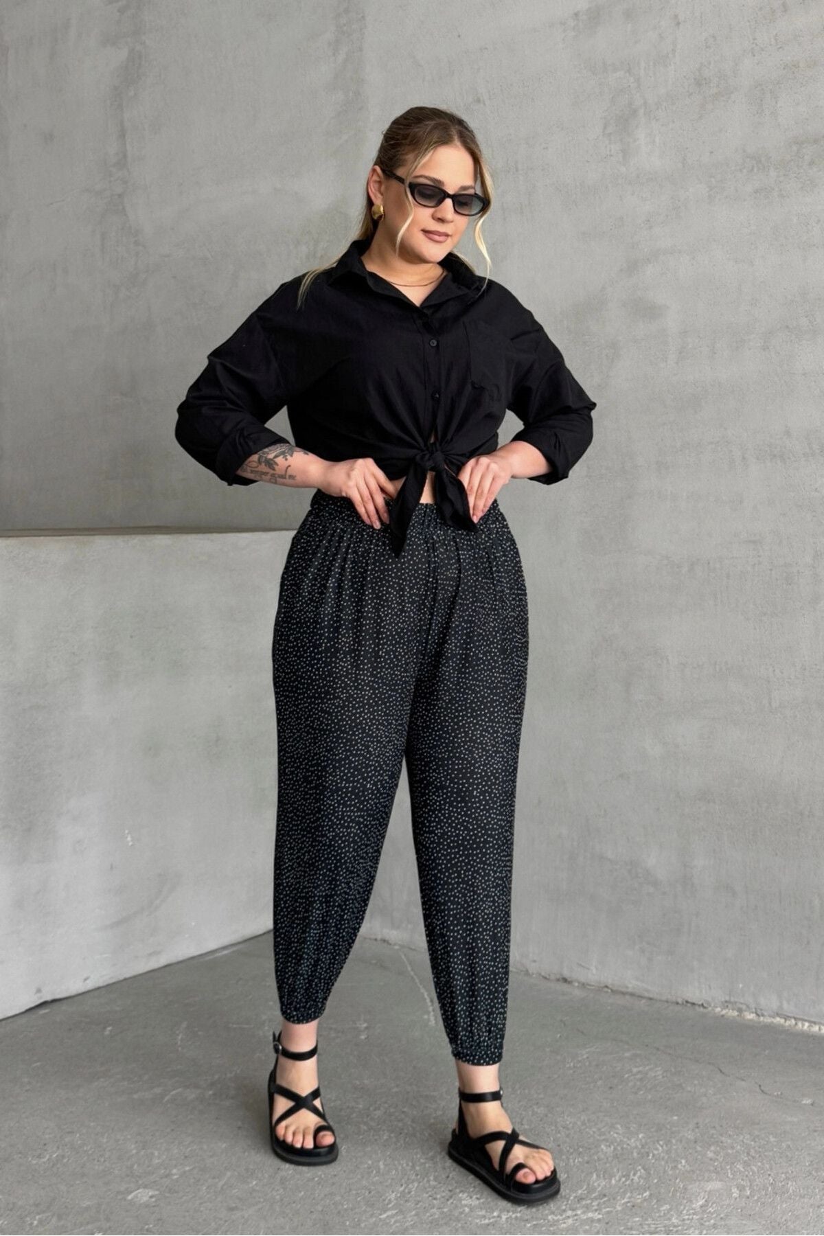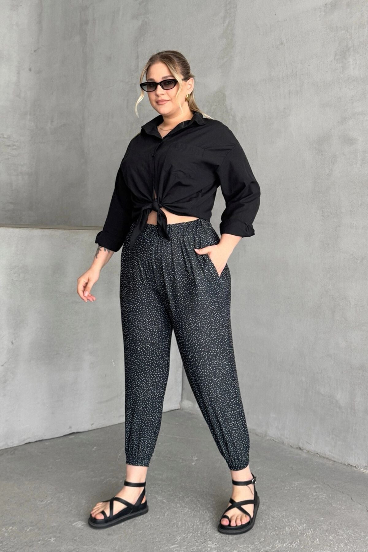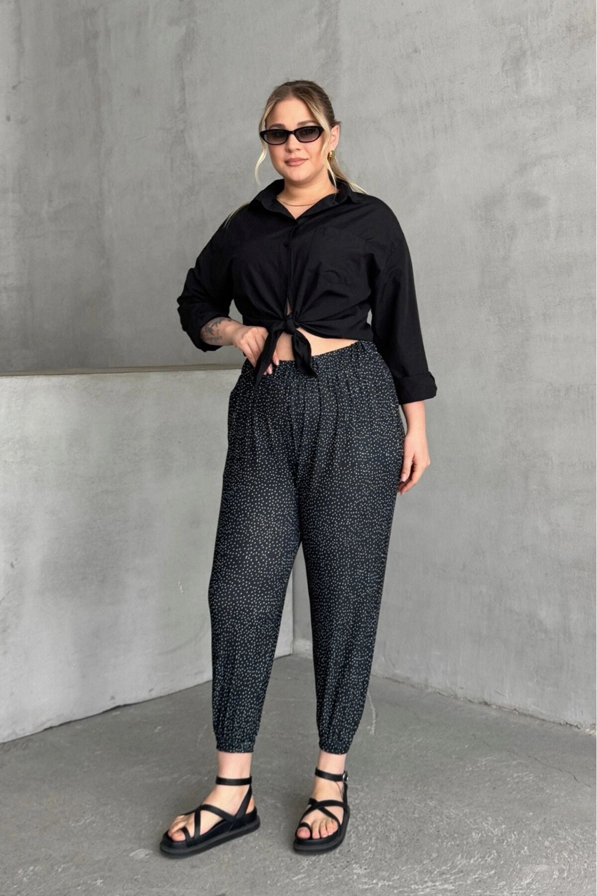 Moda Notu: Rahatlığı ve şıklığı bir araya getiren bu büyük beden pantolon, beli ve paçası lastikli tasarımıyla gün boyu konfor sunar. Puantiyeli deseni modern bir görünüm katarken, cepleriyle de pratiklik sağlar. Basic bir gömlek ve sandaletlerle kombinleyerek zahmetsiz bir şıklık yakalayabilirsiniz.