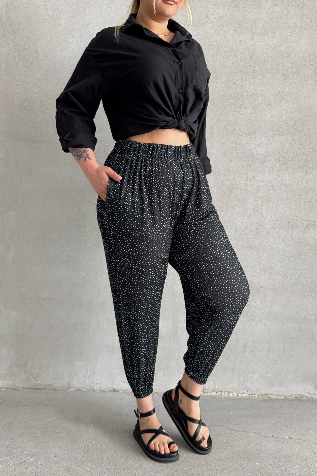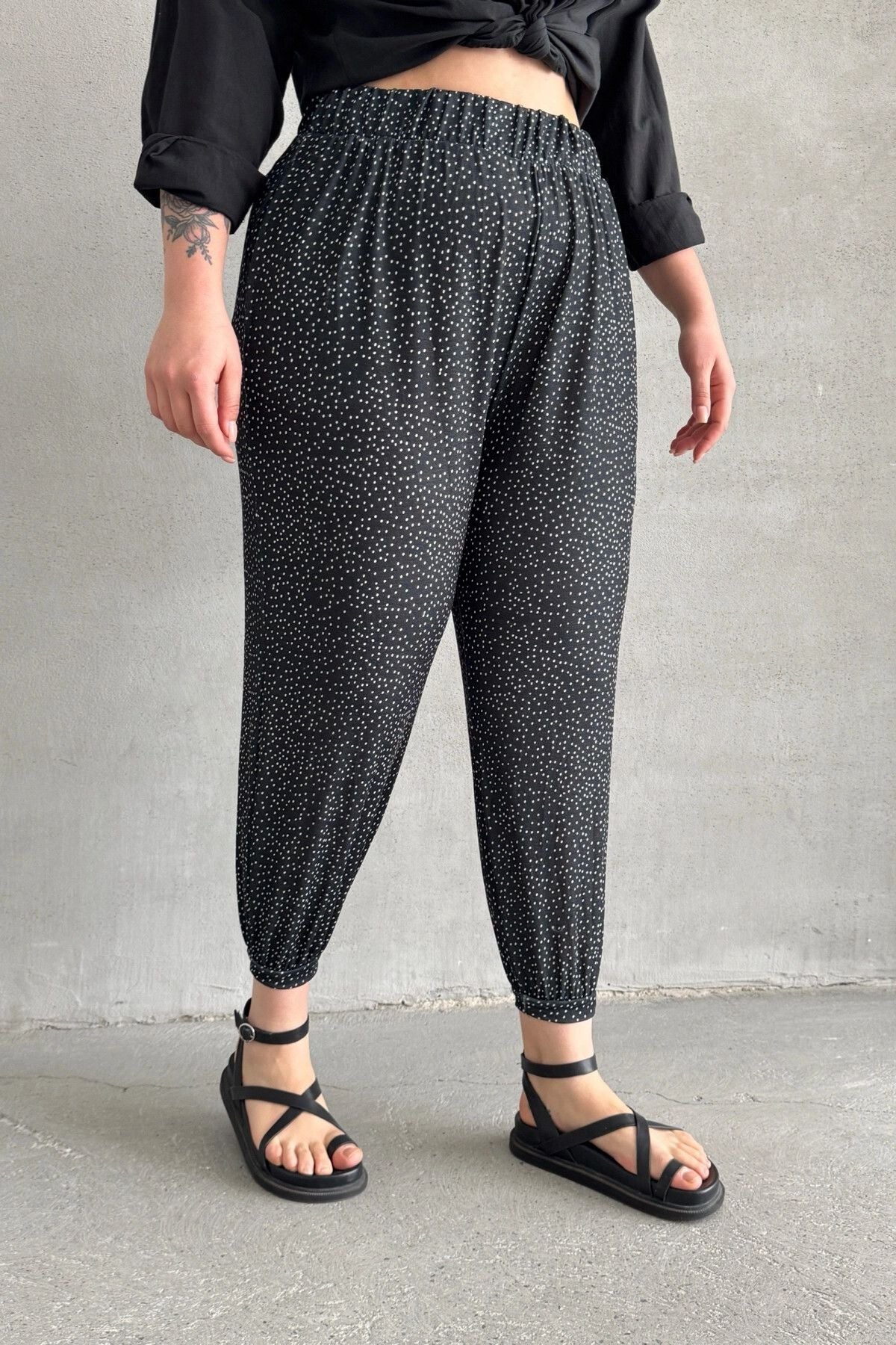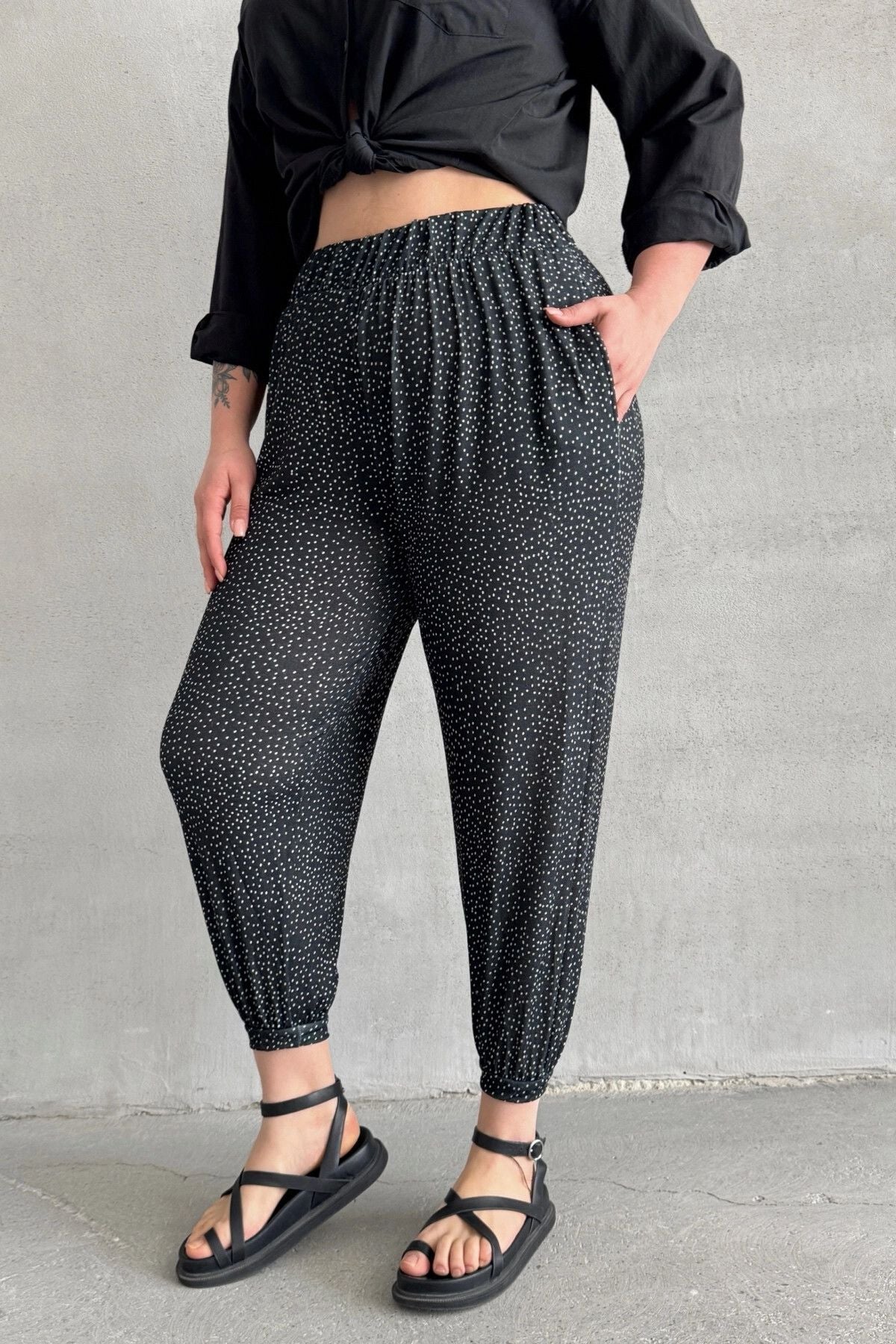 Moda Notu: Rahatlığı ve şıklığı bir araya getiren bu büyük beden pantolon, beli ve paçası lastikli tasarımıyla gün boyu konfor sunar. Puantiyeli deseni modern bir görünüm katarken, cepleriyle de pratiklik sağlar. Basic bir gömlek ve sandaletlerle kombinleyerek zahmetsiz bir şıklık yakalayabilirsiniz.