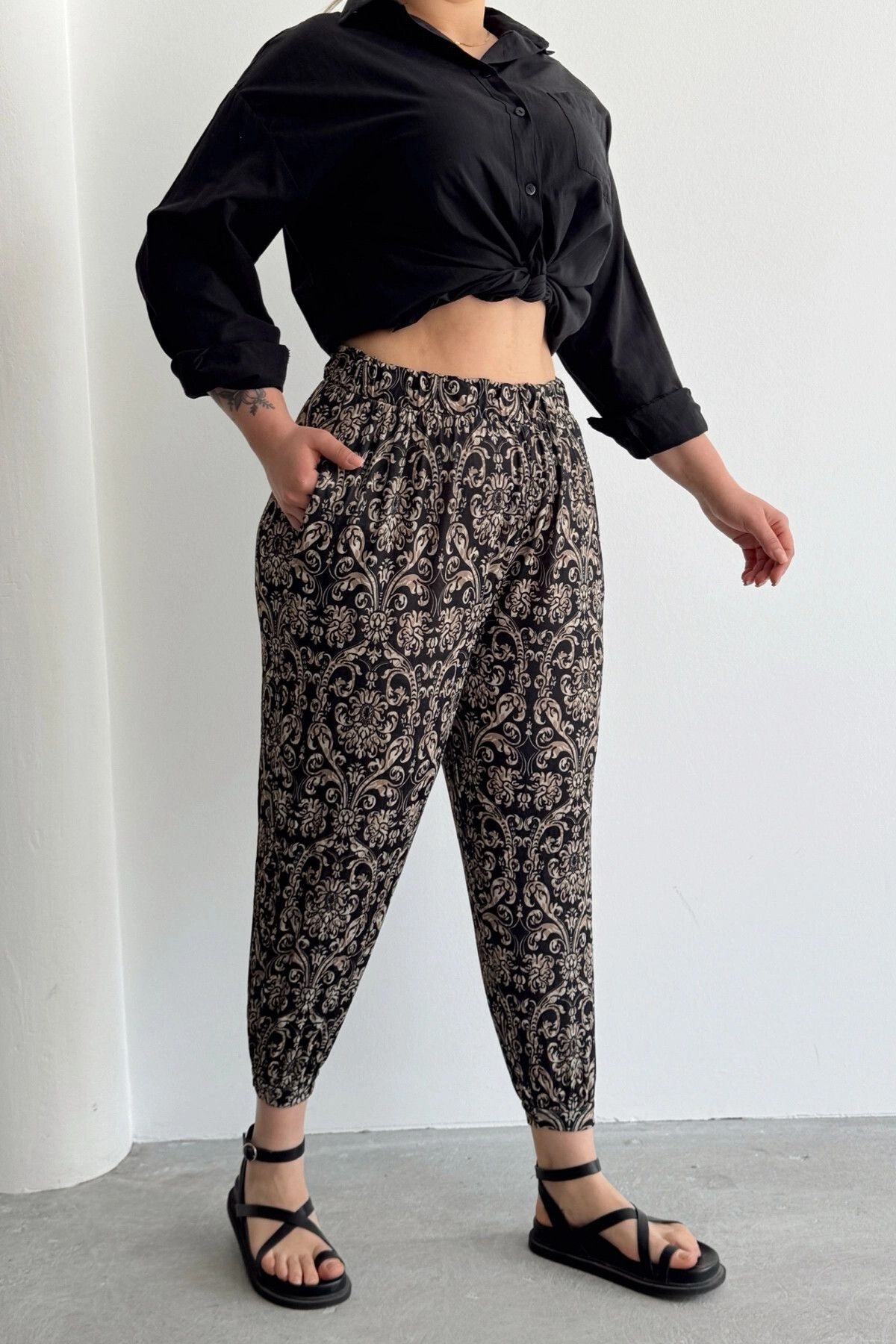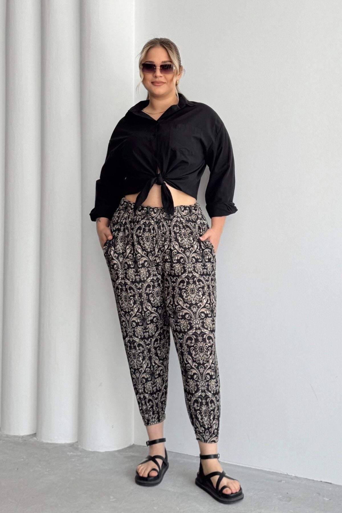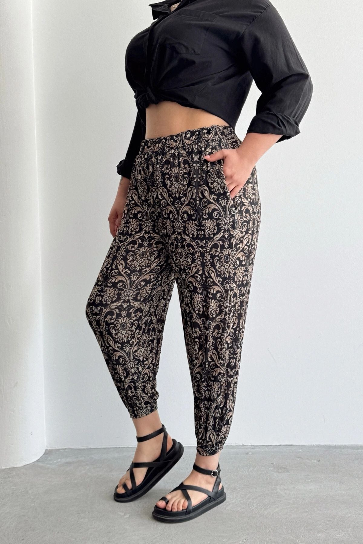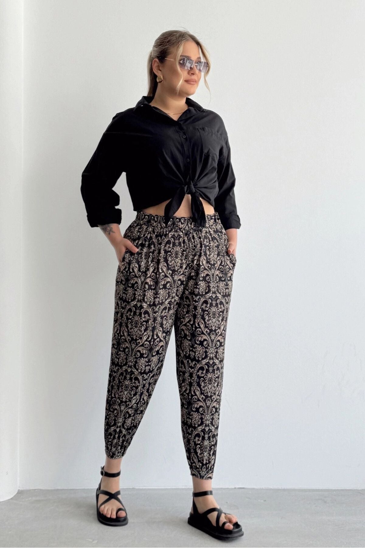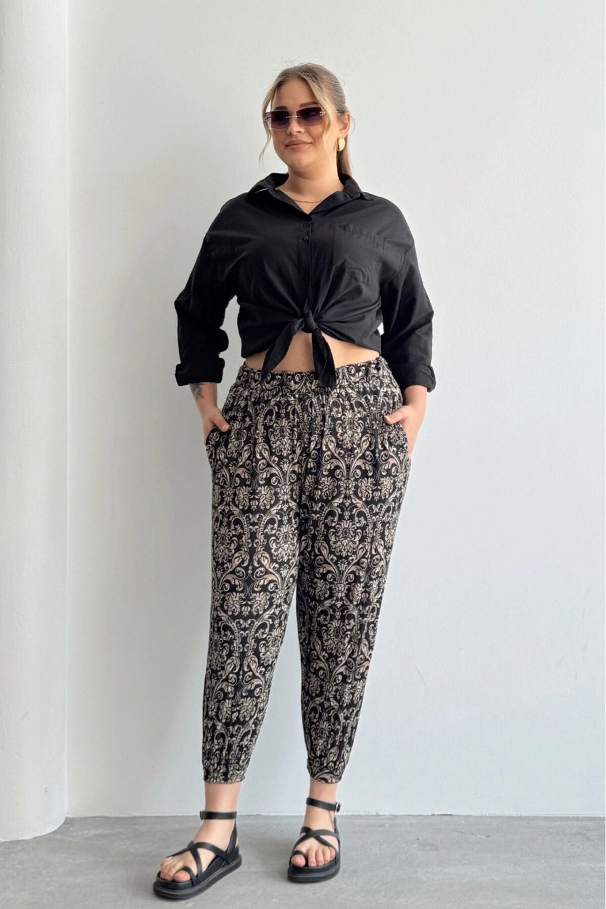 Büyük Beden Beli ve Paçası Lastikli Cepli Desenli Şalvar Pantolon 74-75