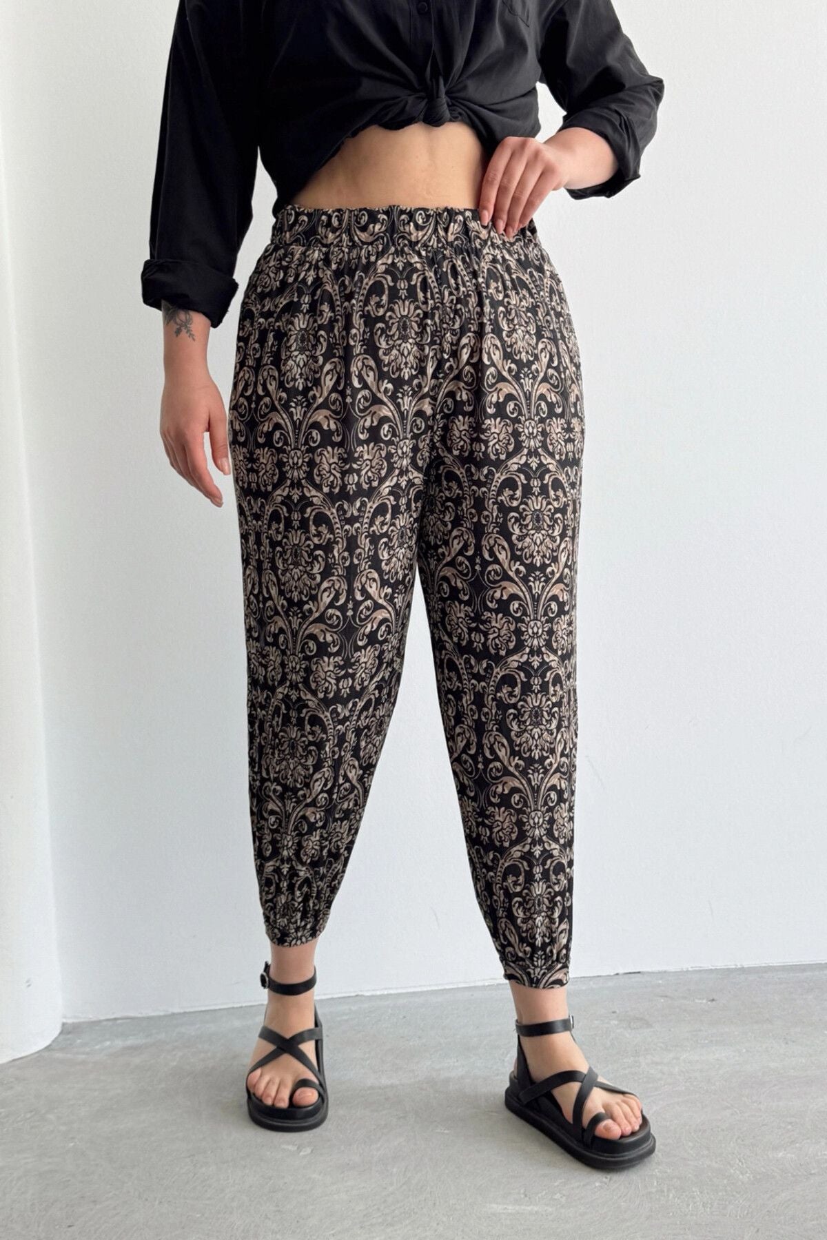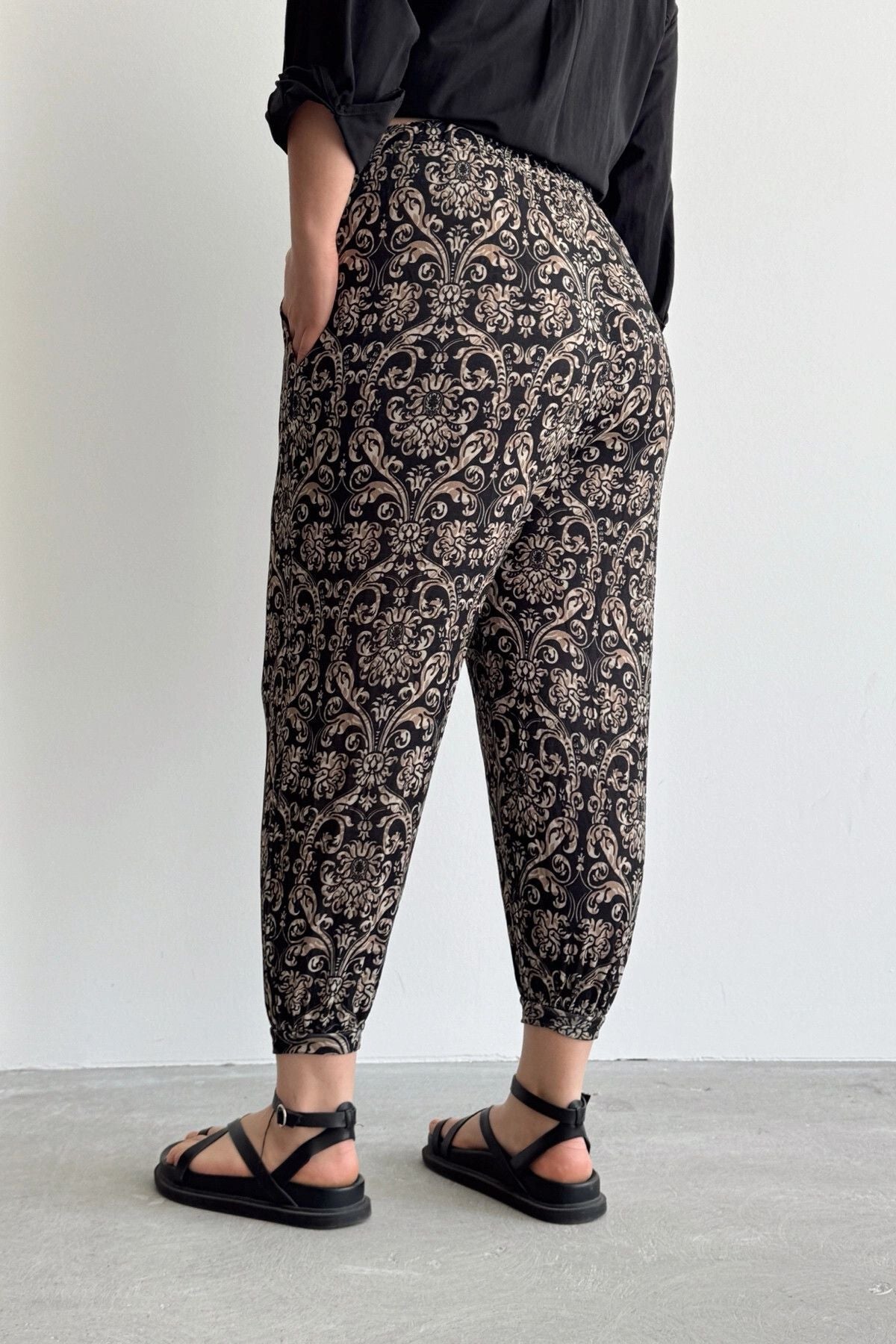 Model Detayı: Şal Desenli, Beli ve Paçası Lastikli, Cepli Pantolon