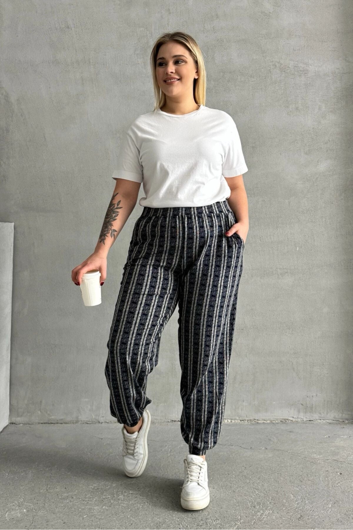 Büyük Beden Beli ve Paçası Lastikli Çizgili Cepli Pantolon 89-71