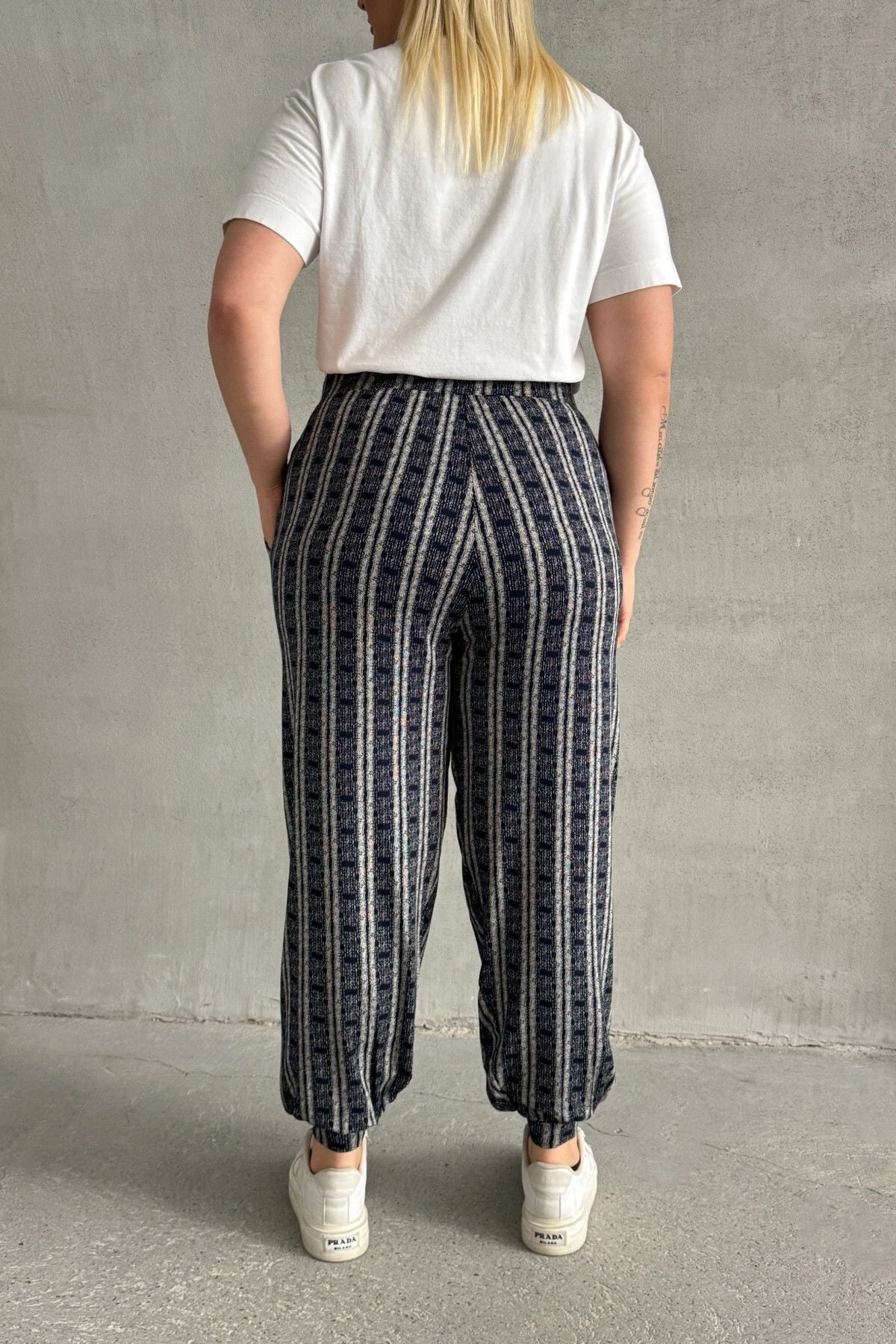 Model Detayı: Çizgili, Beli ve Paçası Lastikli, Cepli Pantolon