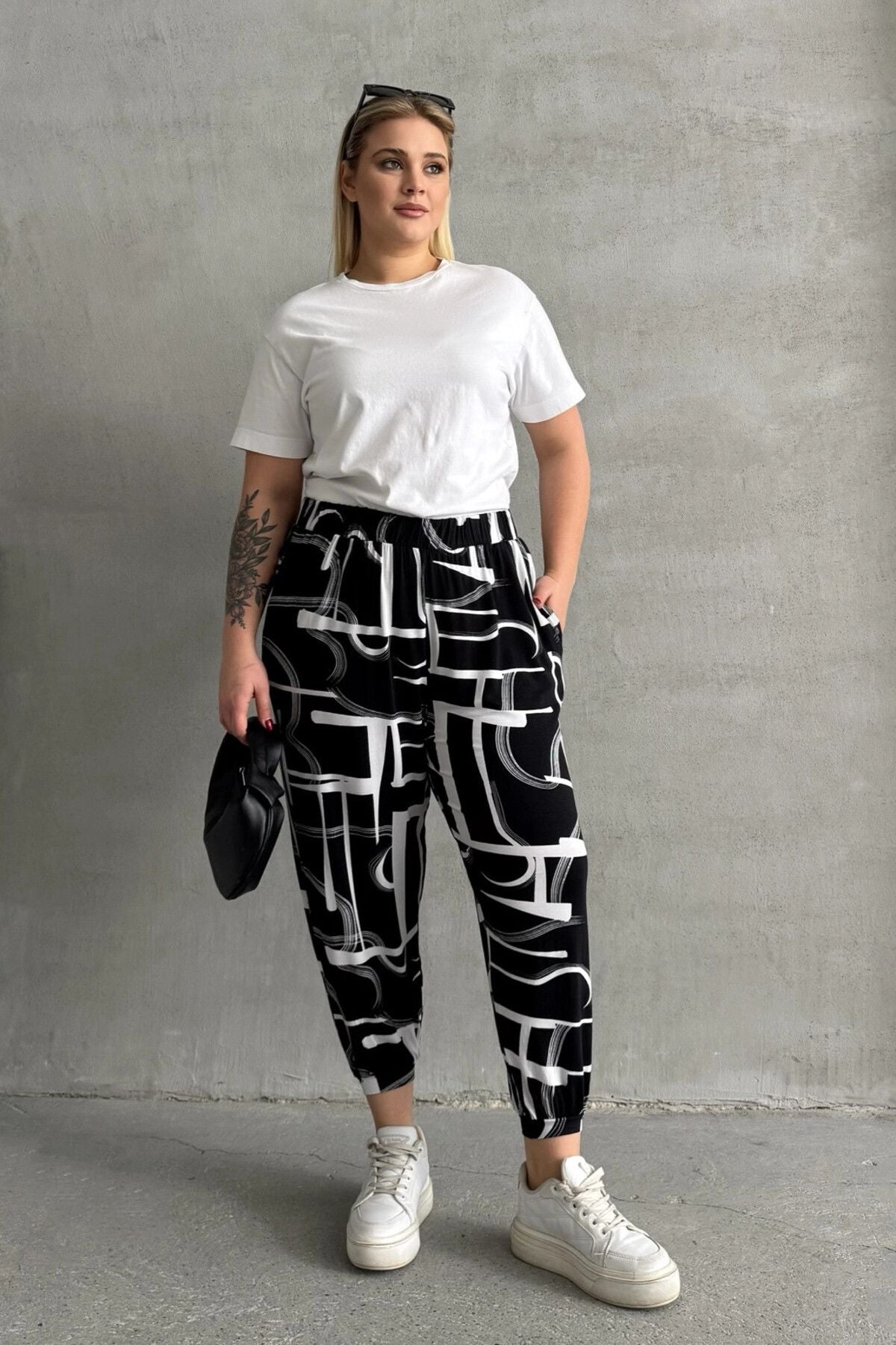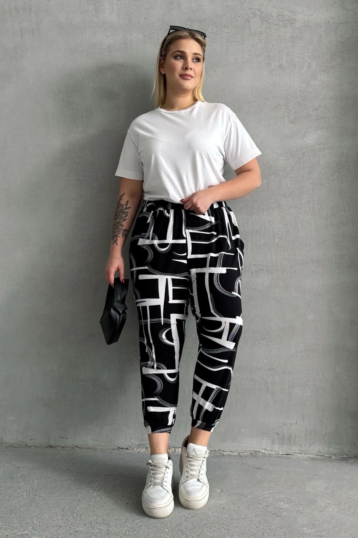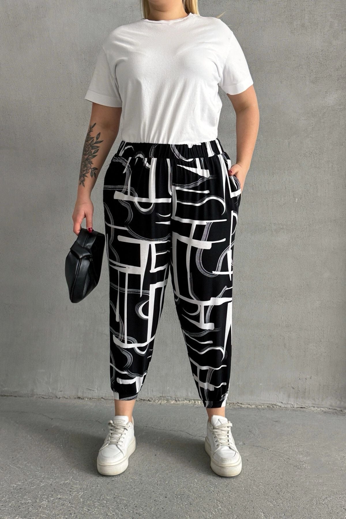 Büyük Beden Beli ve Paçası Lastikli Desenli Cepli Pantolon 98-4