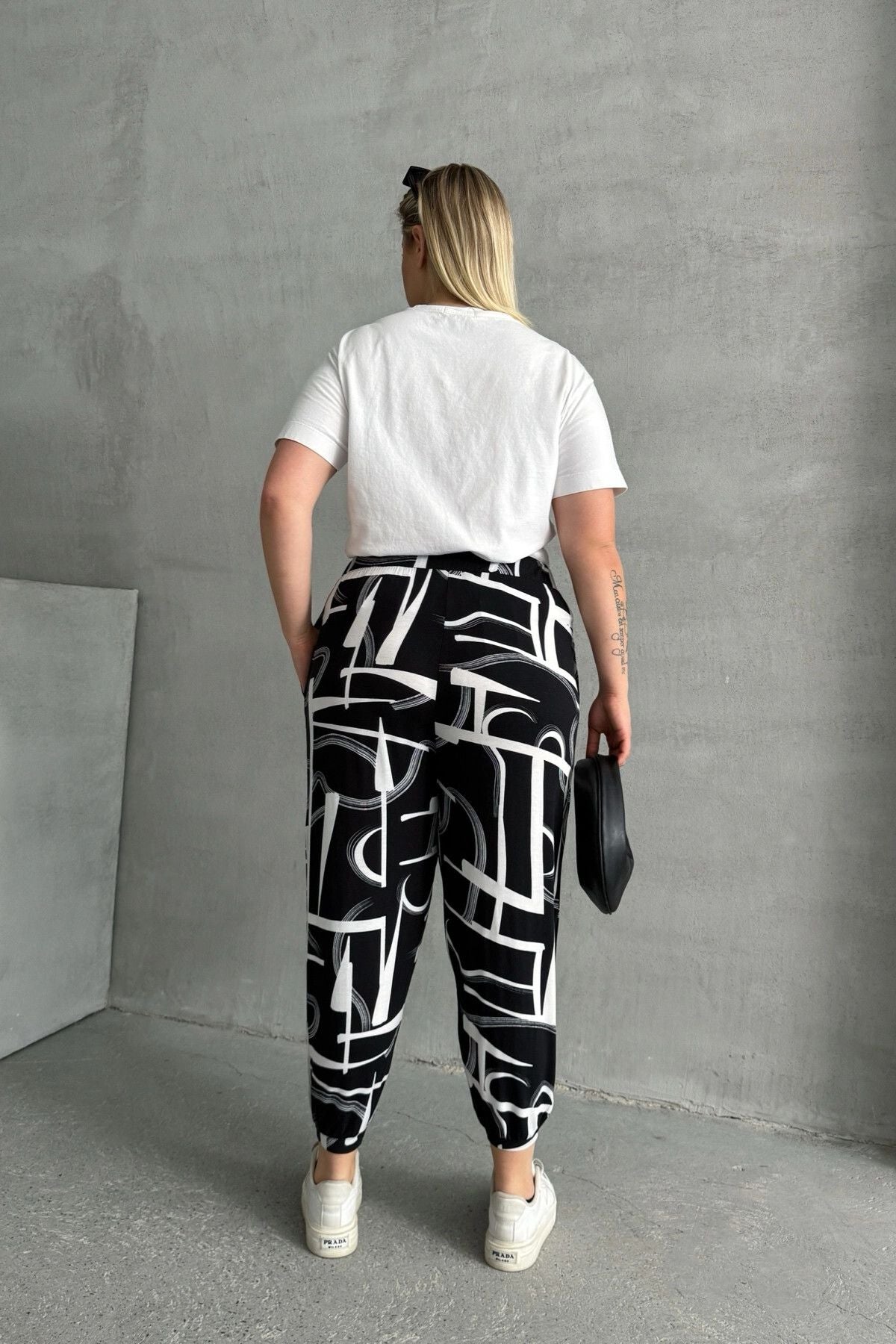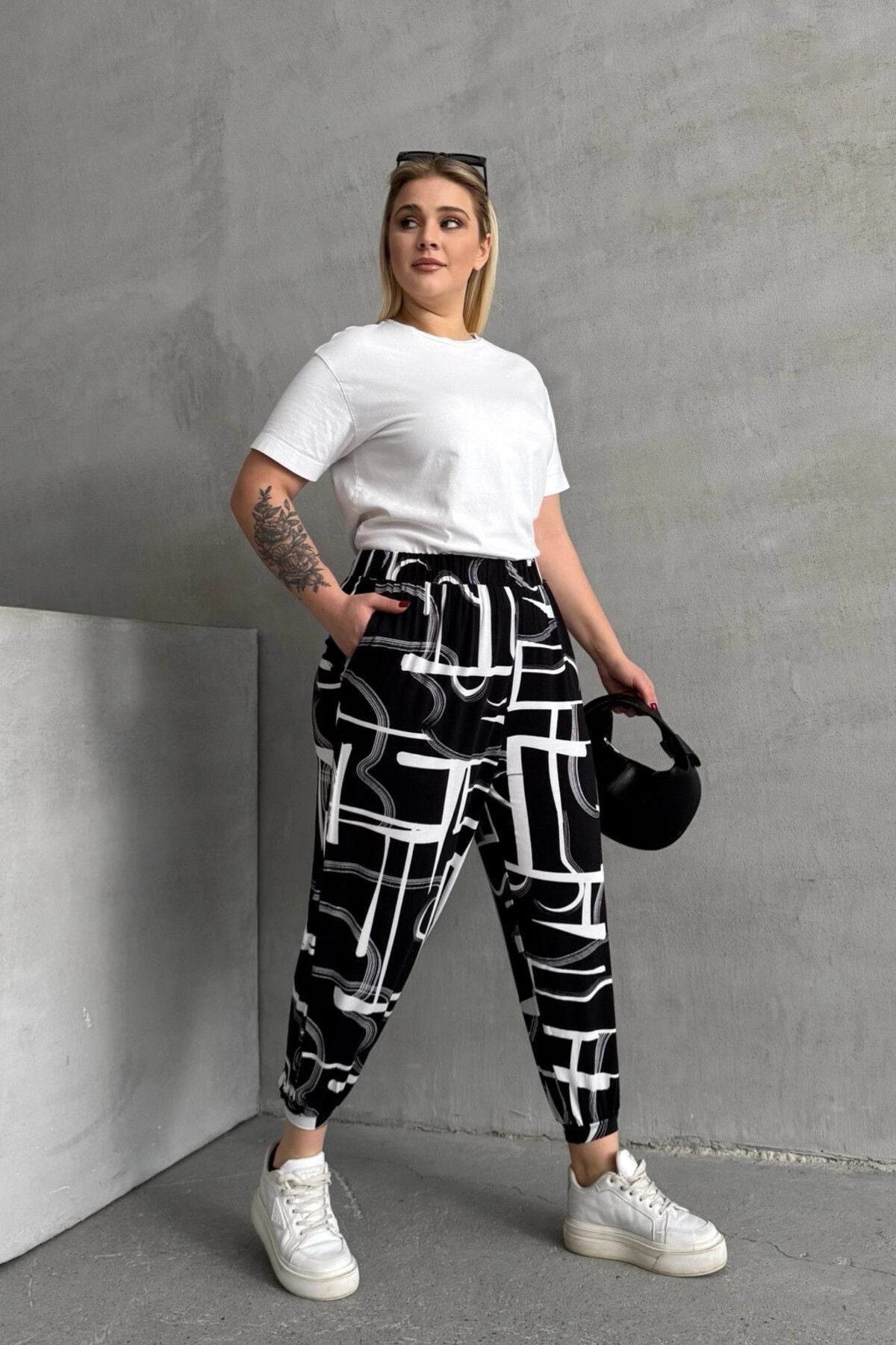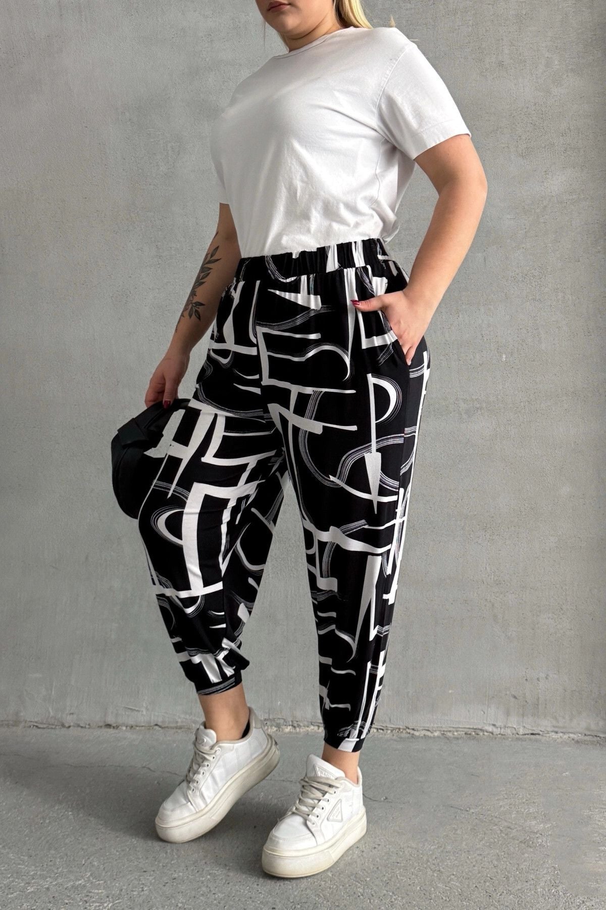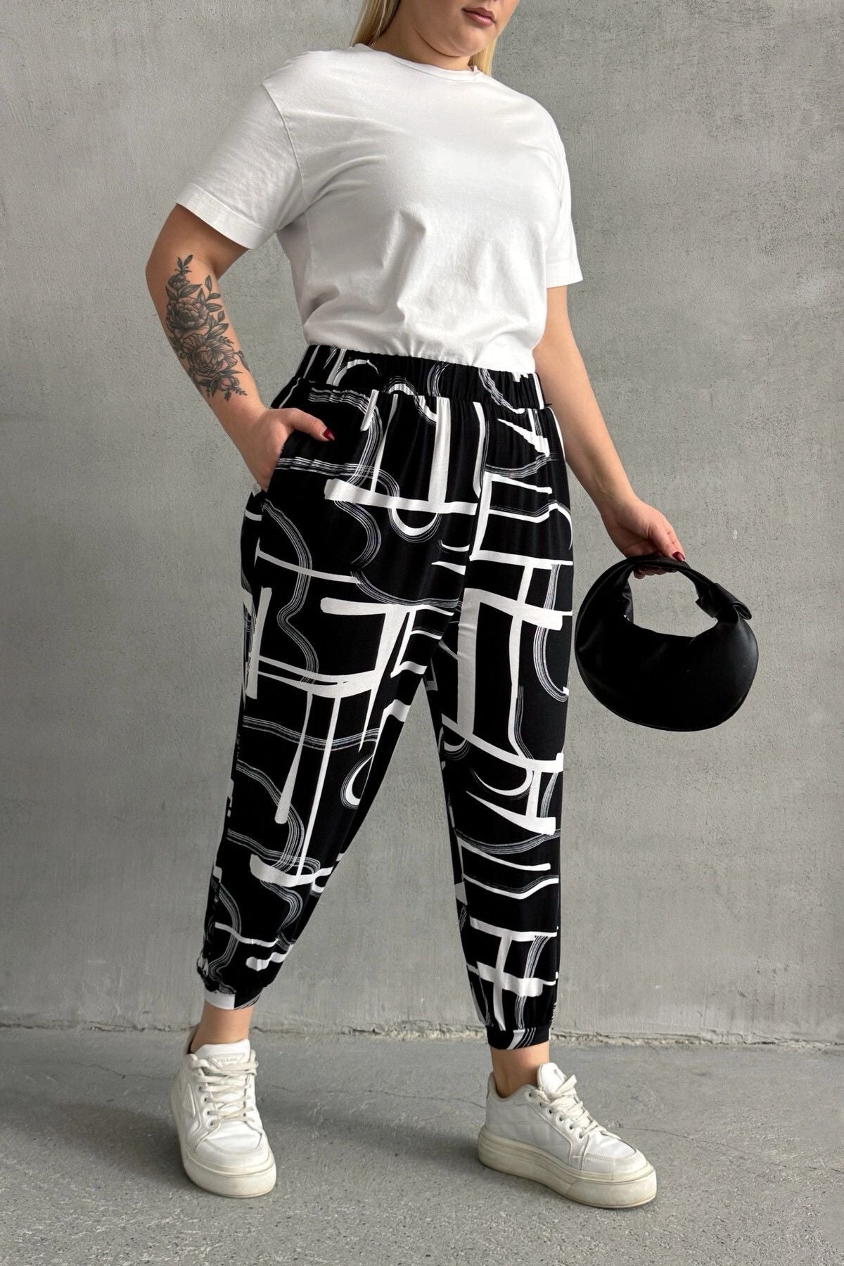 Büyük Beden Beli ve Paçası Lastikli Desenli Cepli Pantolon 98-4