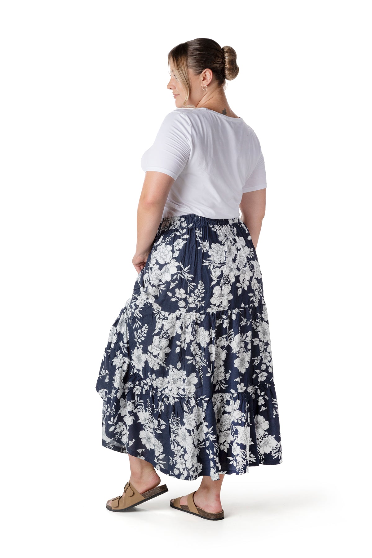 Moda Notu: Yazın enerjisini yansıtan bu çiçek desenli uzun etek, beli lastikli tasarımı ve kat kat detayıyla hem rahatlık hem de bohem bir şıklık sunar. Basic bir tişört ve sandaletlerle kombinleyerek ferah bir yaz stili yaratabilirsiniz.