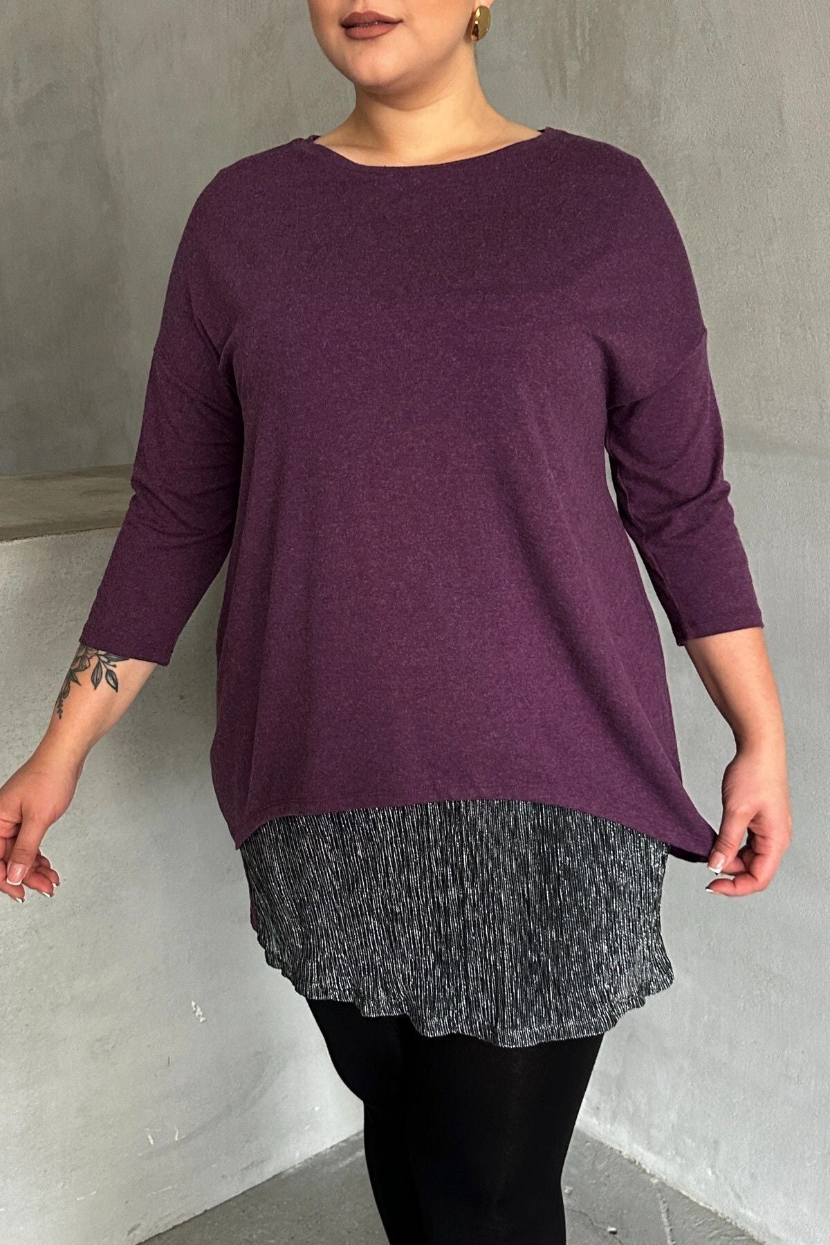 Büyük Beden Eteği Tül Detaylı Uzun Kollu İnce Bluz 84-106