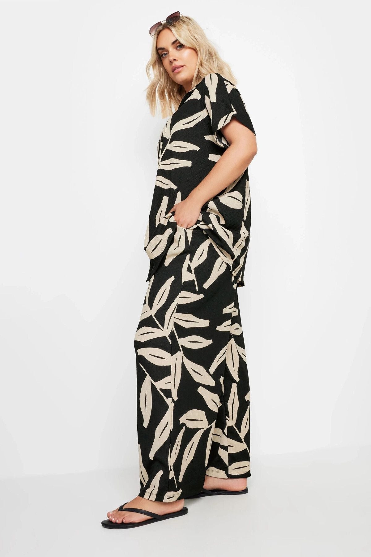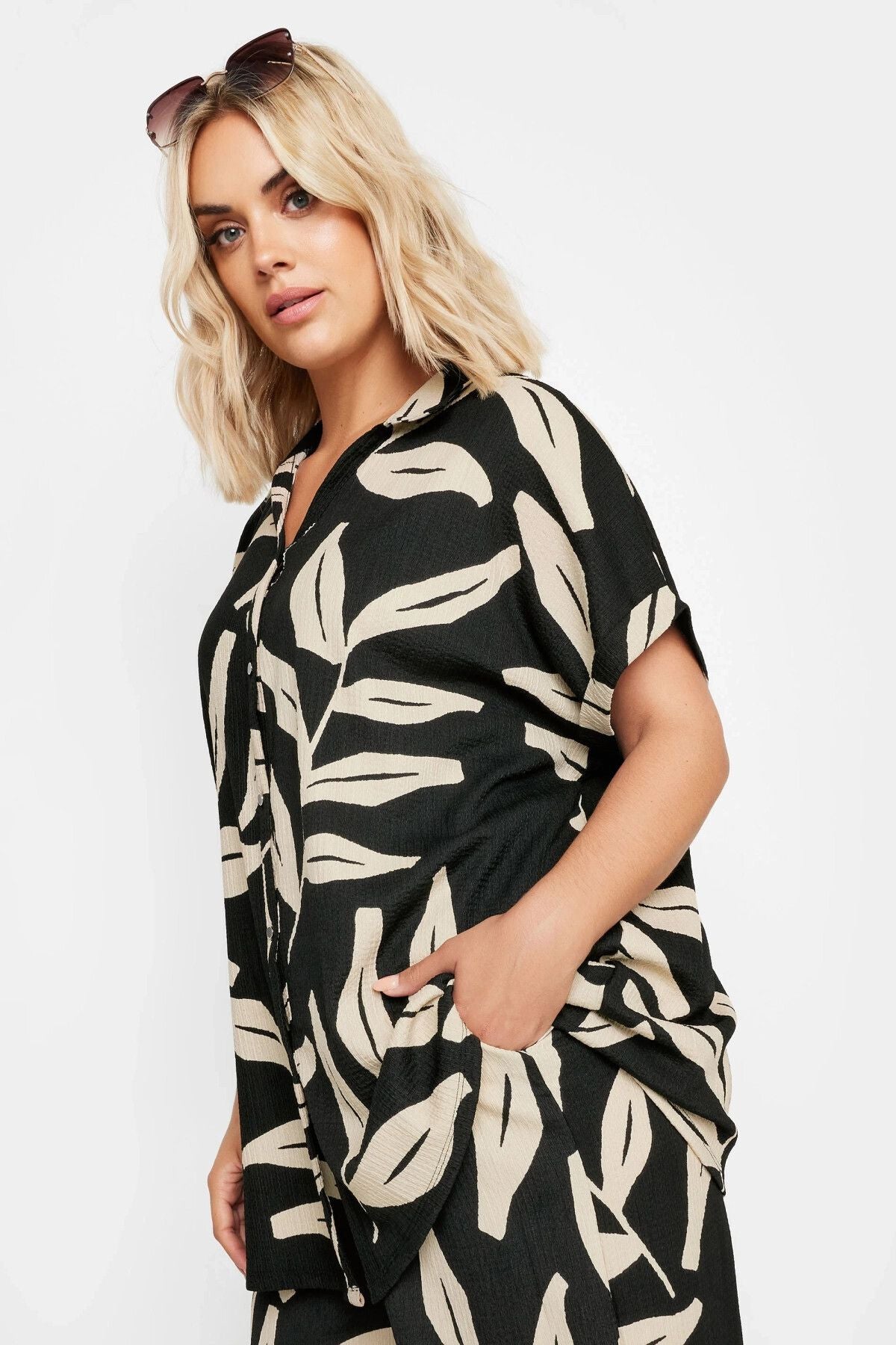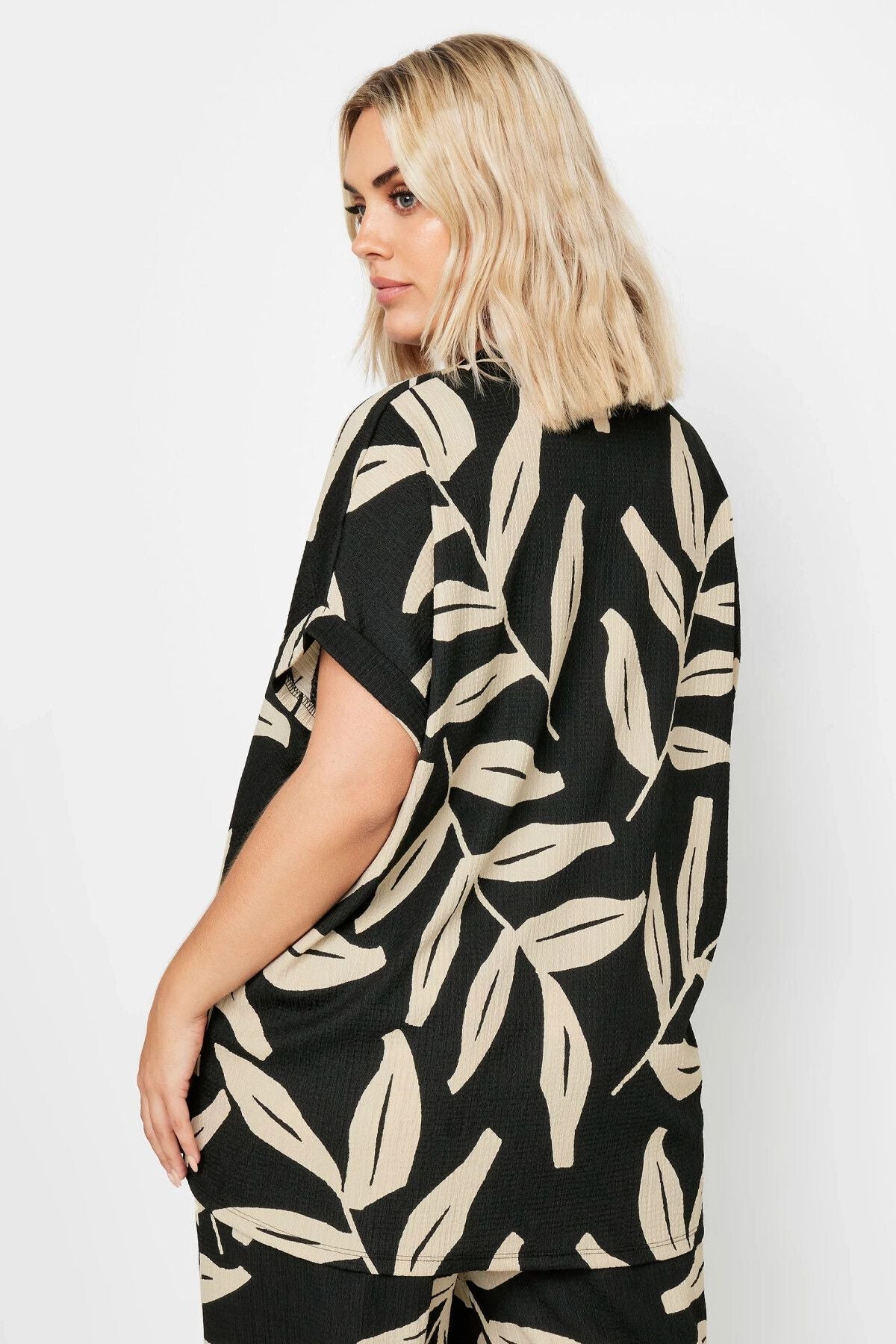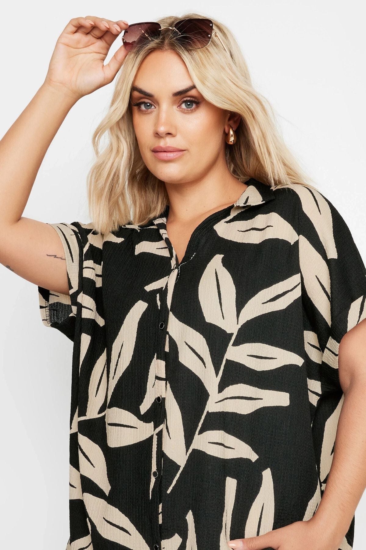 Model Detayı: Siyah zemin üzerine bej yaprak desenli, klasik gömlek yakalı, düğmeli ön kapama, kısa kimono kollu, krinkıl dokulu