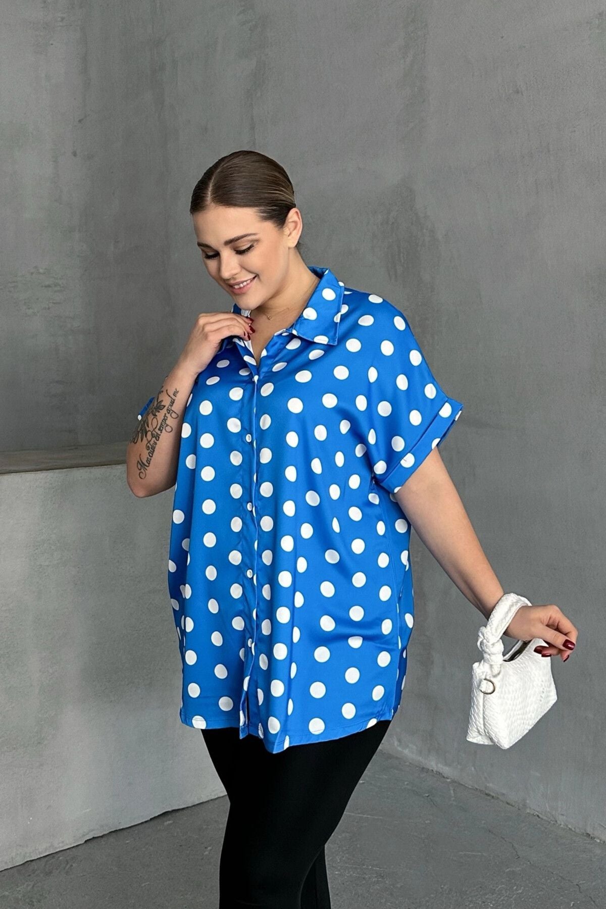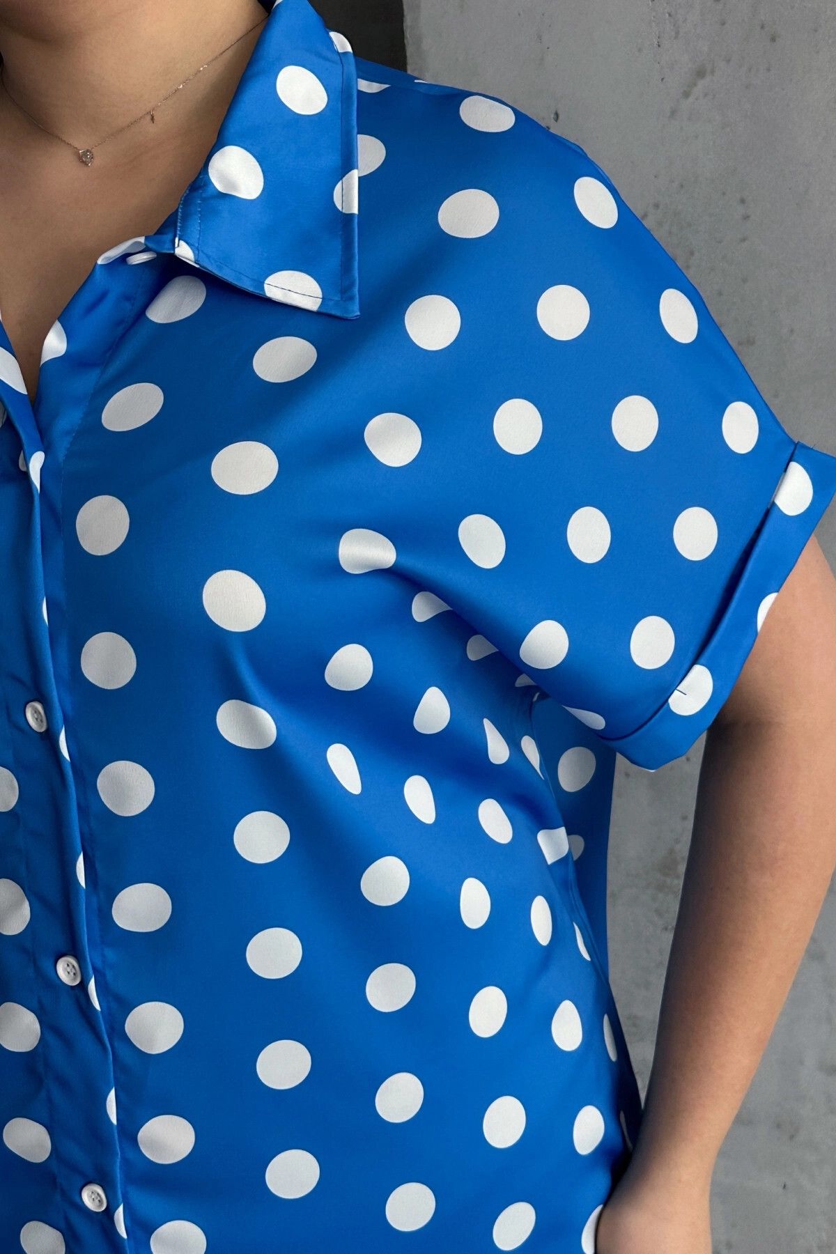Büyük Beden Önü Düğmeli Kısa Kollu Puantiye Desenli Gömlek 303462