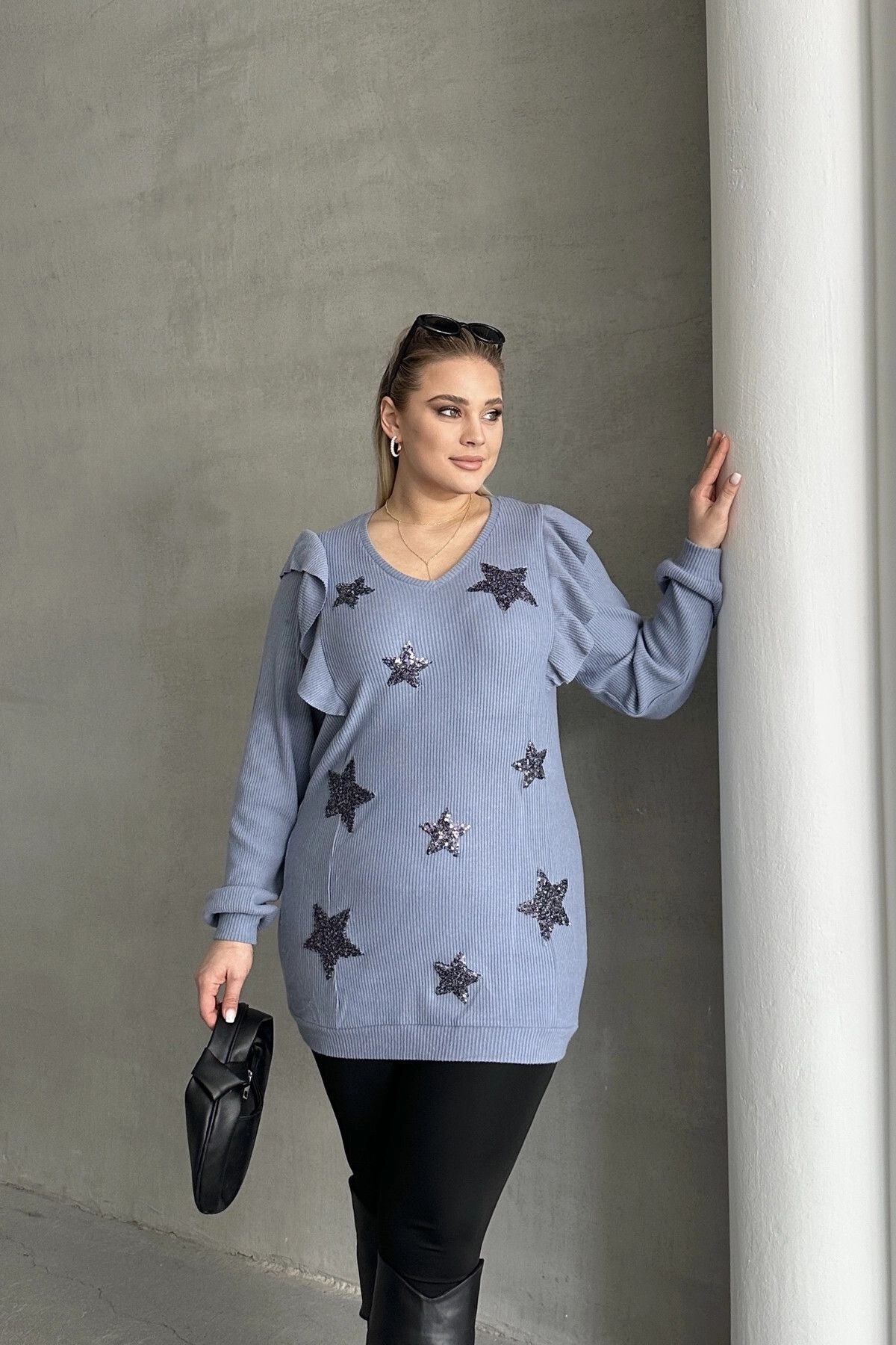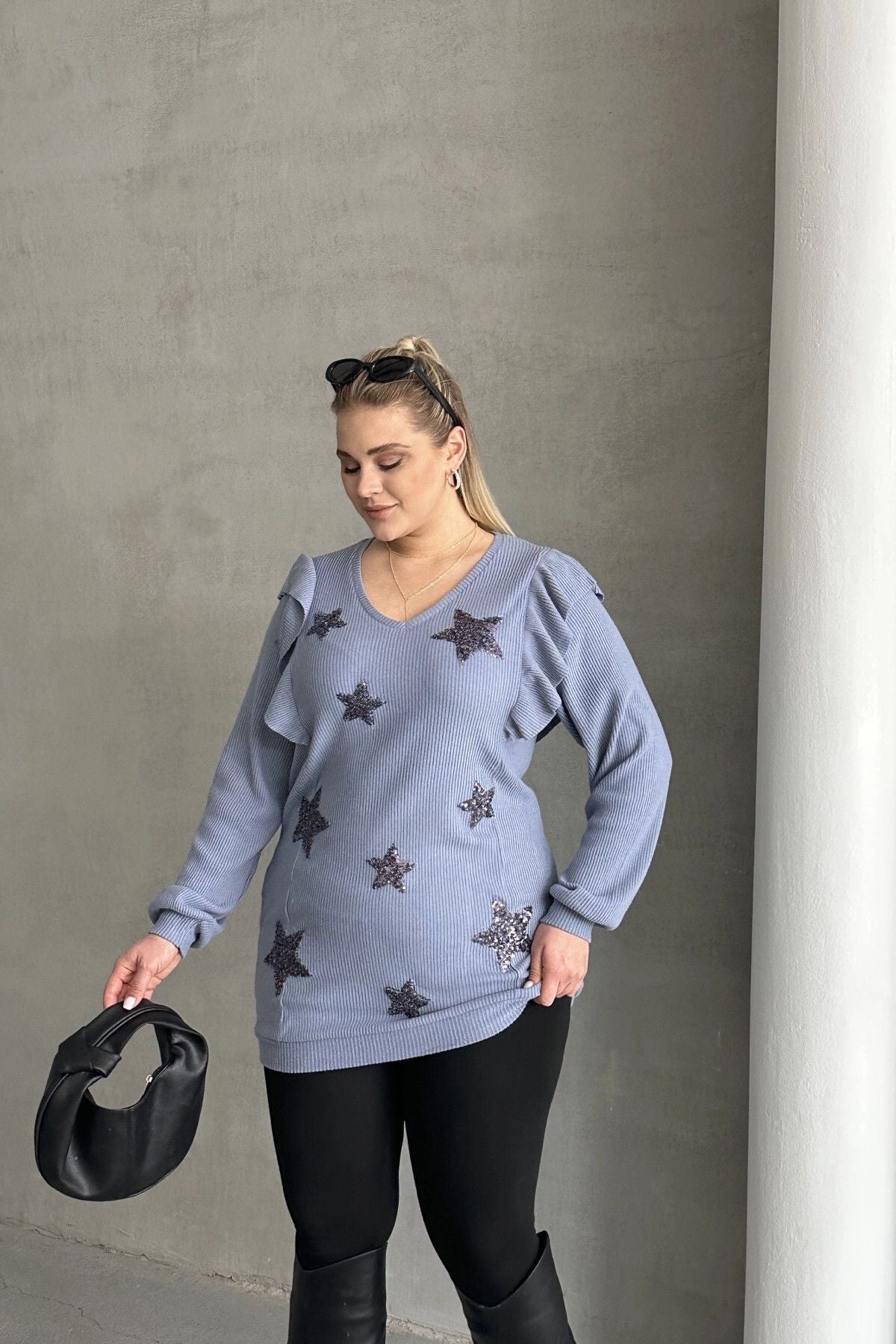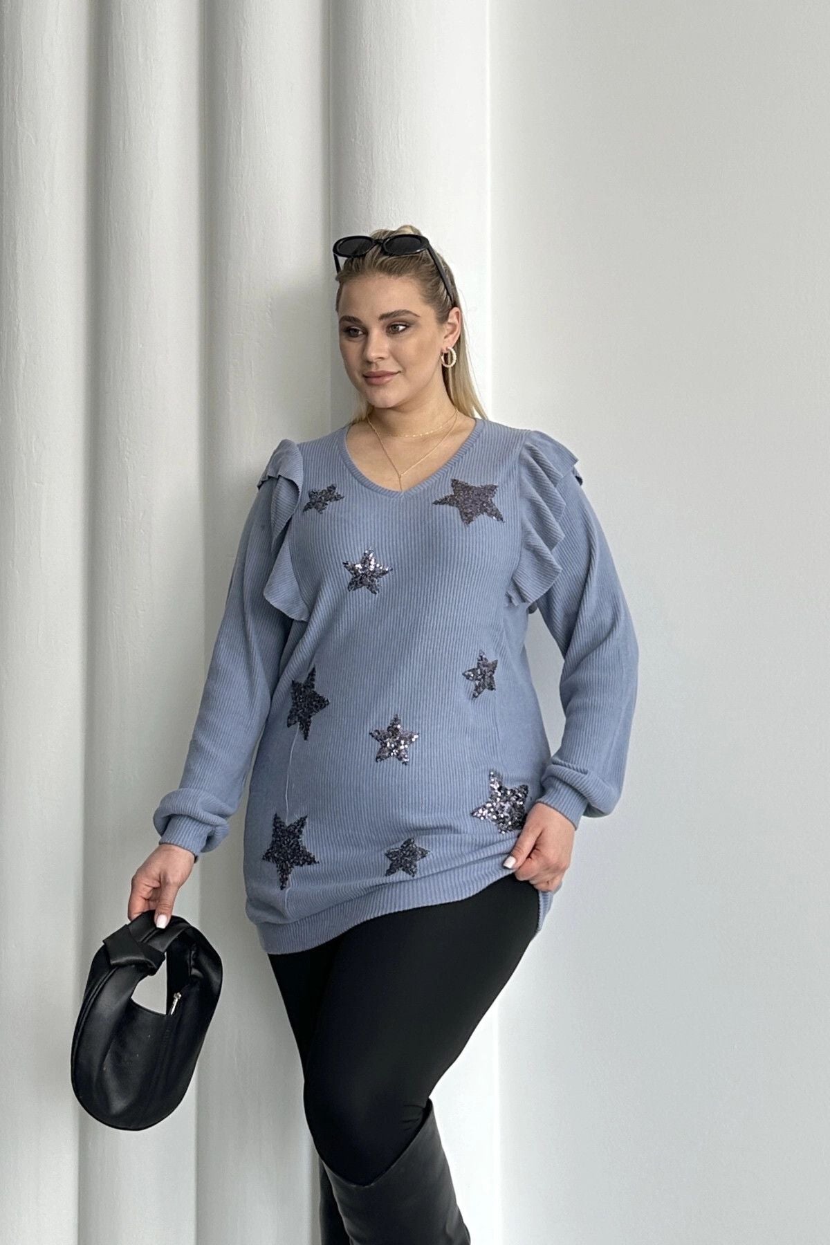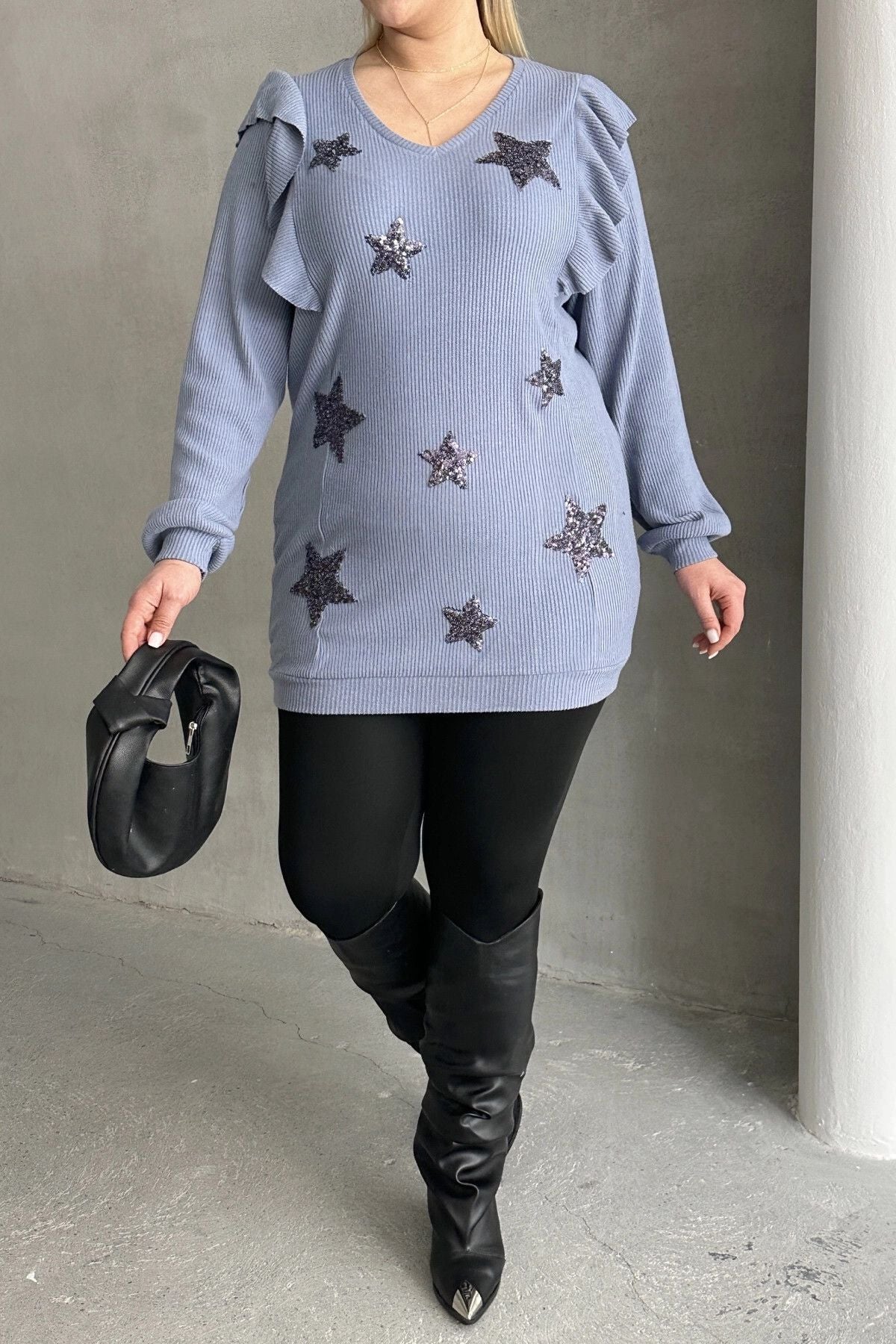 Büyük Beden Uzun Kolları Fırfırlı Yıldız Desen İşlemeli Bluz 301234