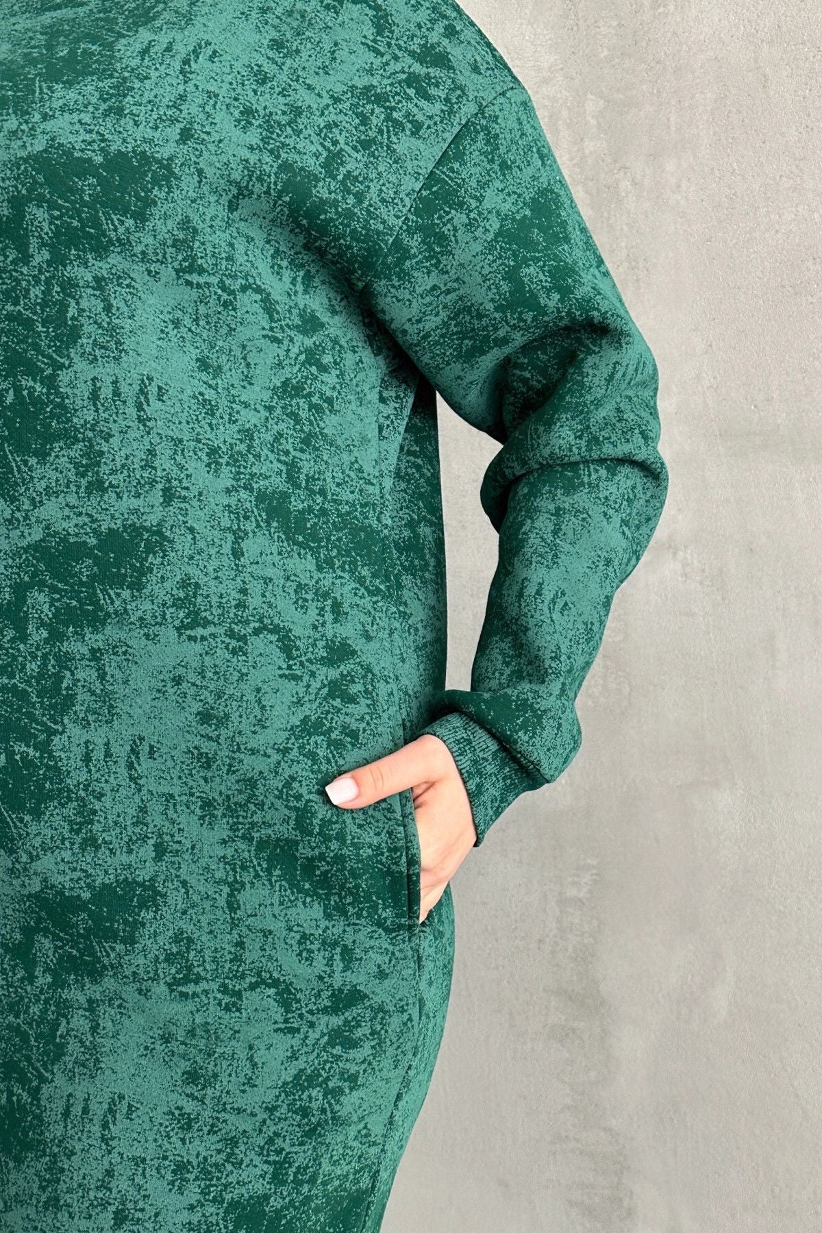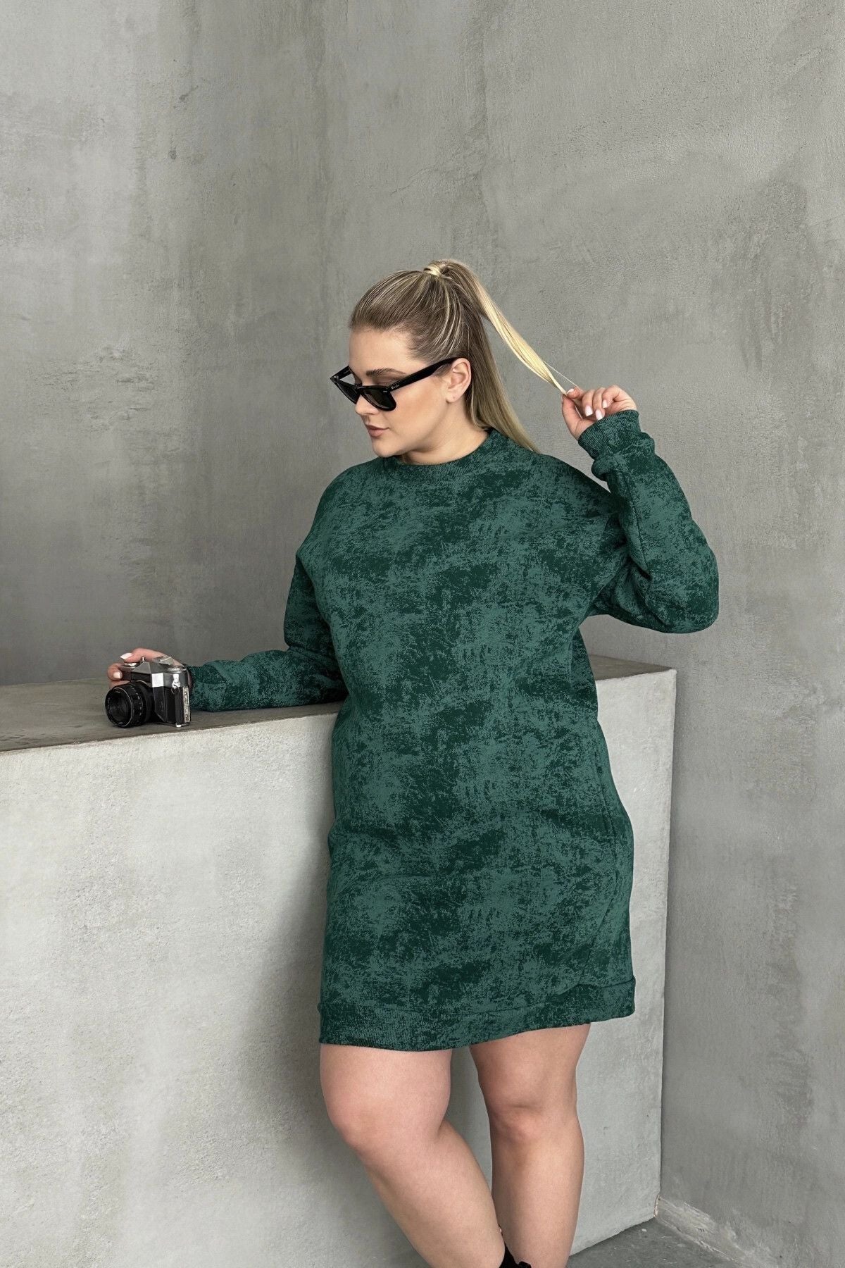 Büyük Beden Uzun Kollu Bisiklet Yaka Cepli Desenli Elbise 106-77