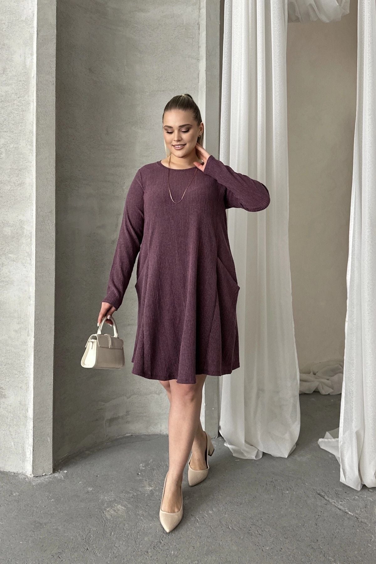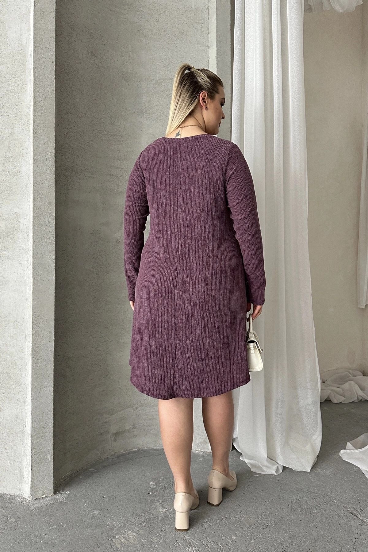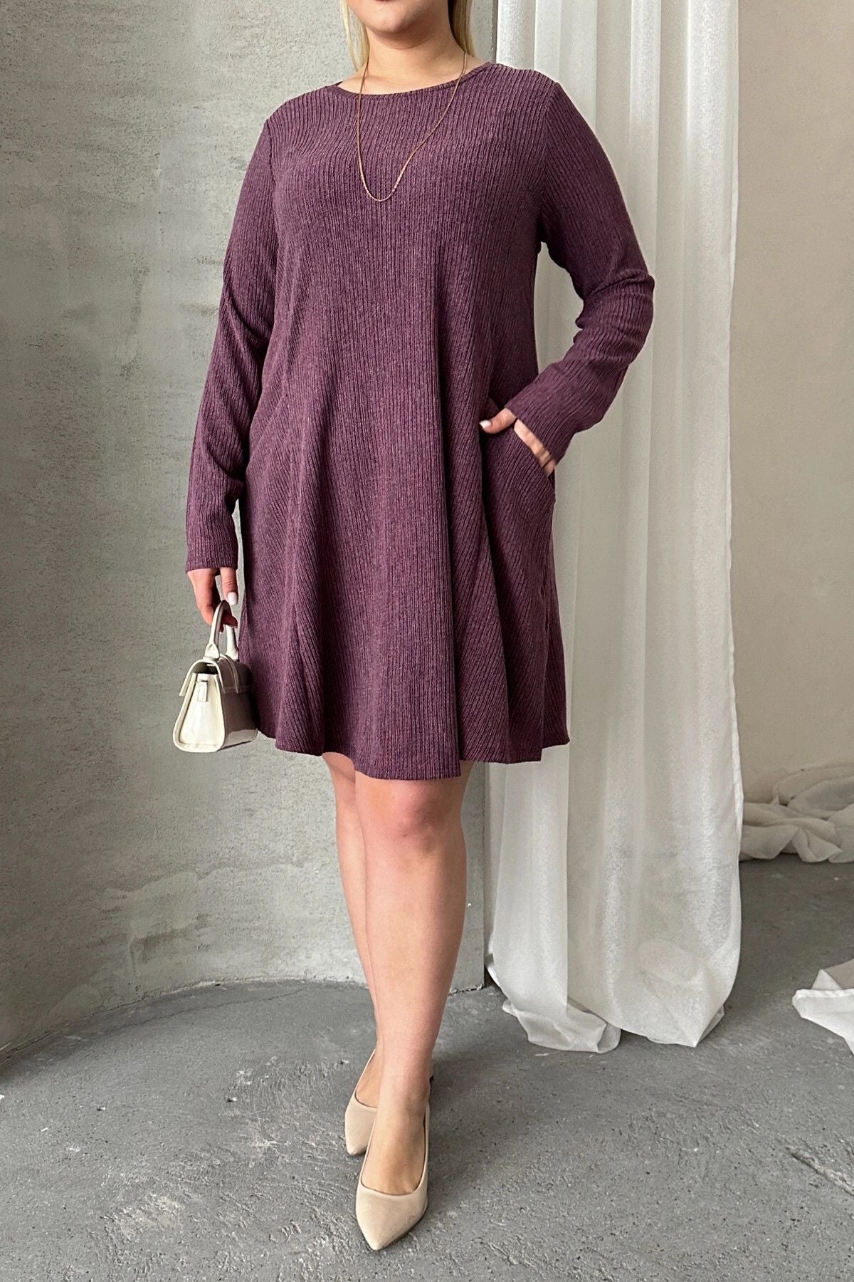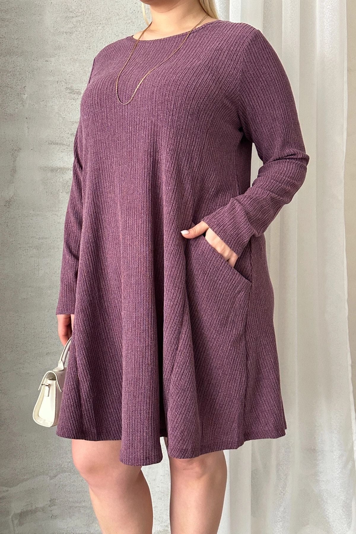 Büyük Beden Uzun Kollu Bisiklet Yaka Cepli Fitilli Elbise 100-186