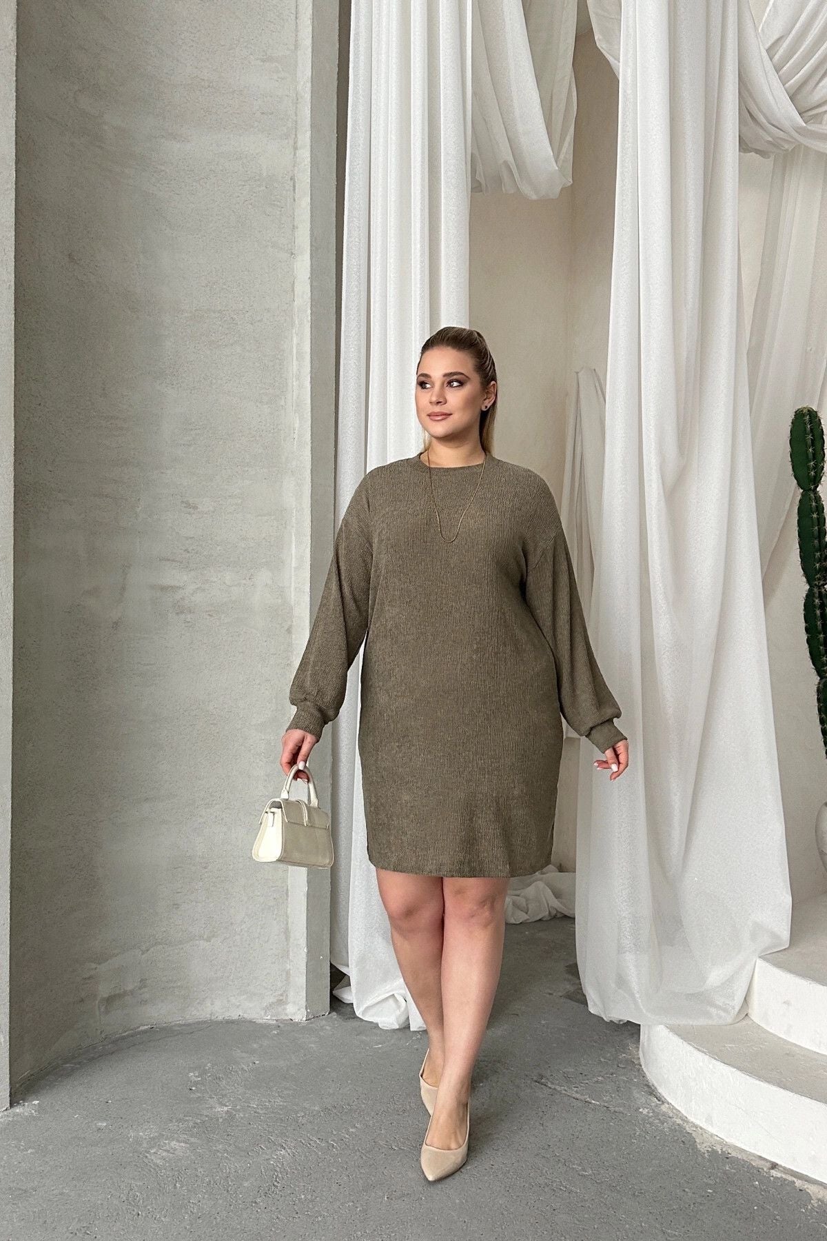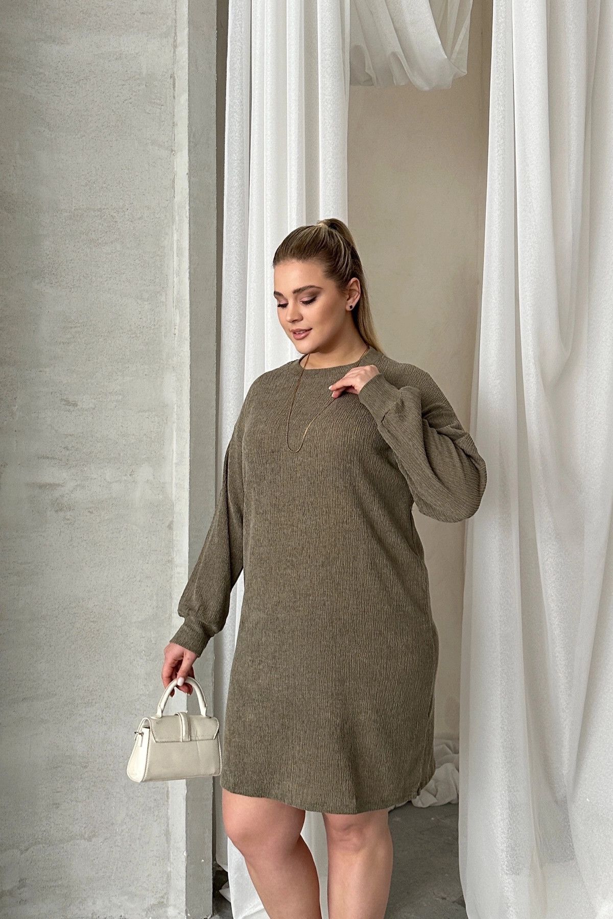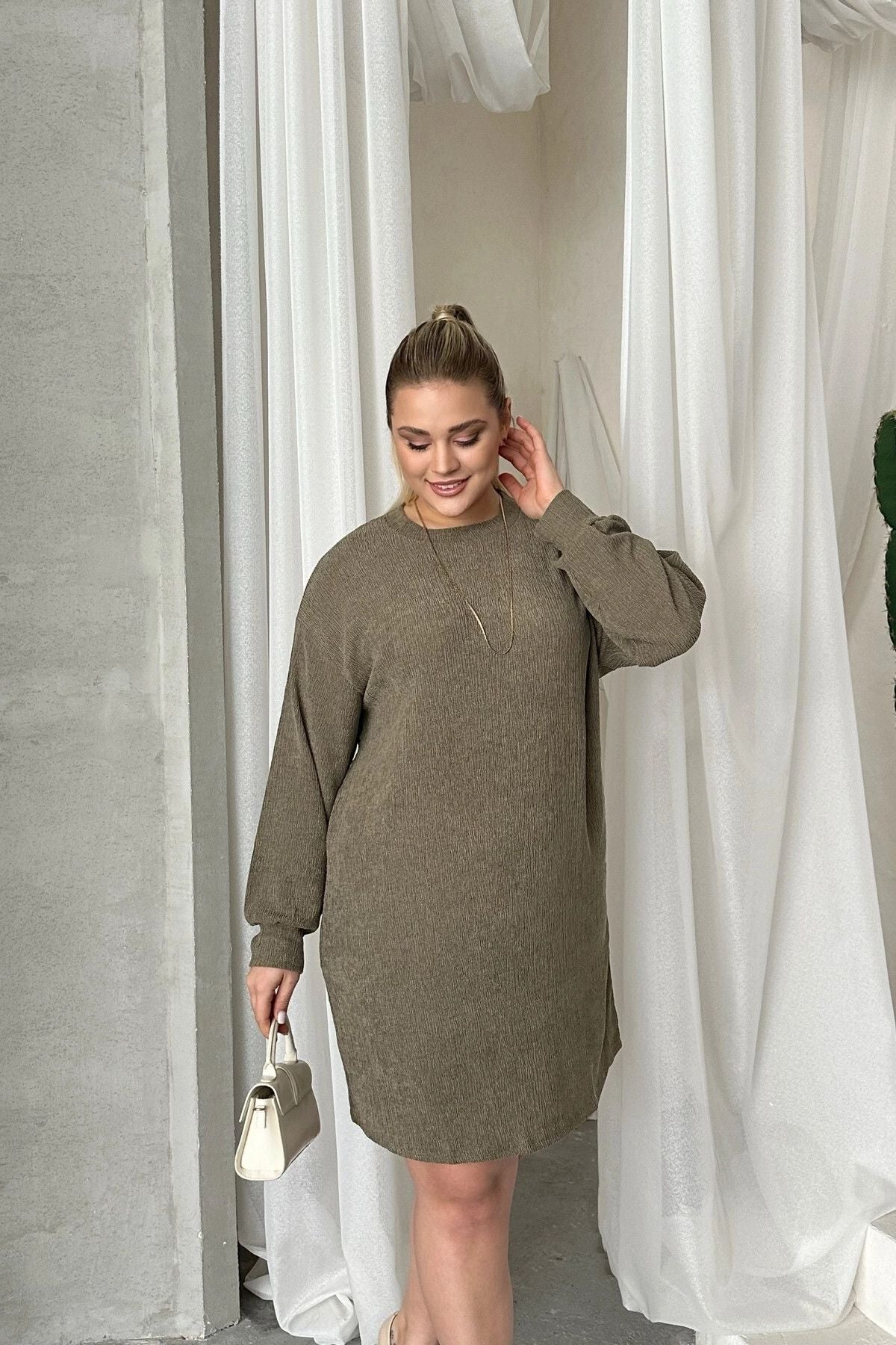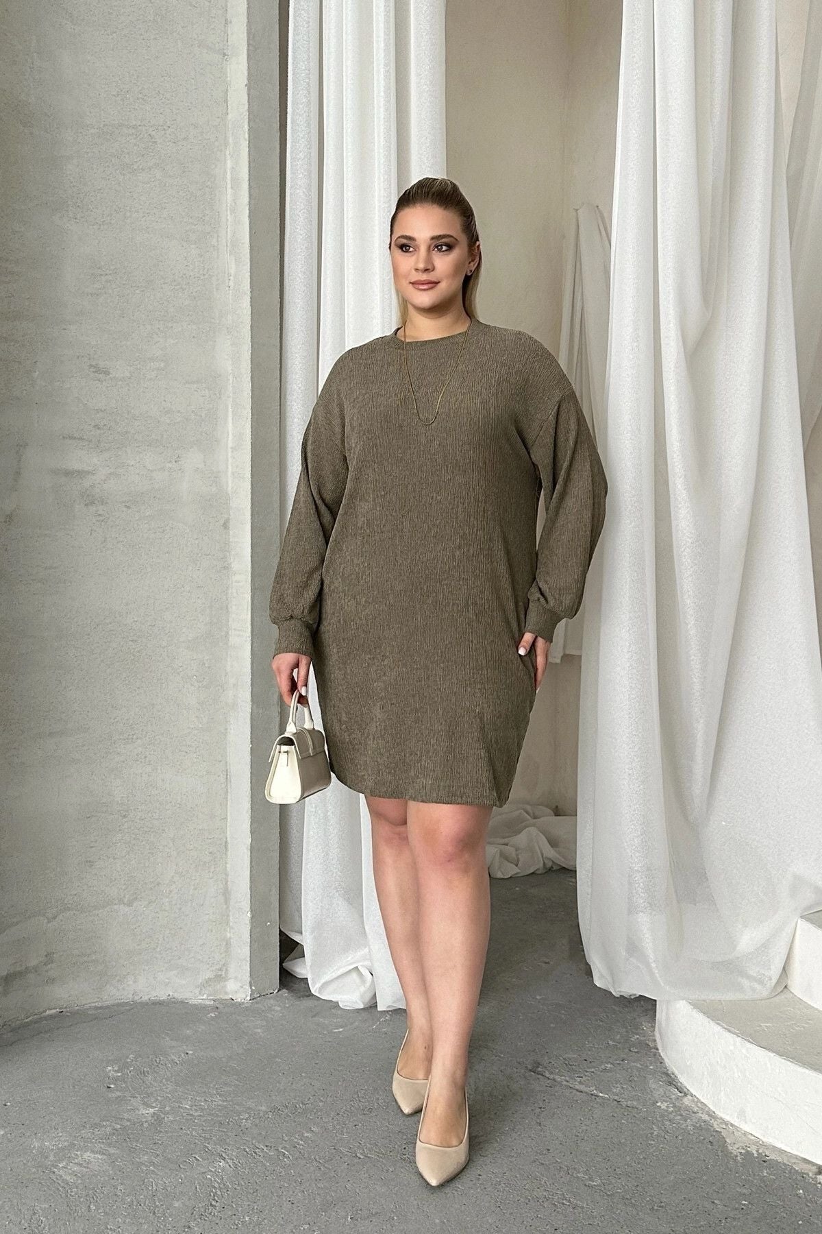 Büyük Beden Uzun Kollu Bisiklet Yaka Düz Kesim Elbise 100-190