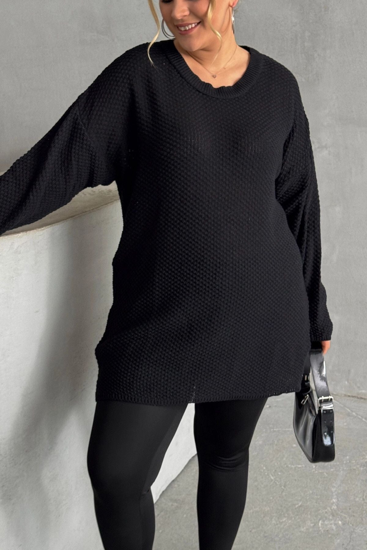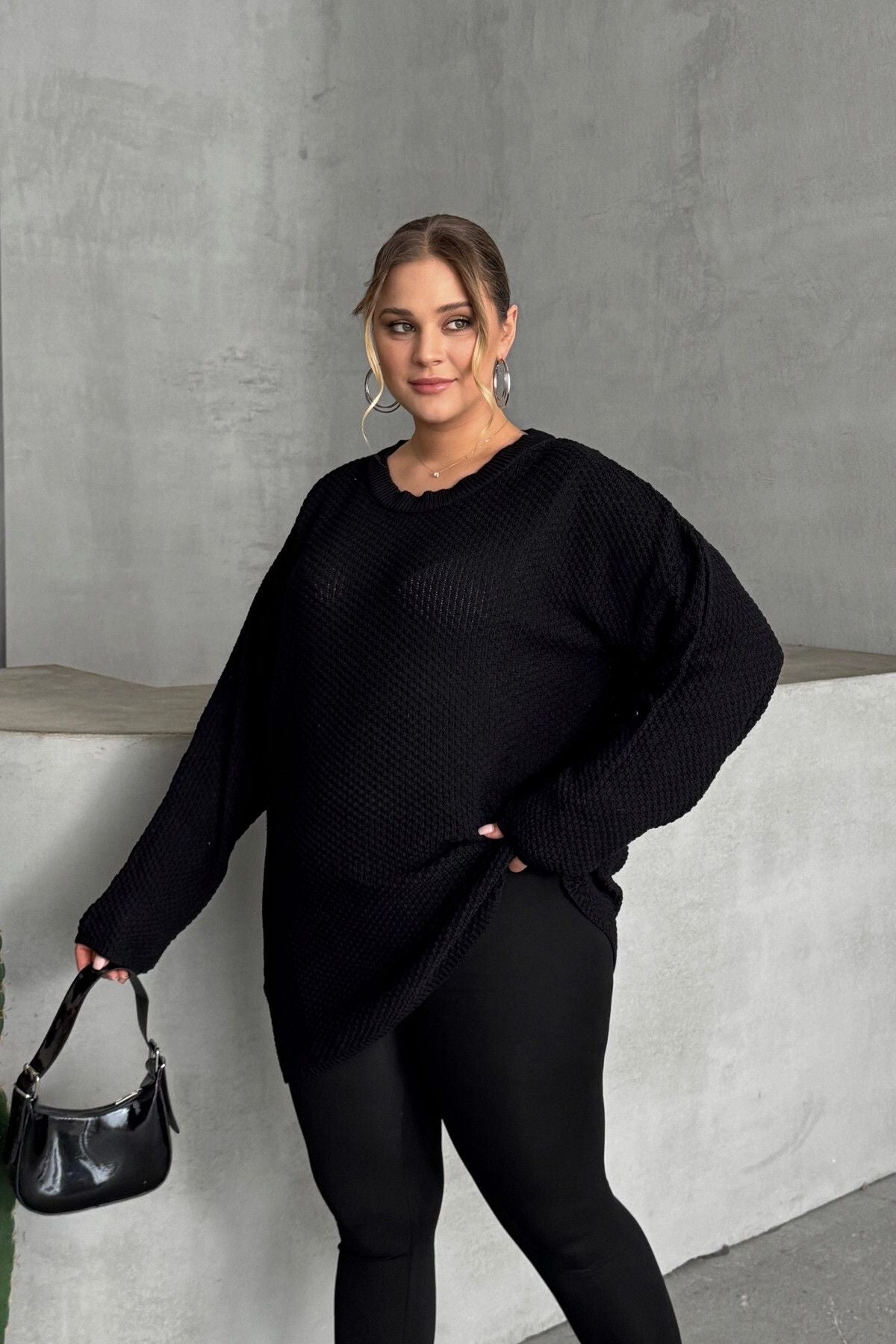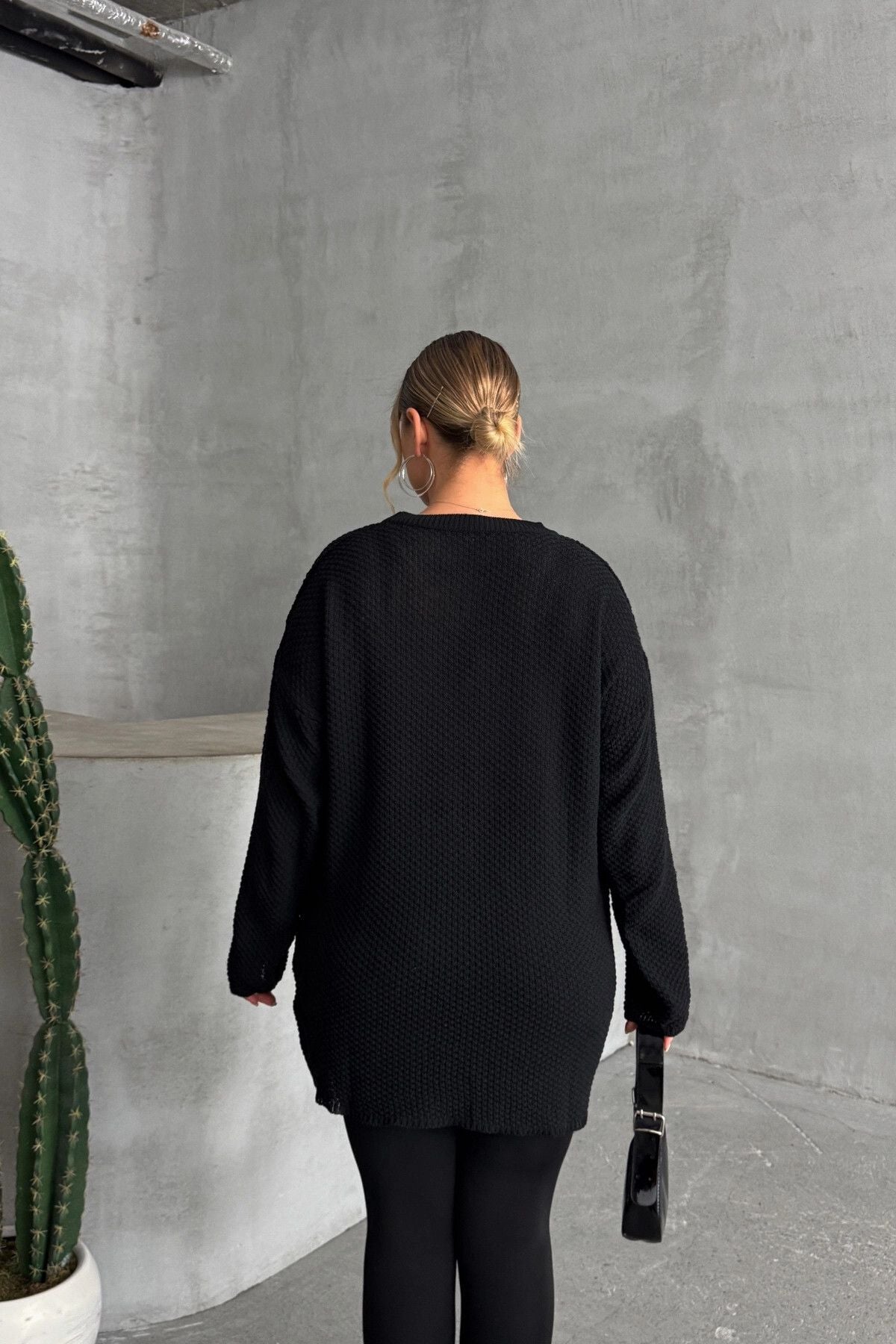 Model Detayı: Bisiklet yaka, uzun kollu, dokulu örgü, oversize kesim