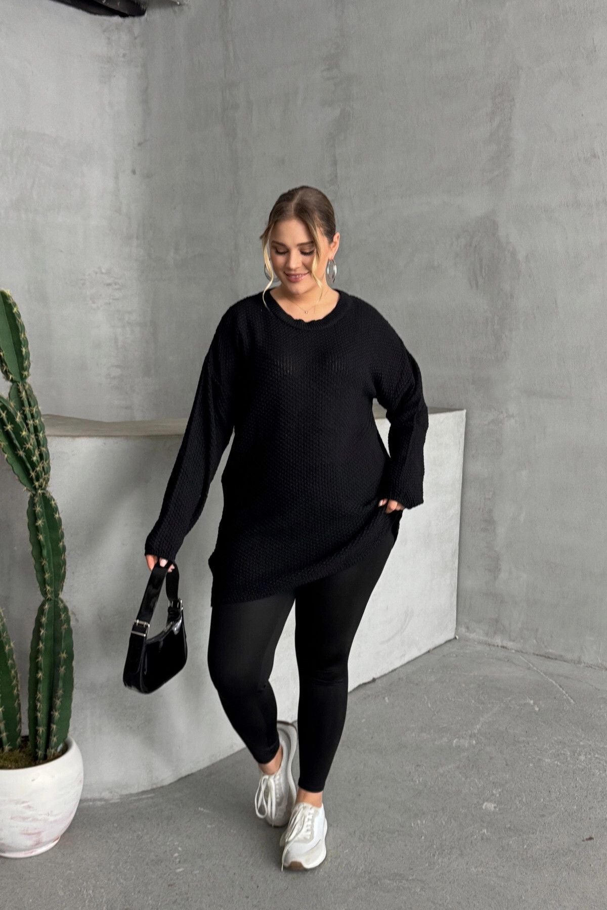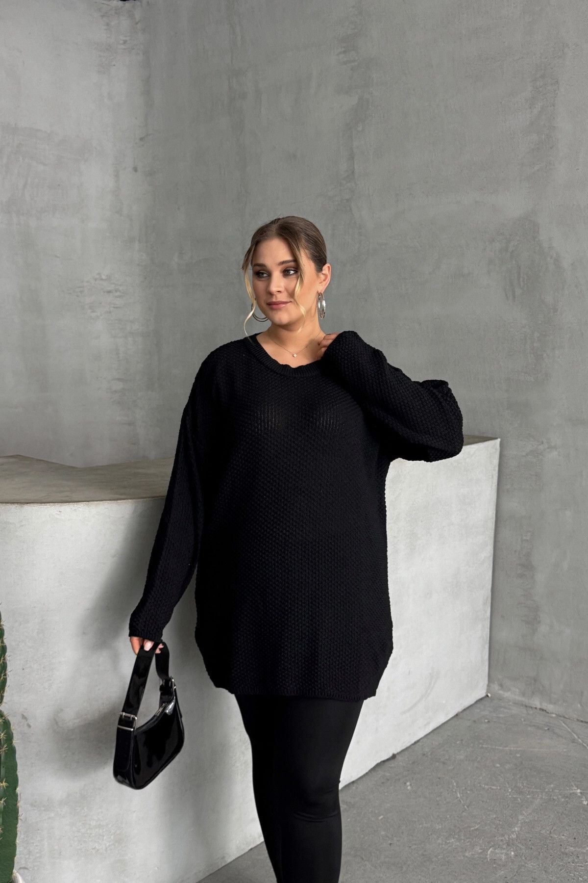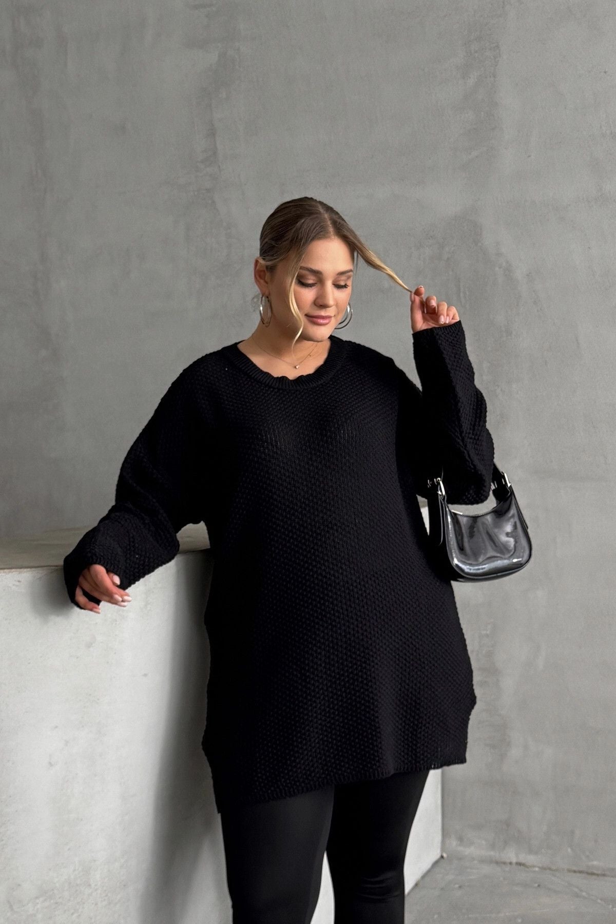 Model Detayı: Bisiklet yaka, uzun kollu, dokulu örgü, oversize kesim