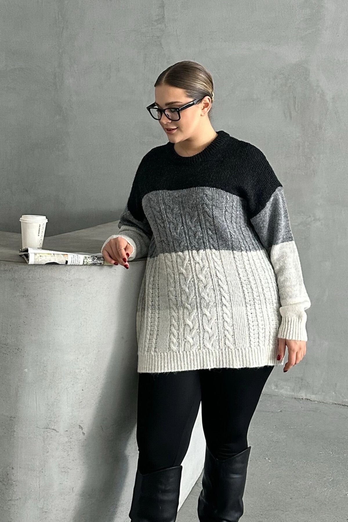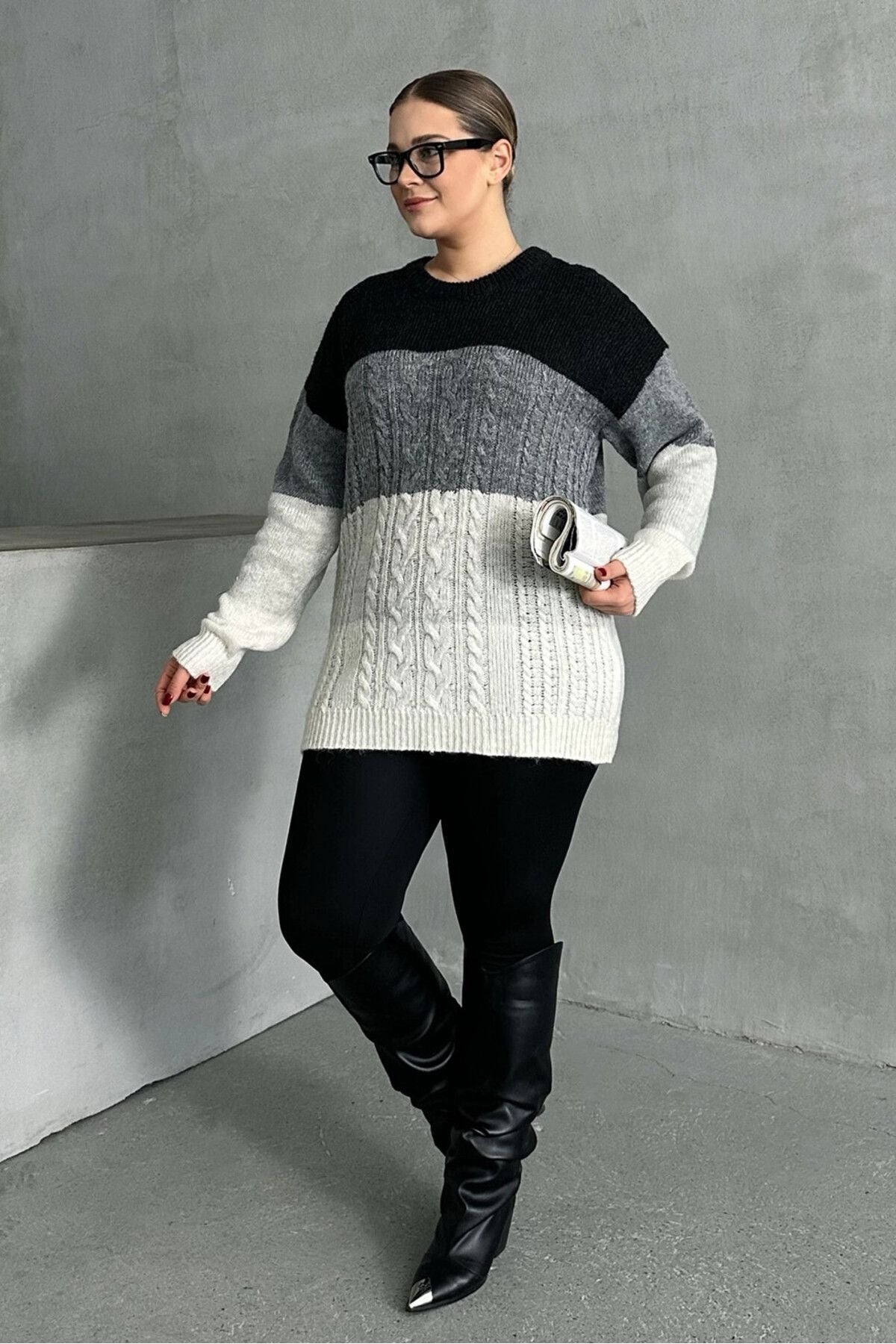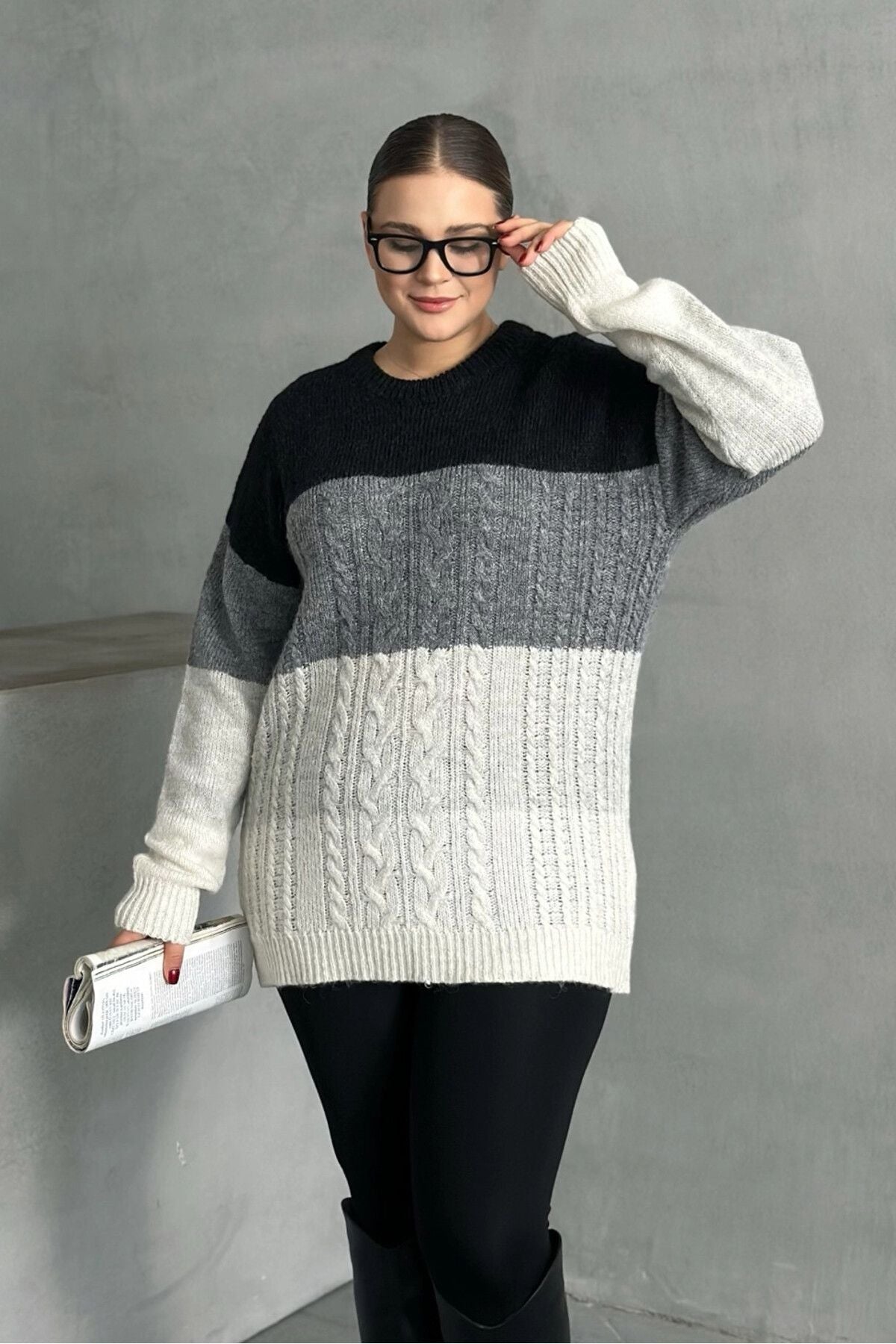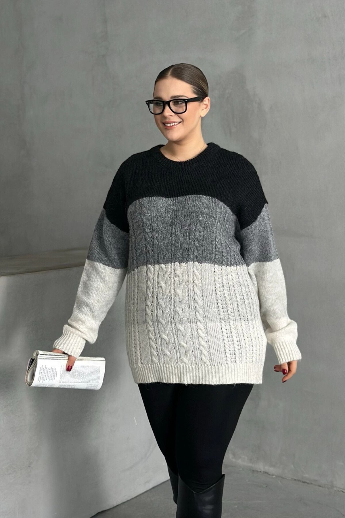 Konfor ve şıklığı bir araya getiren bu büyük beden triko kazak, uzun kollu ve bisiklet yaka tasarımıyla her ortamda kullanım için idealdir. Ombré geçişiyle oluşturulan sofistike desen, kazağa modern ve şık bir görünüm kazandırır. Yumuşak dokusu ve rahat oversize kesimi sayesinde gün boyu konfor sunarken, sade ve zarif görünümüyle kolayca kombinlenebilir. Siyah pantolon ve bot kombinasyonuyla mükemmel uyum sağlayan bu kazak, günlük ve casual şıklık için mükemmel bir seçim! Mevsim geçişlerinde de ideal olan bu parça, gardırobunuzun vazgeçilmez basic parçası olacak.