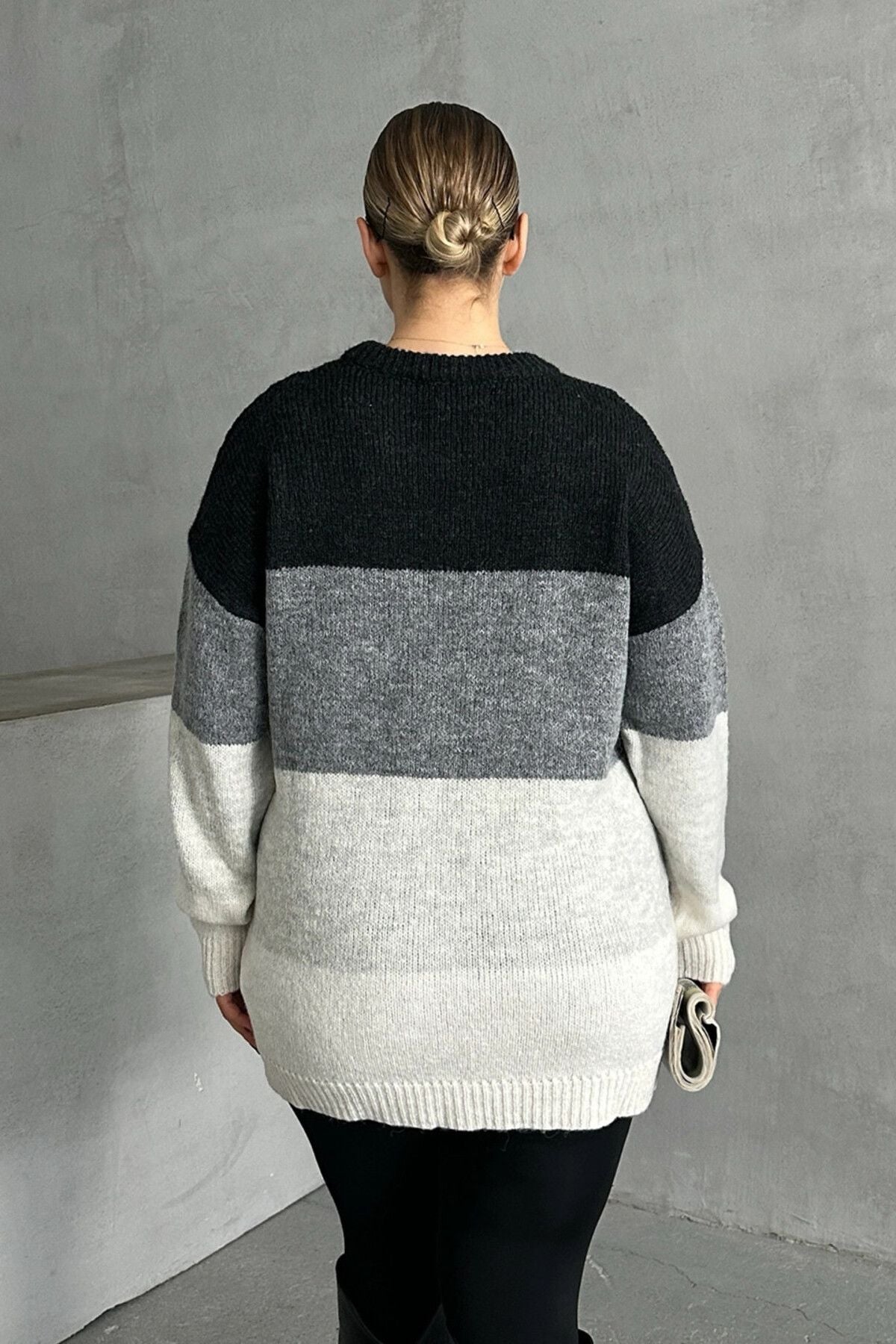 Model Detayı: Bisiklet yaka, uzun kollu, ombré geçişli desen, oversize kesim