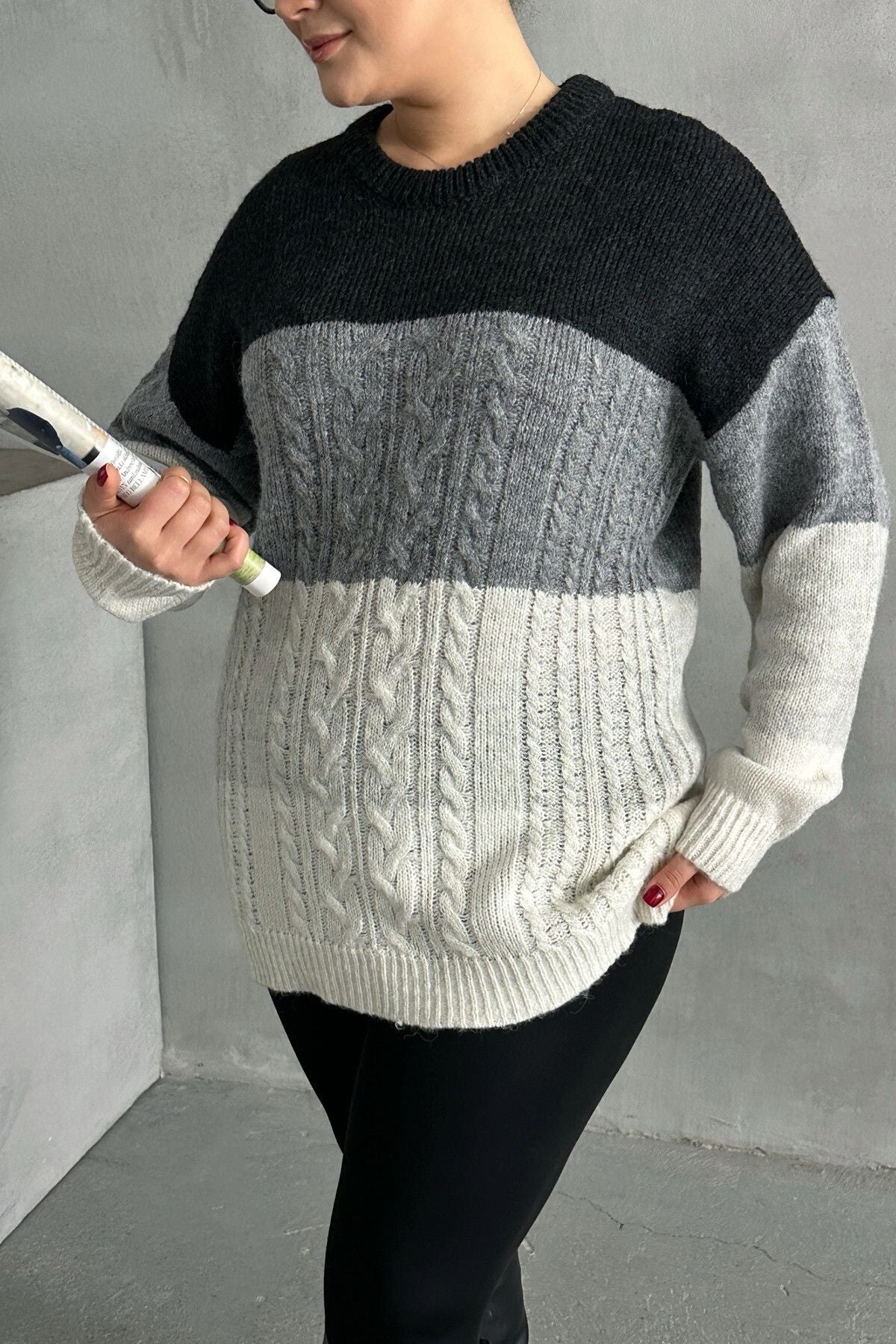 Büyük Beden Uzun Kollu Bisiklet Yaka Renk Bloklu Triko Kazak DG-04
