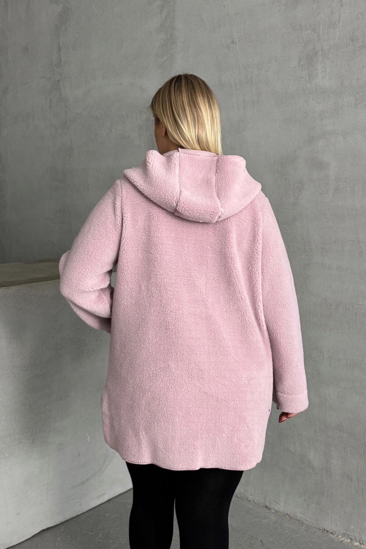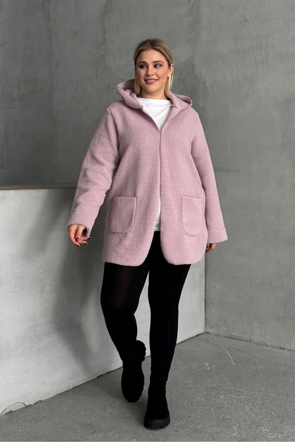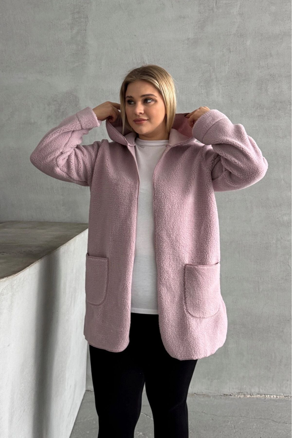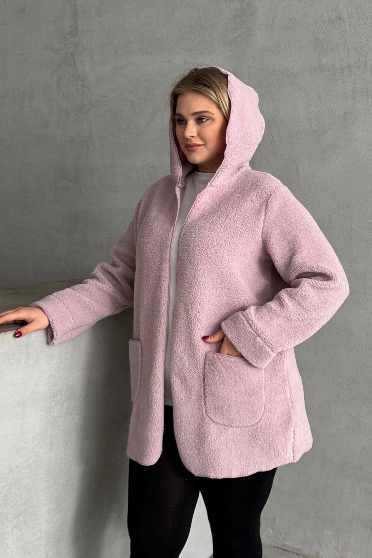 Büyük Beden Uzun Kollu Kapüşonlu Önü Kapamasız Cepli Peluş Ceket 97-14