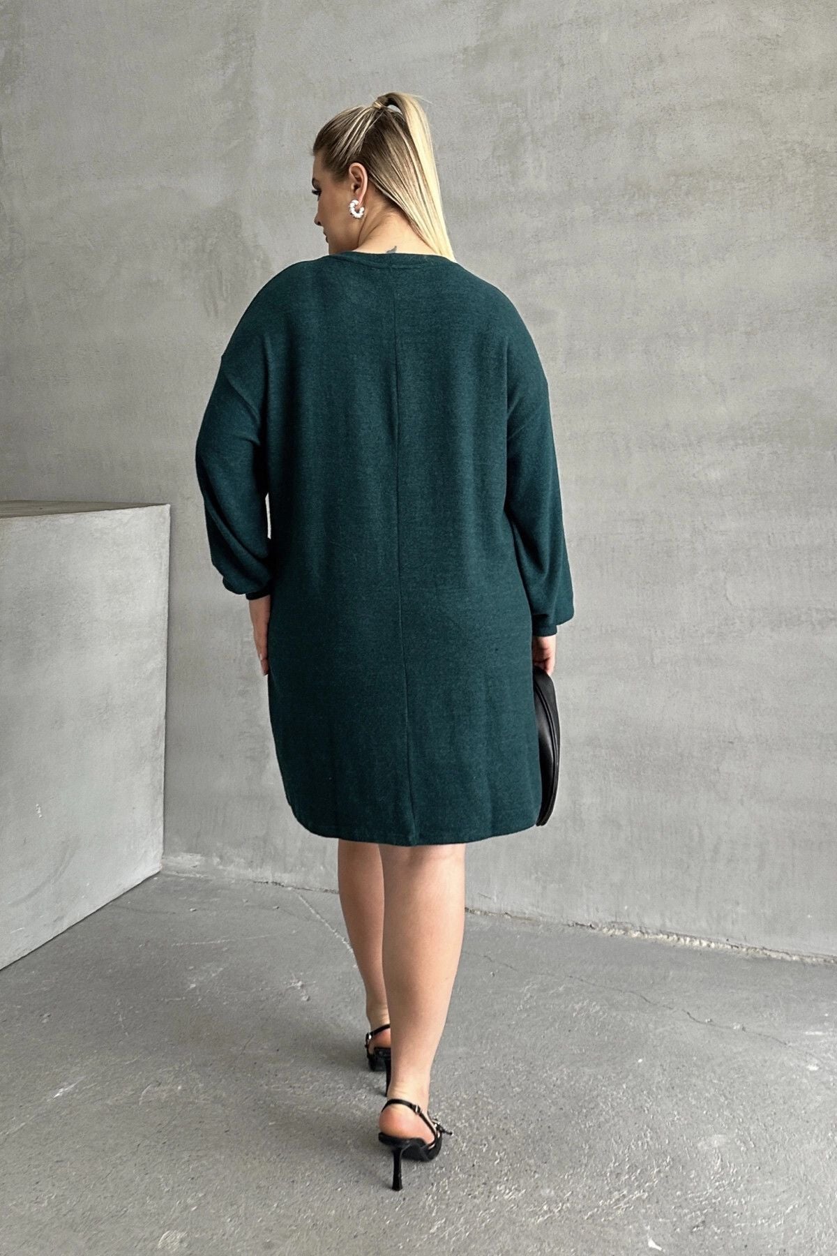 Sofistike zümrüt yeşili rengiyle dikkat çeken bu elbise, göğüs kısmındaki geometrik taş işlemeli detayıyla zarafeti yeni boyutlara taşıyor. Bisiklet yaka kesimi klasik bir görünüm sunarken, uzun kollu tasarımı mevsim geçişlerinde ideal kullanım sağlar. Taş detayları ışık altında büyüleyici parıltılar yaratarak elbiseye lüks bir dokunuş katar. Midi boyu ile kadınsı bir siluet oluştururken, rahat kalıbı gün boyu konfor sunar. Hem iş hayatında hem de özel davetlerde tercih edilebilecek bu şık parça, siyah topuklu ayakkabı ve minimal aksesuarlarla mükemmel bir görünüm sağlar. Makinede yıkanabilir özelliği ile bakımı kolay olan bu elbise, gardırobunuzun vazgeçilmez bir parçası olacak.