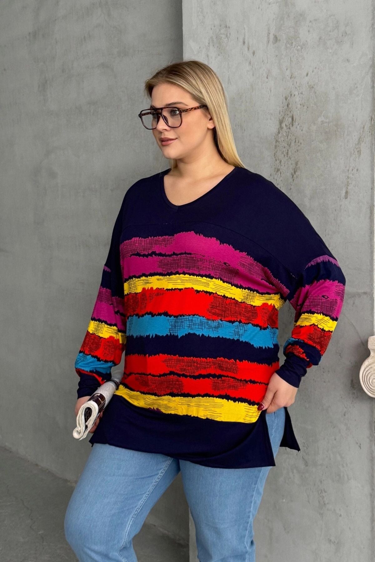 Büyük Beden V Yaka Çizgili Yanları Yırtmaçlı Uzun Kollu Bluz 303118