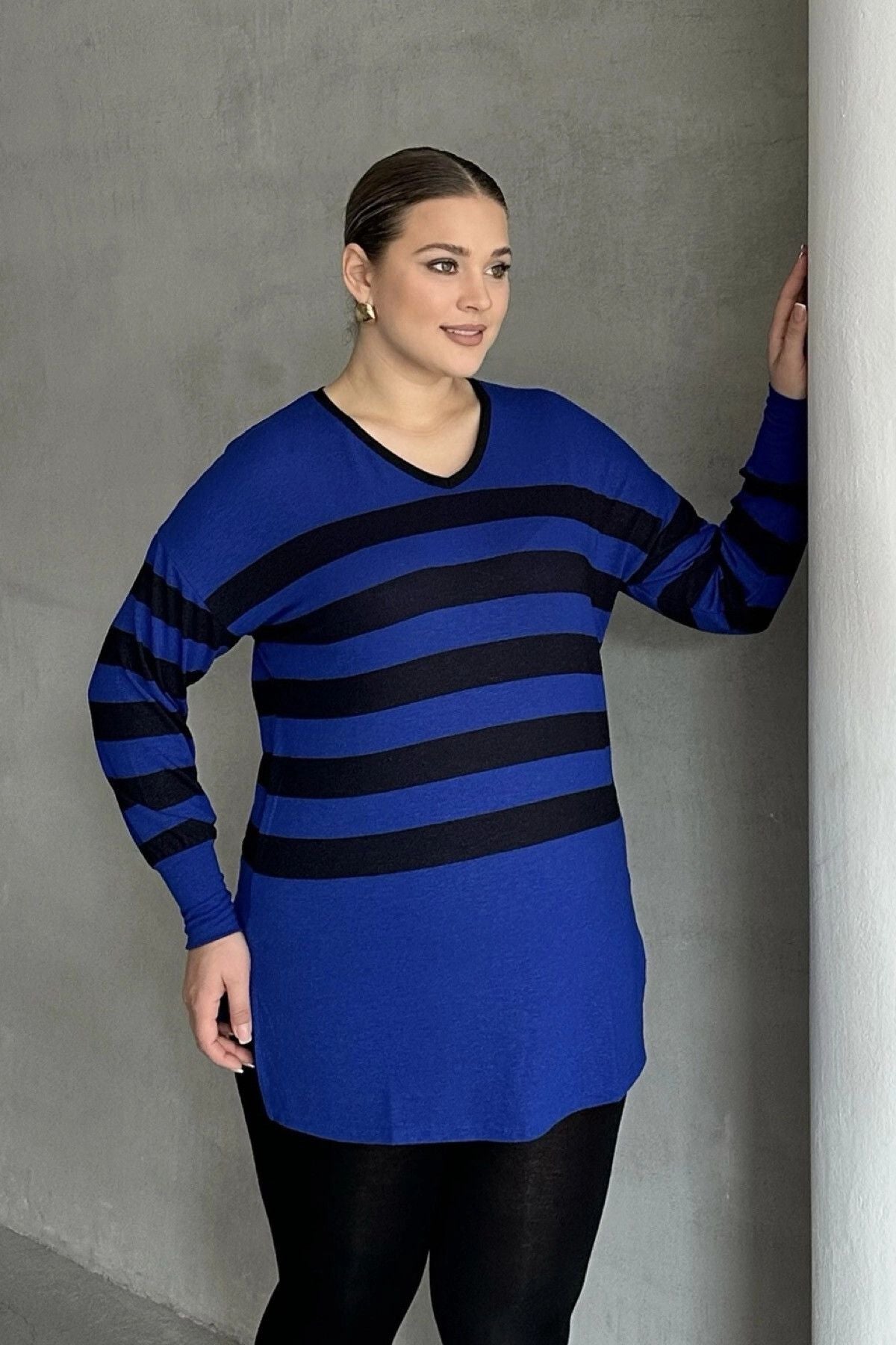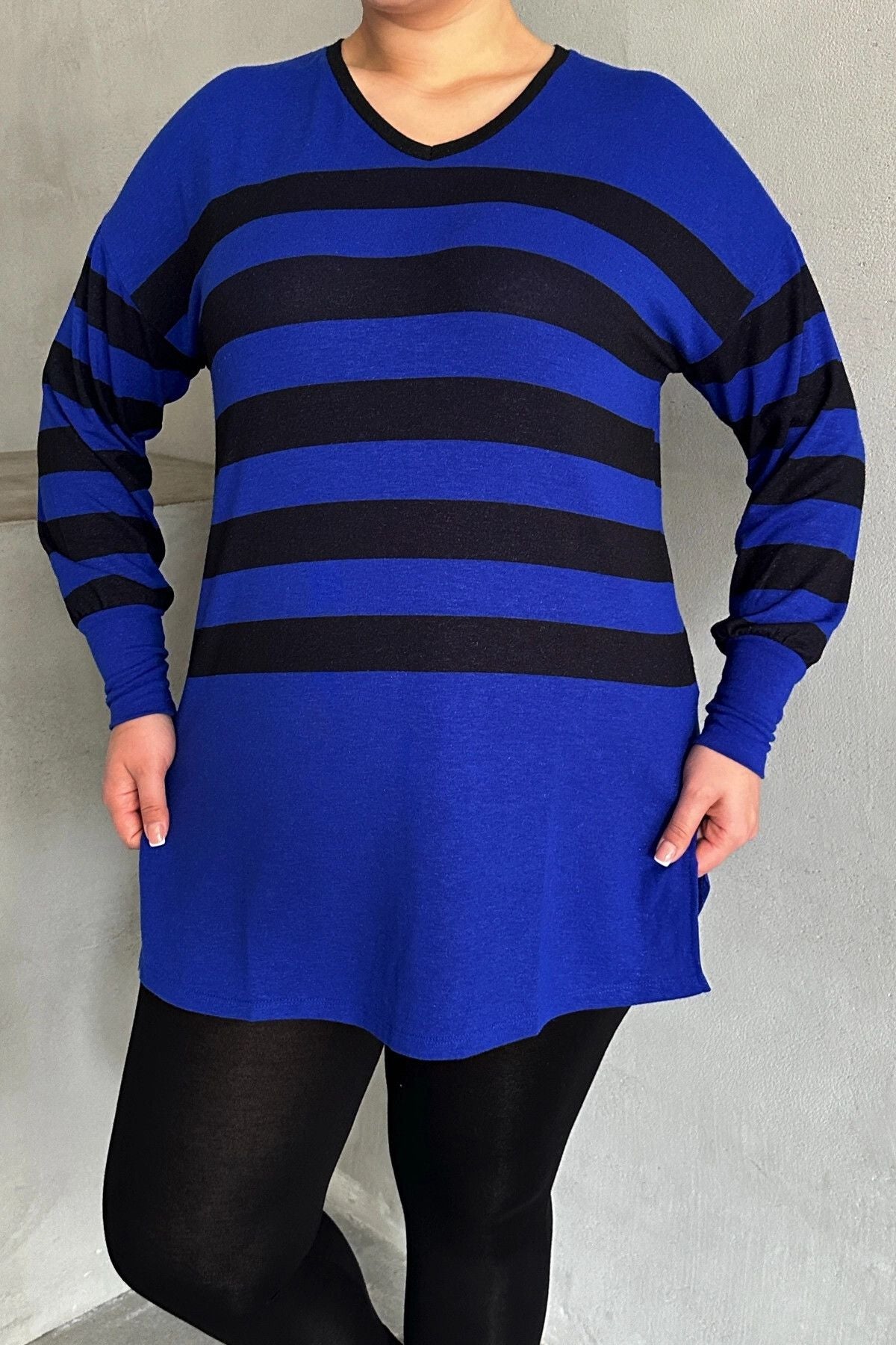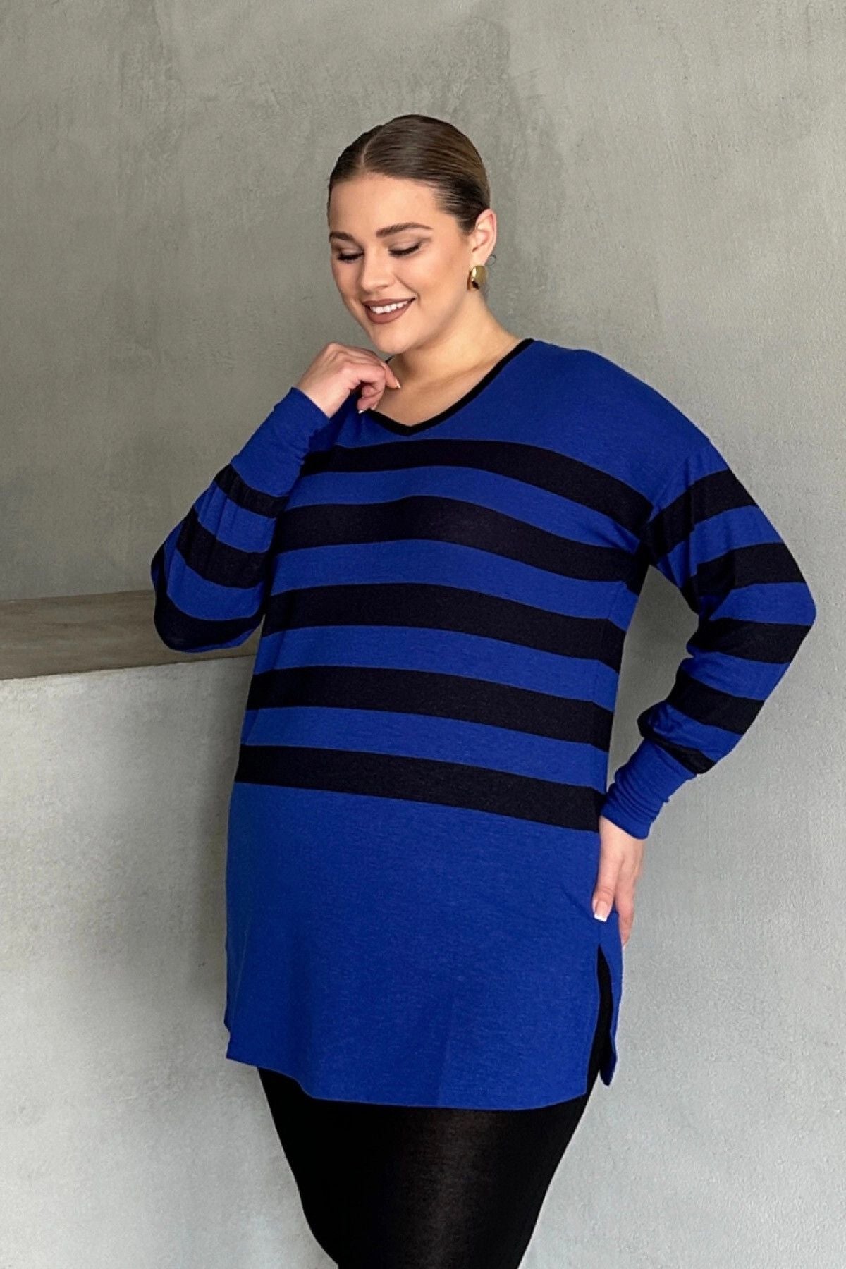 Büyük Beden V Yaka Çizgili Yırtmaç Detaylı İnce Kumaşlı Uzun Bluz 301567