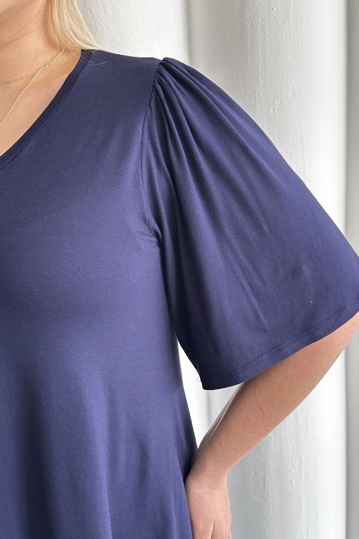 Model Detayı: V Yaka, Kısa Melek Kol, Asimetrik Kesim