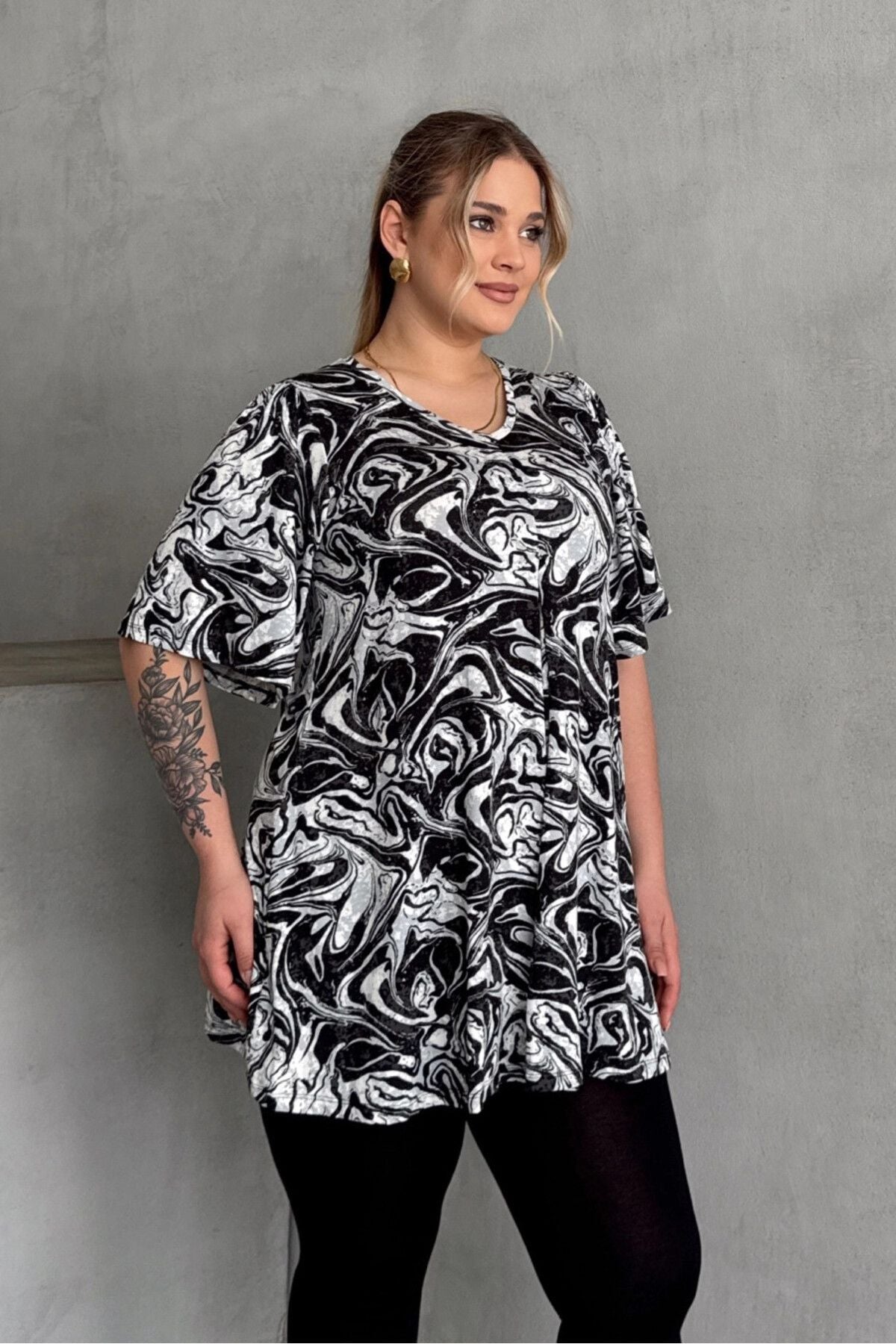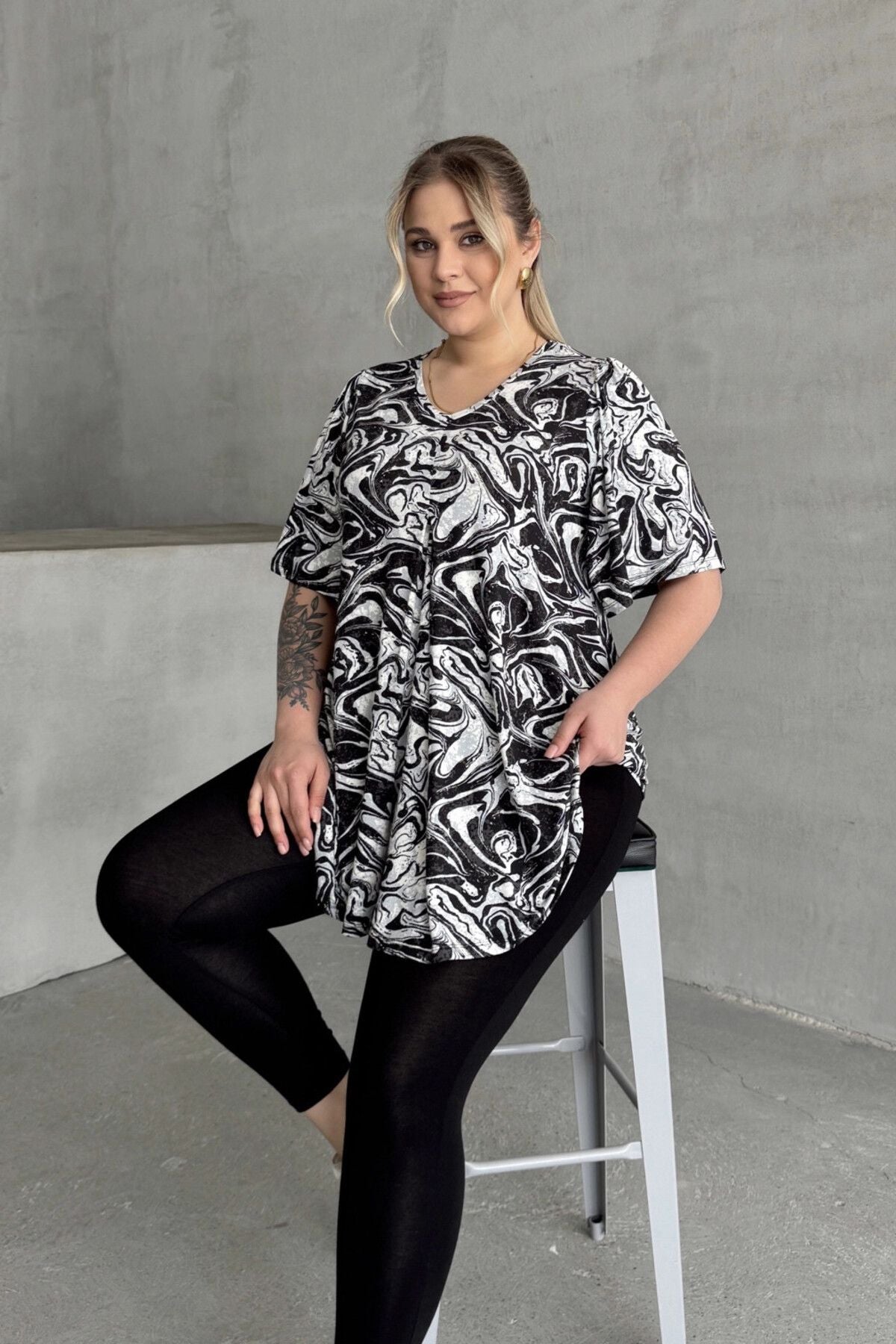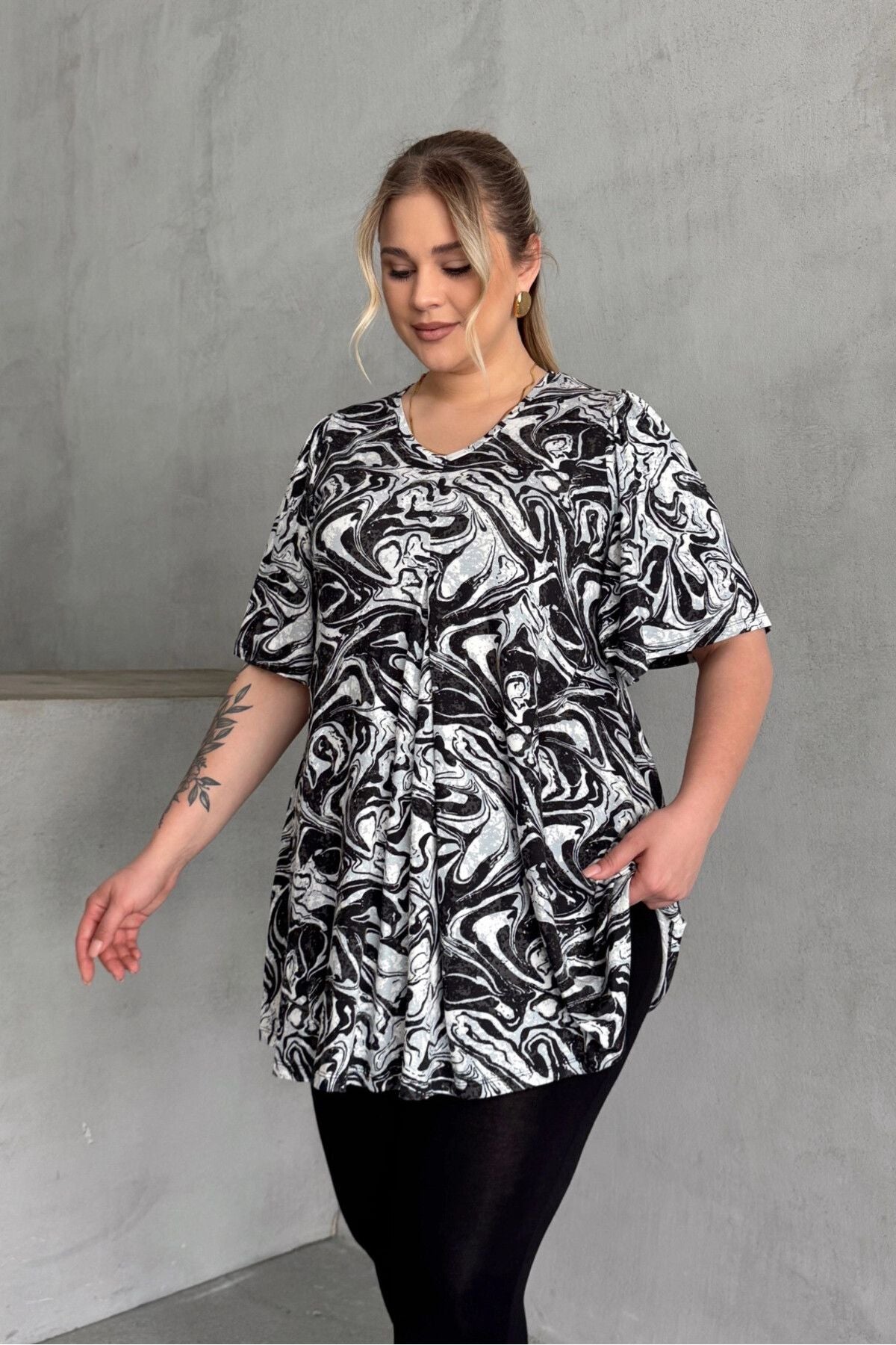 Büyük Beden V Yaka Kısa Kollu Eteği Bollaşan Desenli Bluz 101-17