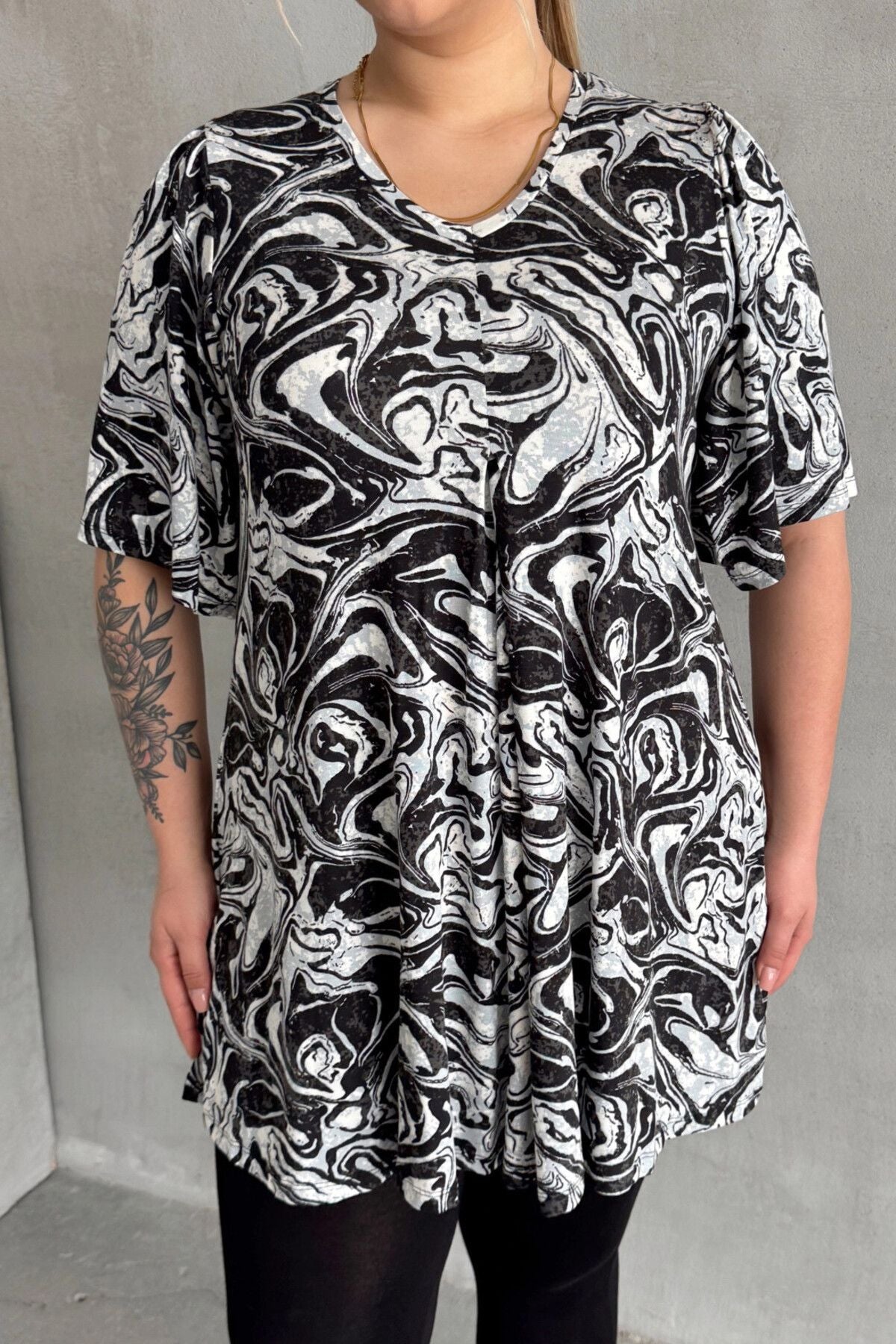 Model Detayı: V Yaka, Kısa Kollu, Eteği Bollaşan, Ebruli Desenli Bluz