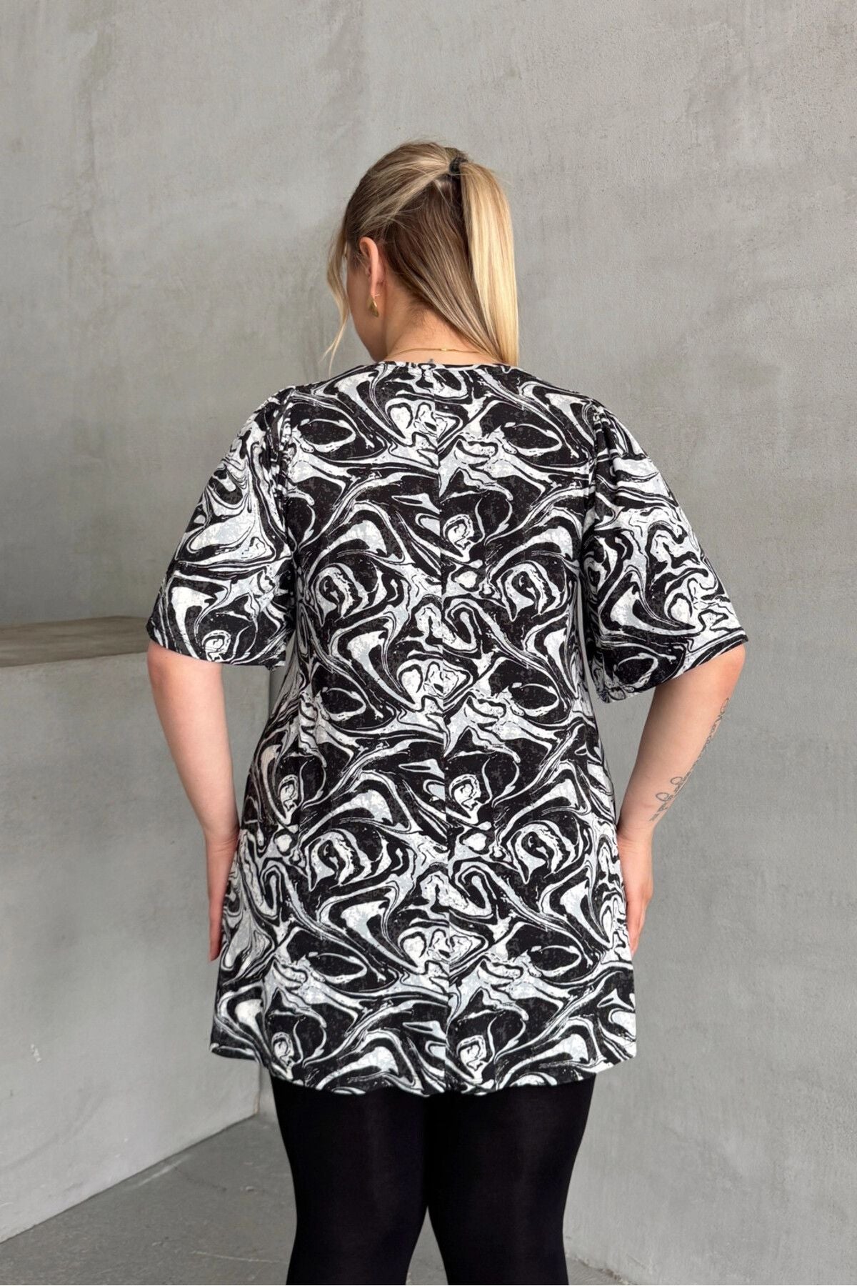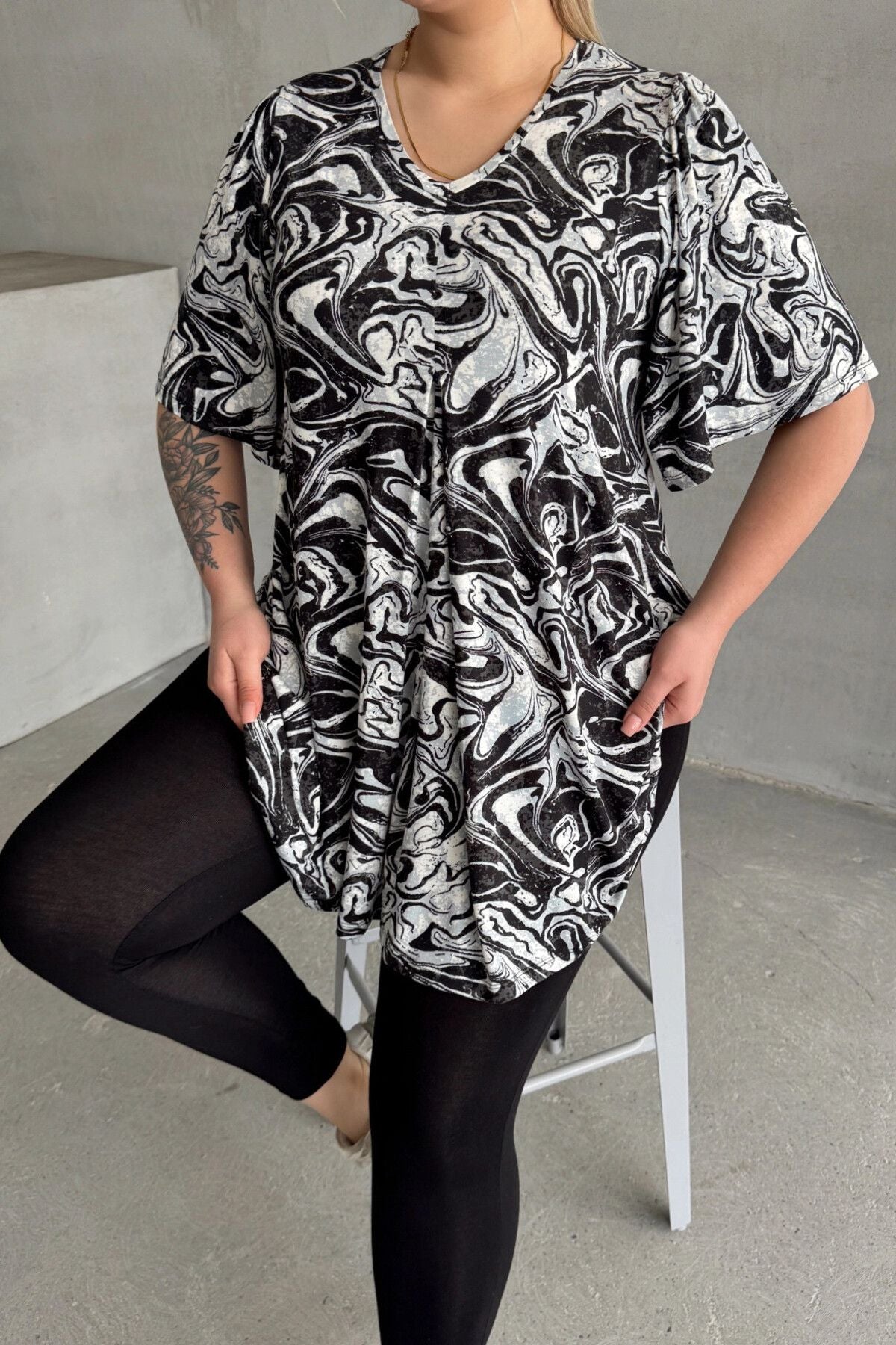 Moda Notu: Ebruli deseninin sanatsal dokunuşunu yansıtan bu bluz, V yaka detayı ve salaş kesimiyle hem rahat hem de iddialı bir stil sunuyor. Tayt veya dar paça pantolonlarla kombinleyerek günlük şıklığınıza dinamik bir dokunuş katabilirsiniz.