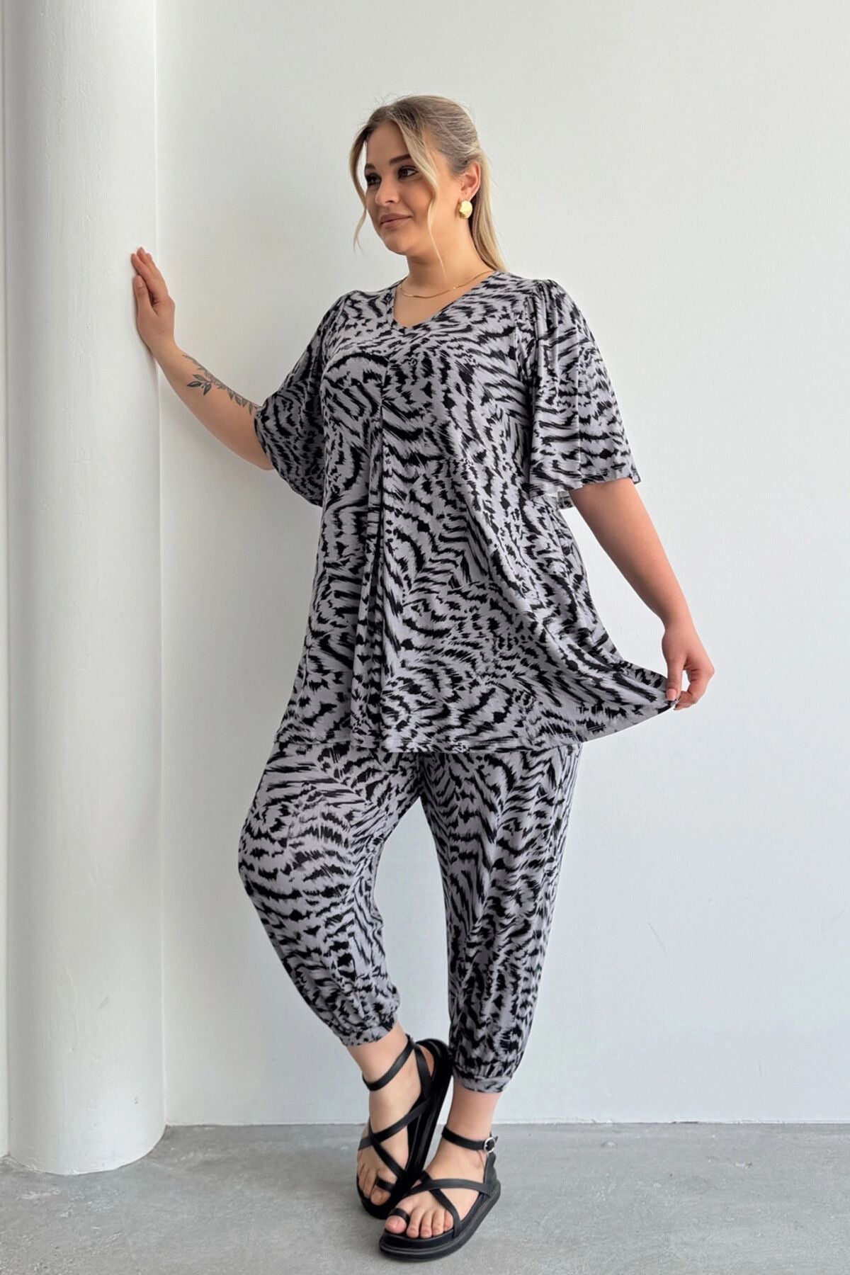 Büyük Beden V Yaka Kısa Kollu Eteği Bollaşan Desenli Bluz 99-5