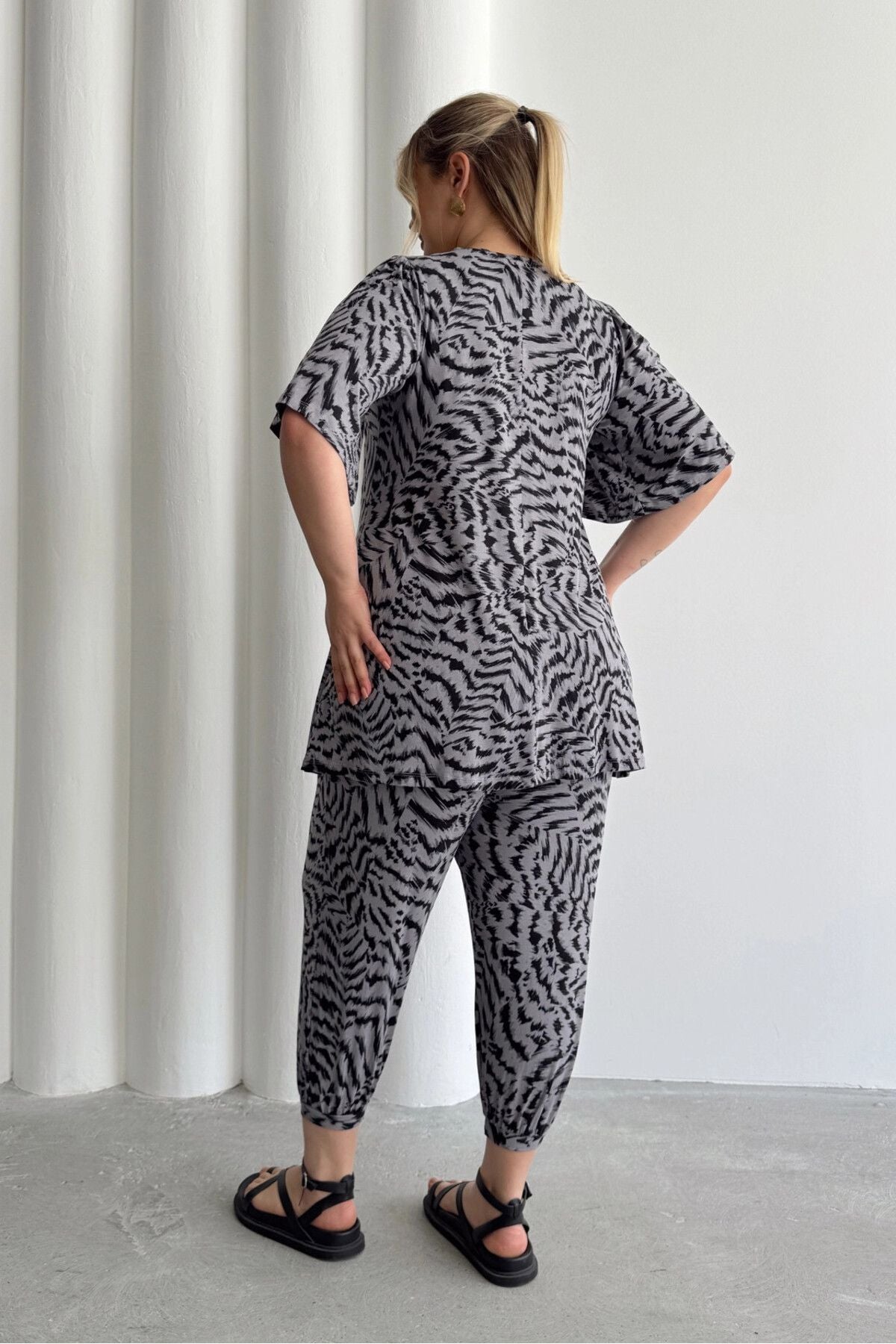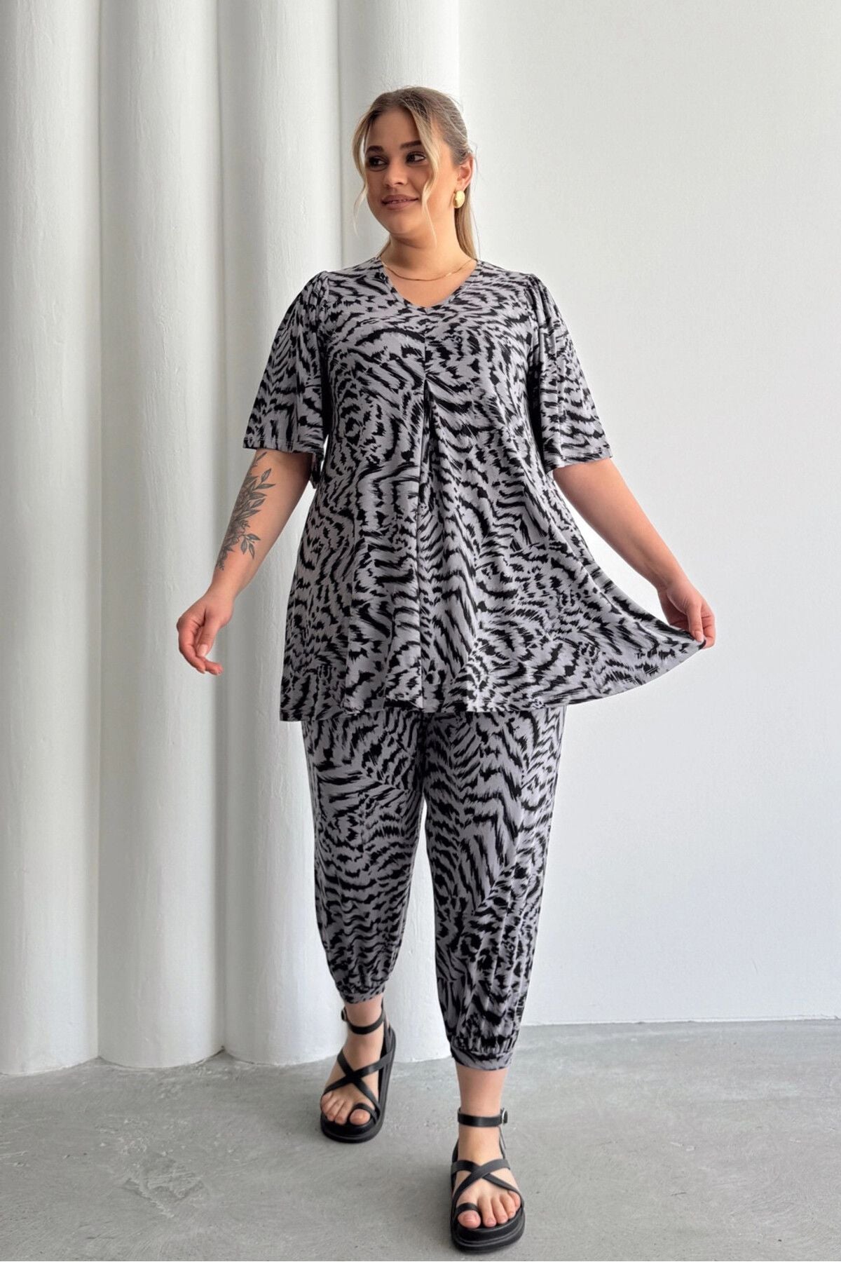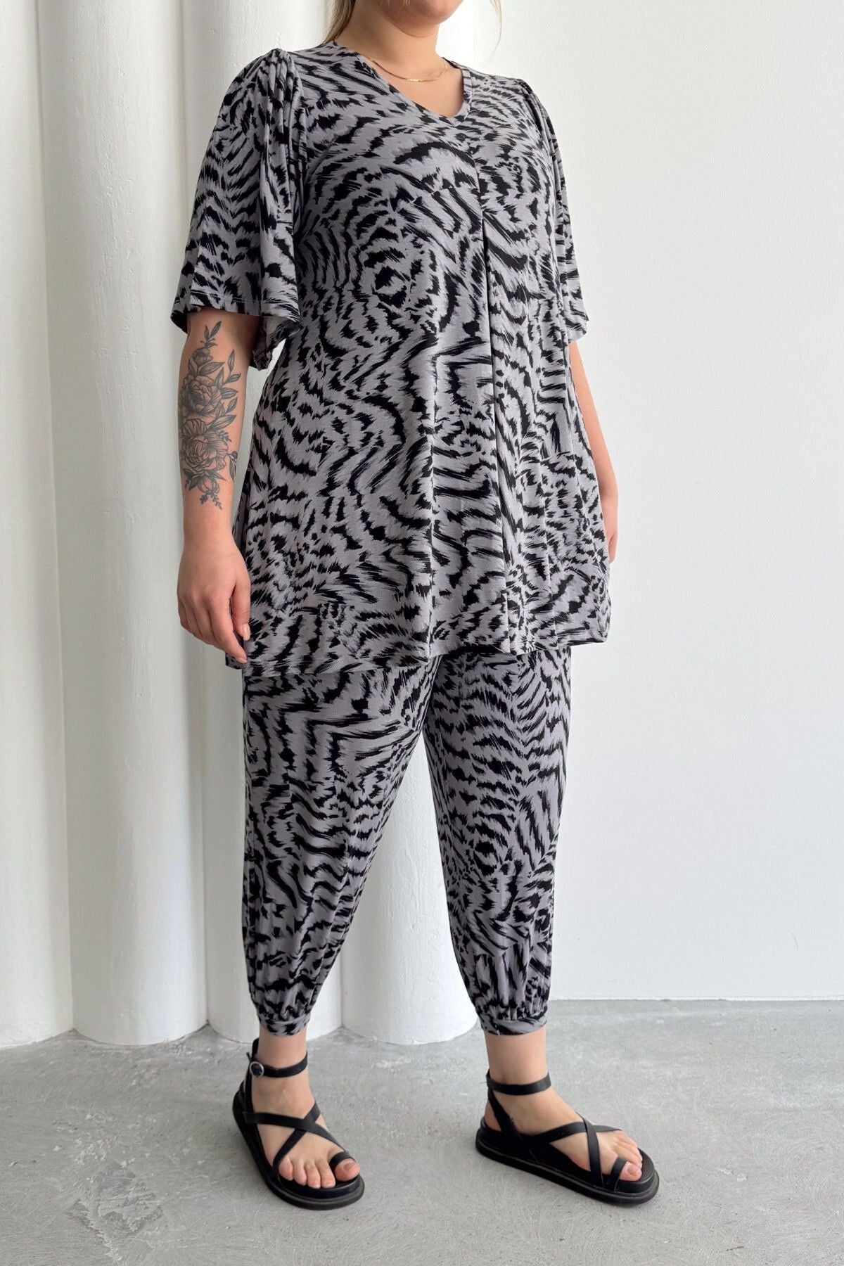 Moda Notu: Zebra deseninin enerjisini yansıtan bu bluz, V yaka detayı ve salaş kesimiyle hem rahat hem de iddialı bir stil sunuyor. Tayt veya dar paça pantolonlarla kombinleyerek günlük şıklığınıza dinamik bir dokunuş katabilirsiniz.