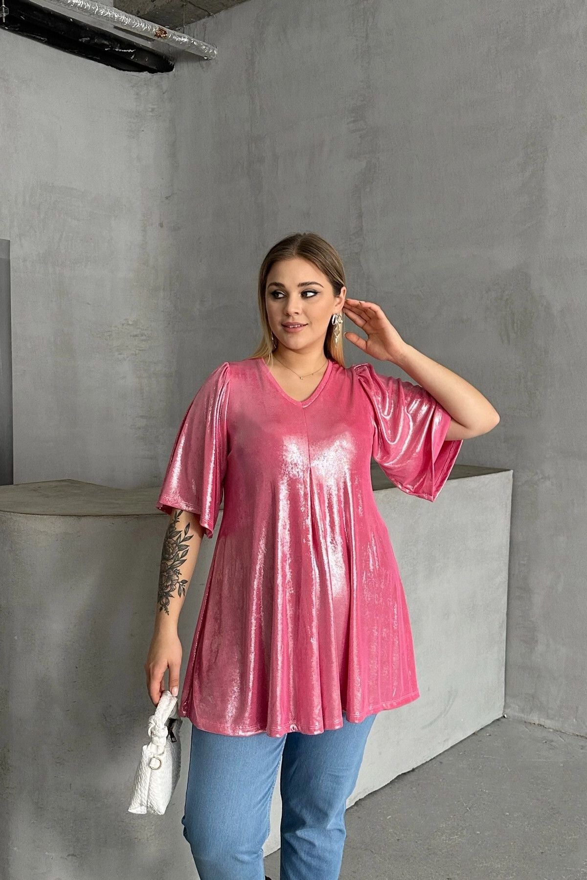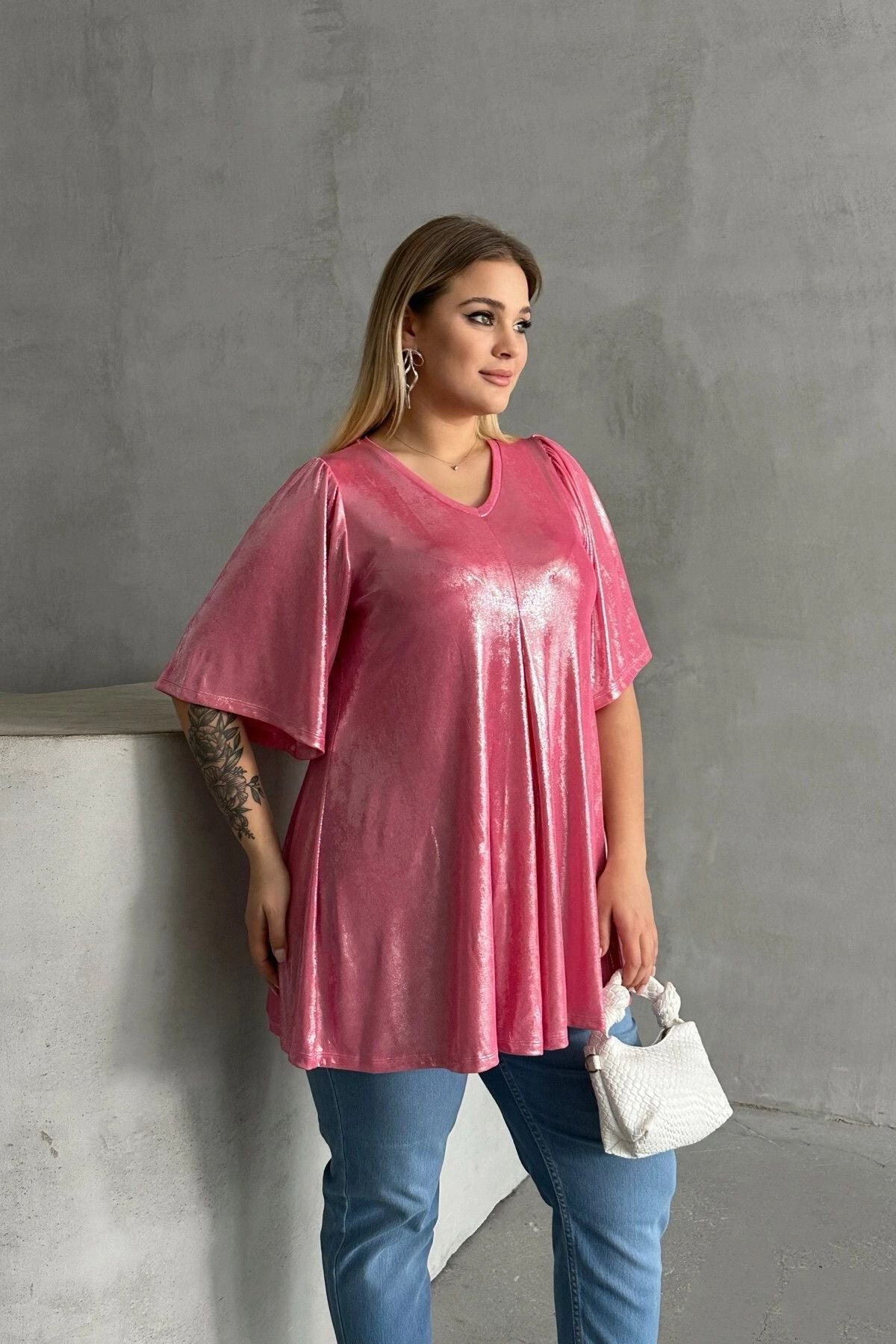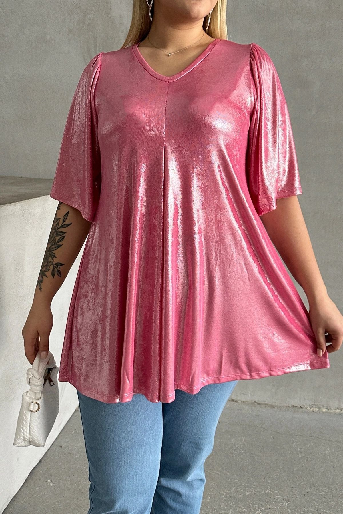 Model Detayı: V Yaka, Kısa Kollu, Parlak Görünümlü, Salaş Bluz