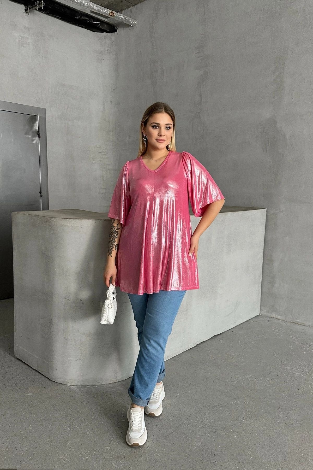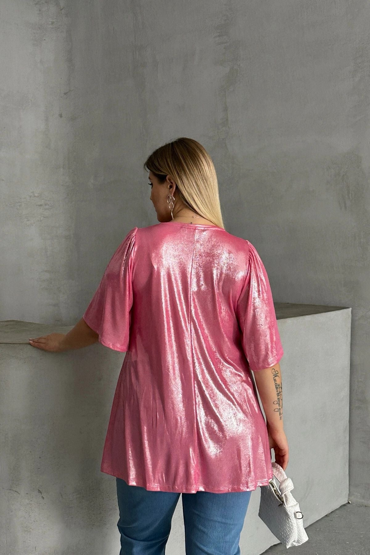 Moda Notu: Göz alıcı parlaklığıyla dikkat çeken bu salaş bluz, hem gündüz hem de gece kombinlerinize ışıltı katacak. Tayt veya dar paça pantolonlarla kombinleyerek zahmetsiz ve şık bir stil yaratabilirsiniz.