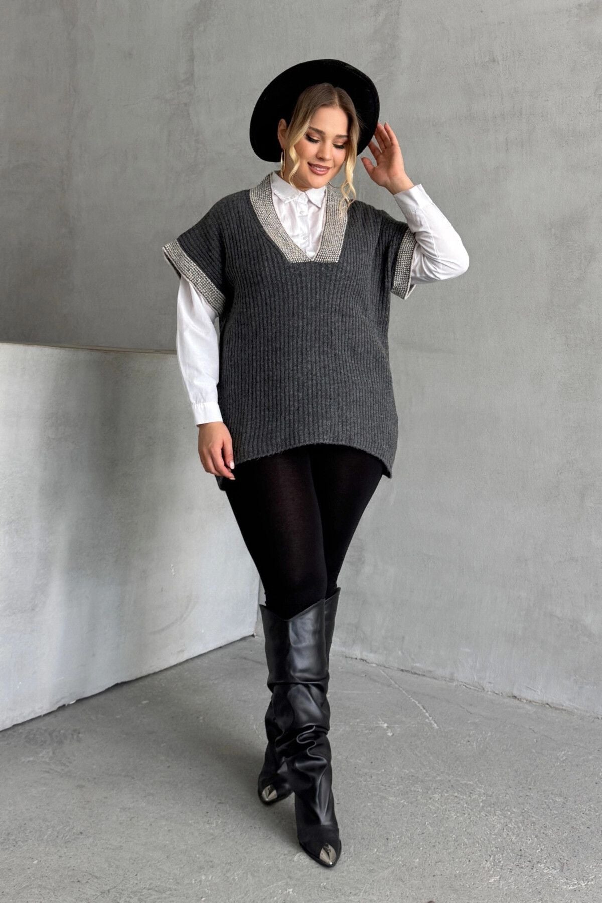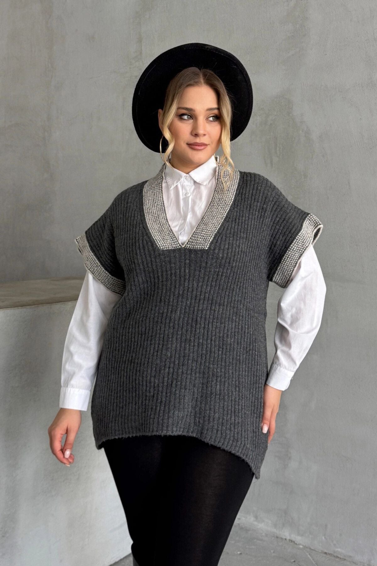 Büyük Beden V Yaka Kısa Kollu Triko Süveter 302138