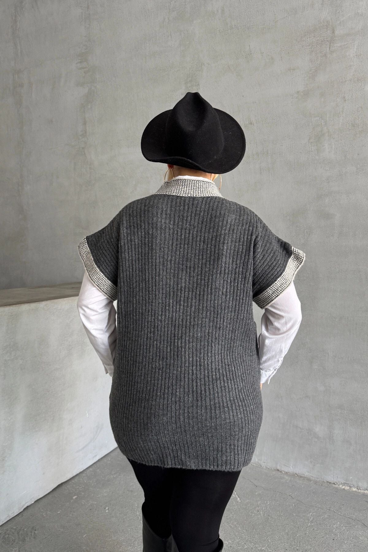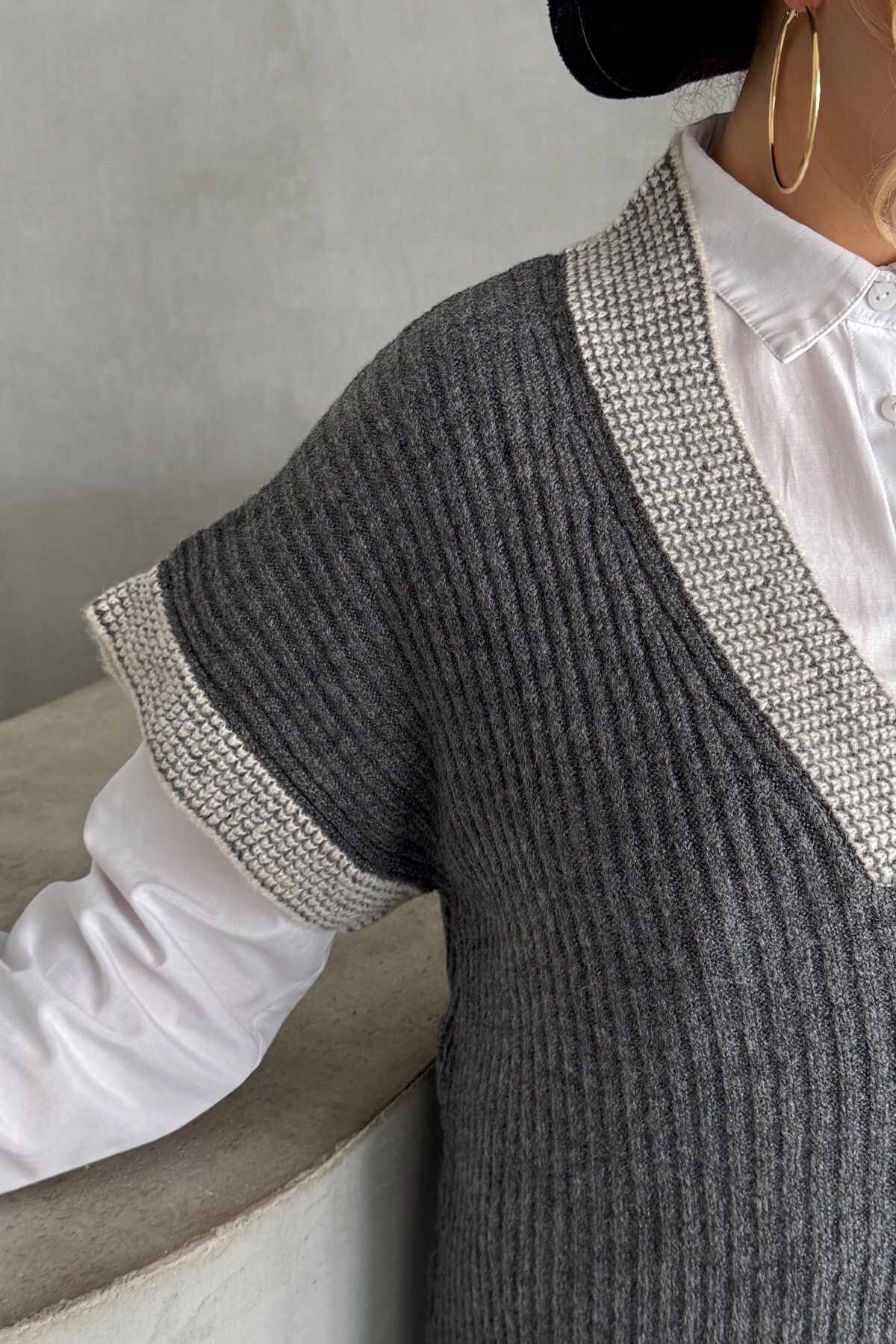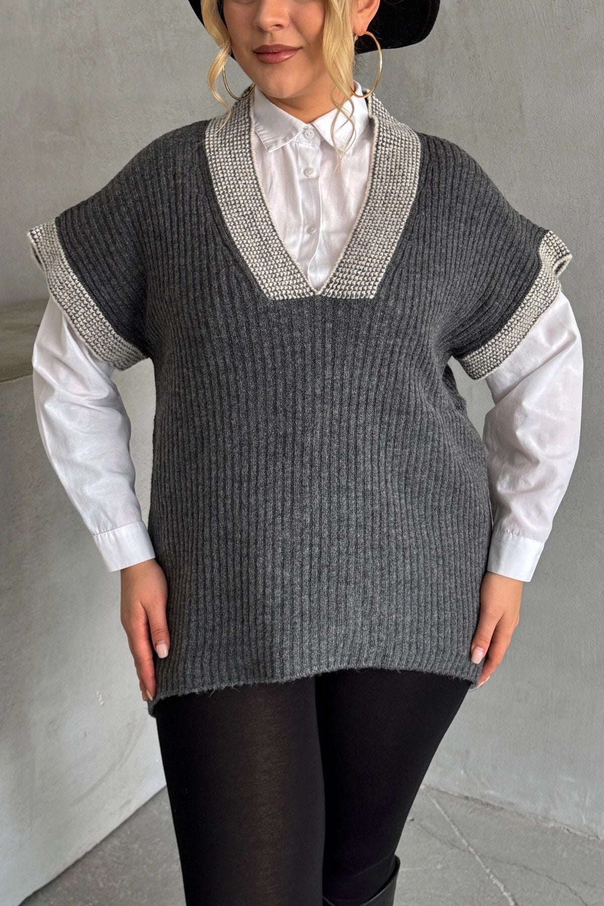 Model Detayı: V Yaka, Kısa Kol, Yaka ve Kol Kenarları İşleme Desenli Triko Süveter