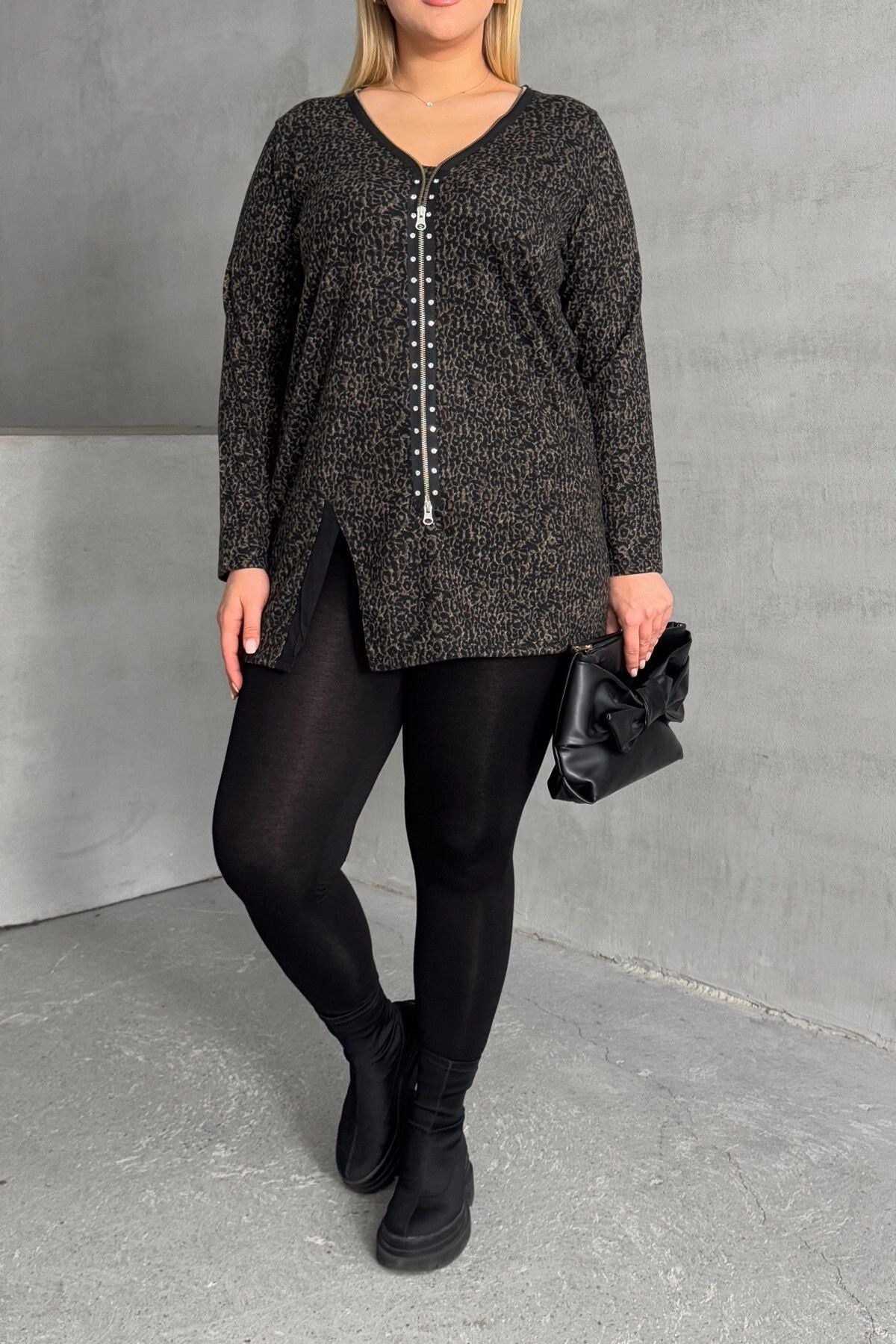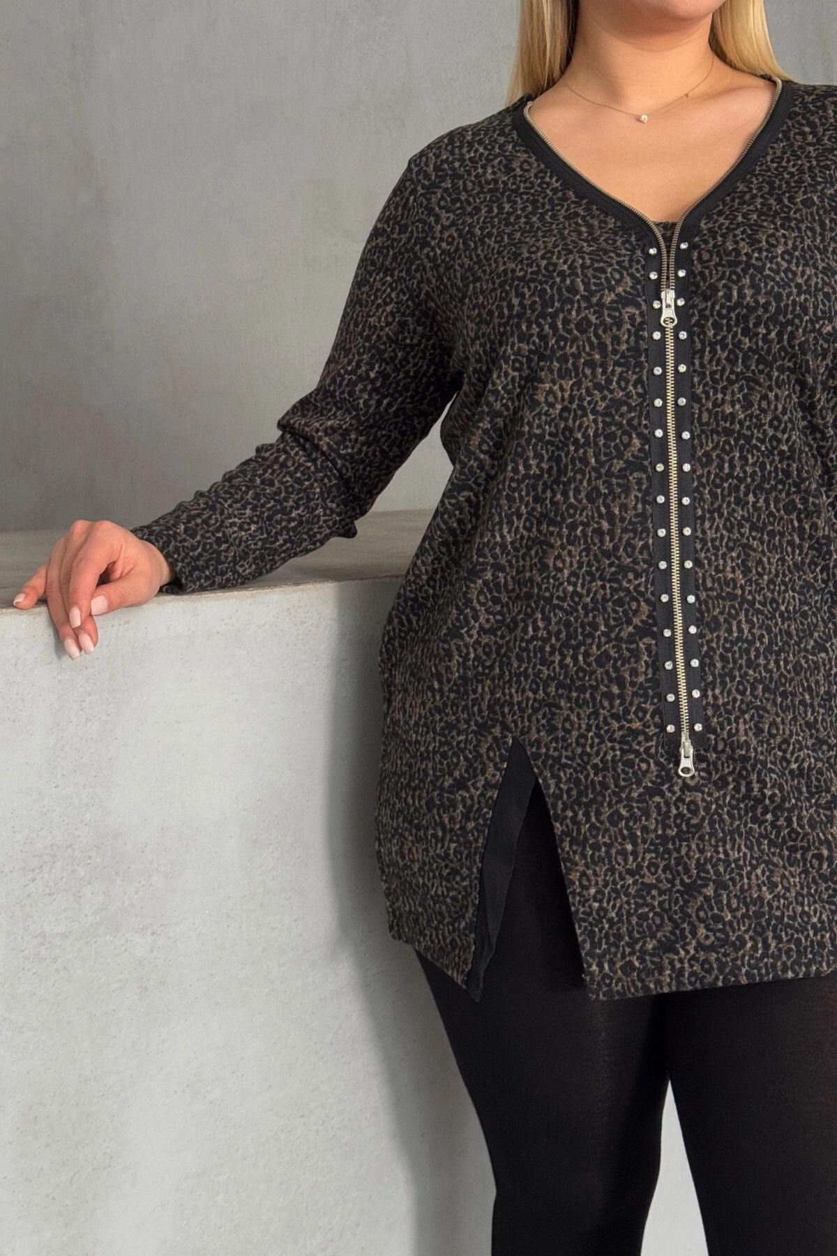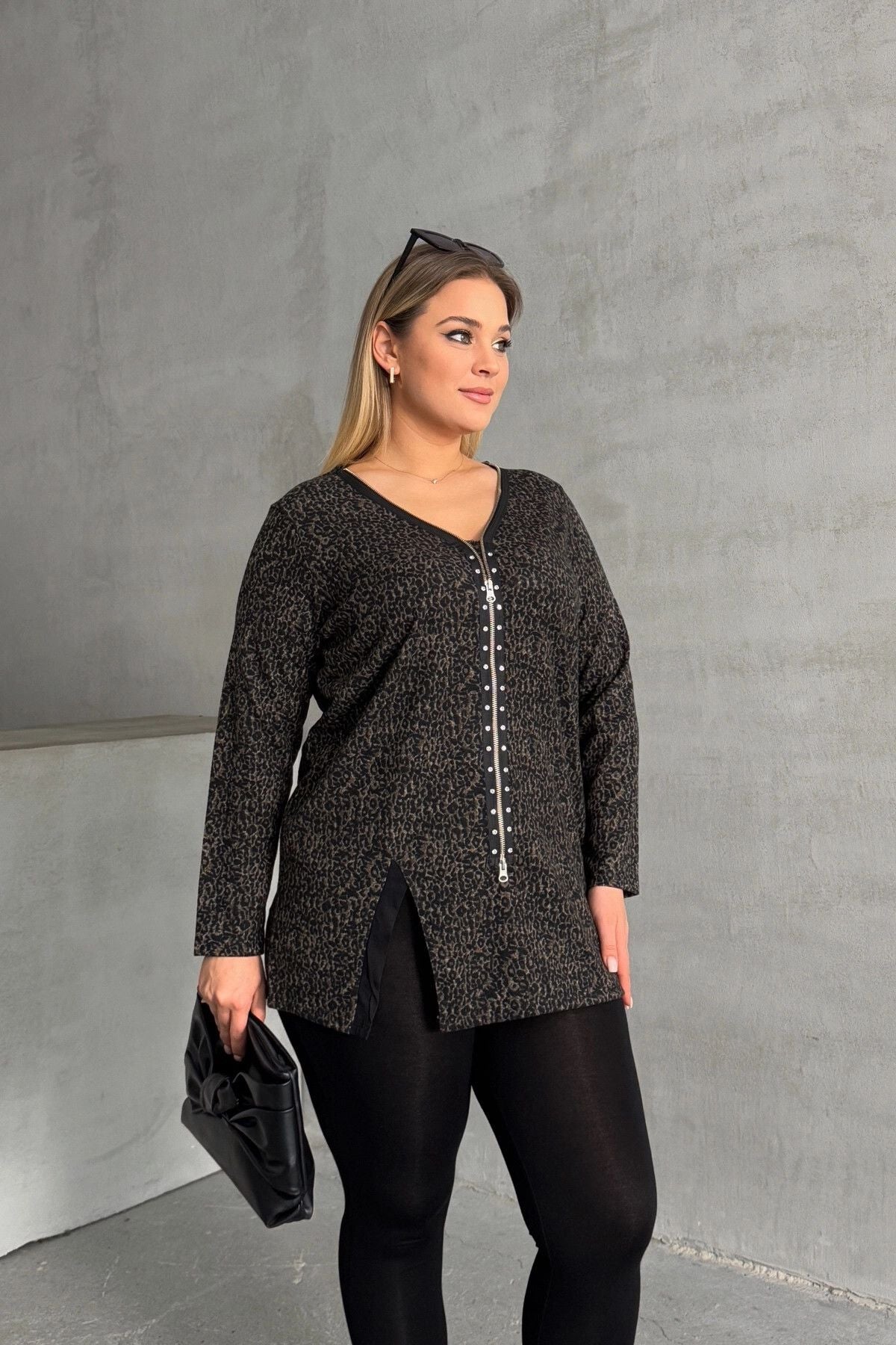 Büyük Beden V Yaka Önü Fermuarlı Yırtmaç Detaylı Leopar Desenli Bluz 173672