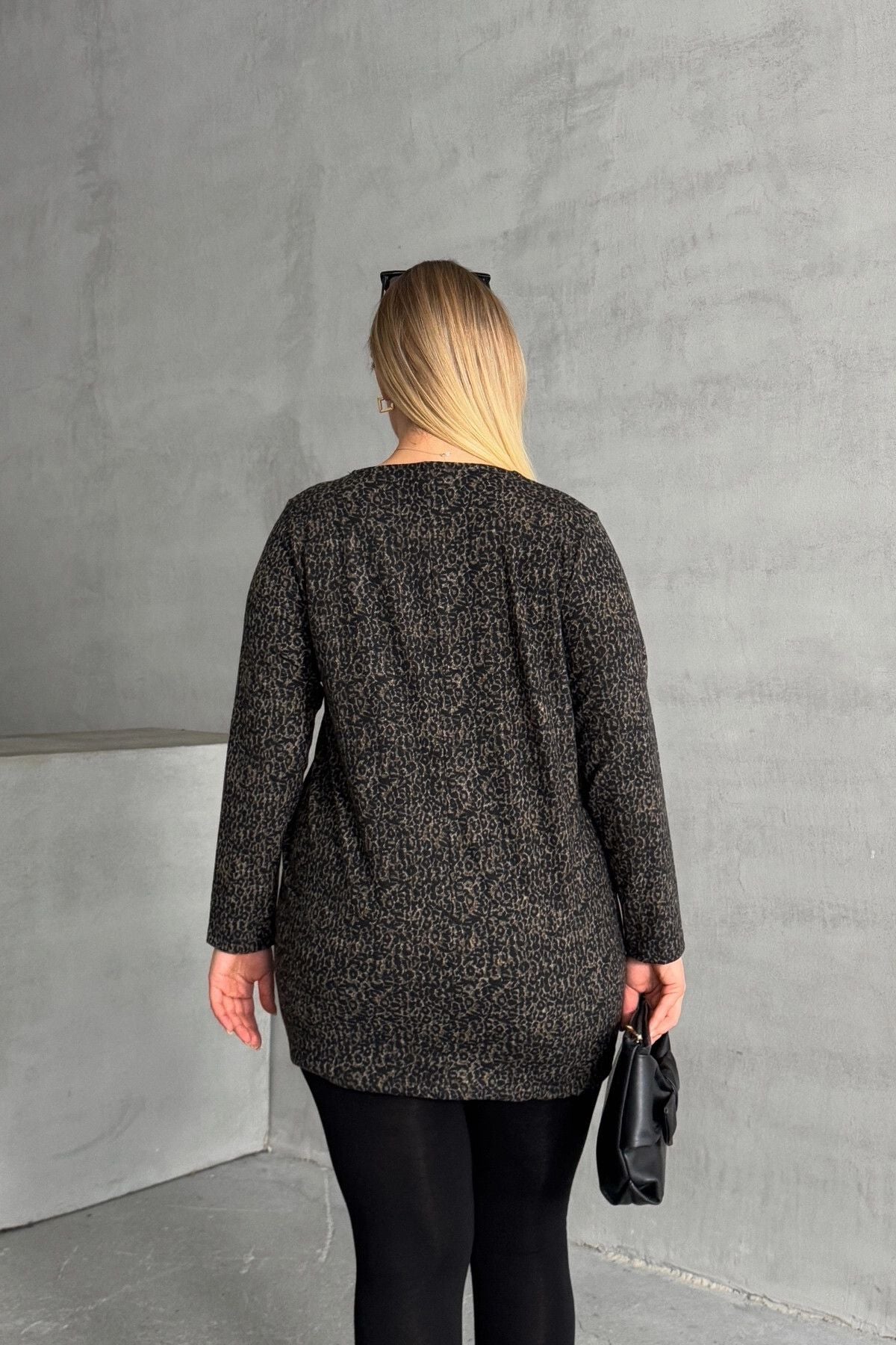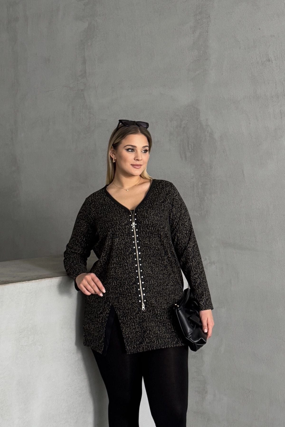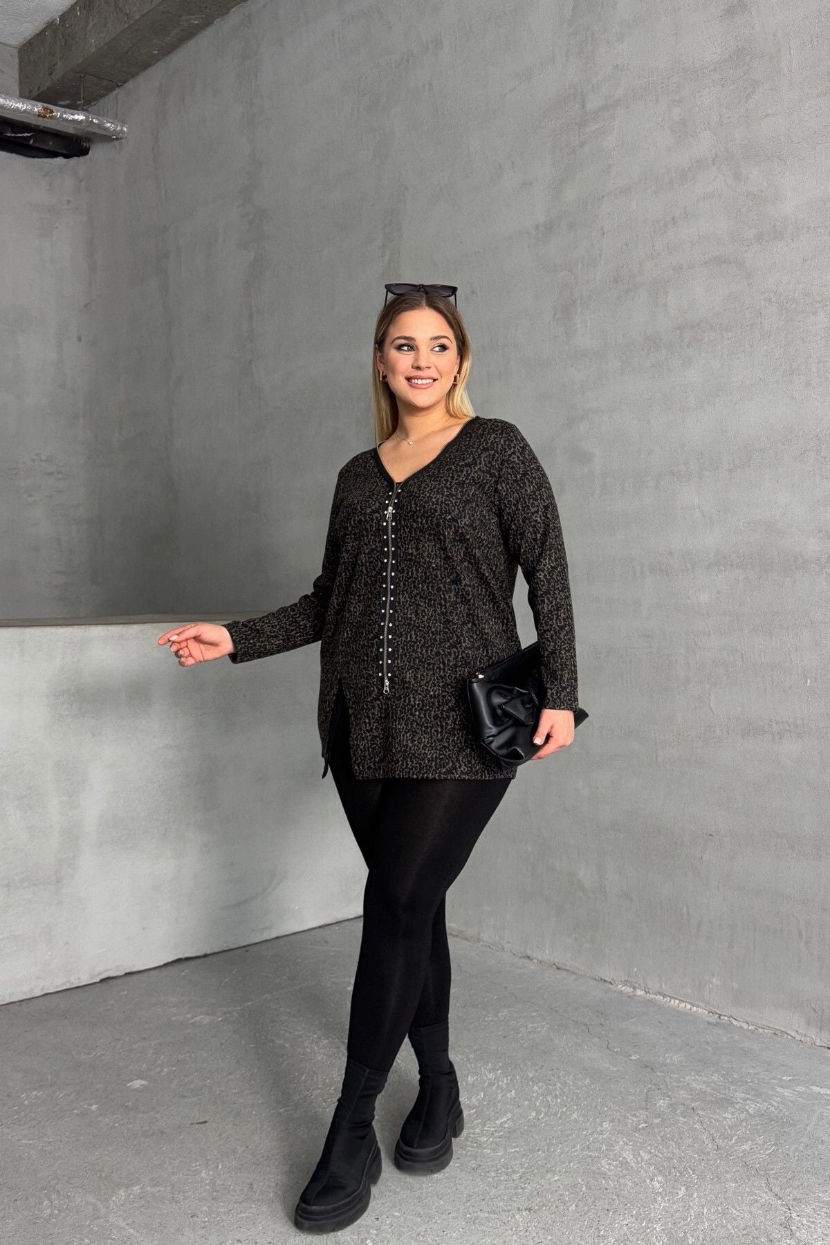 Büyük Beden V Yaka Önü Fermuarlı Yırtmaç Detaylı Leopar Desenli Bluz 173672