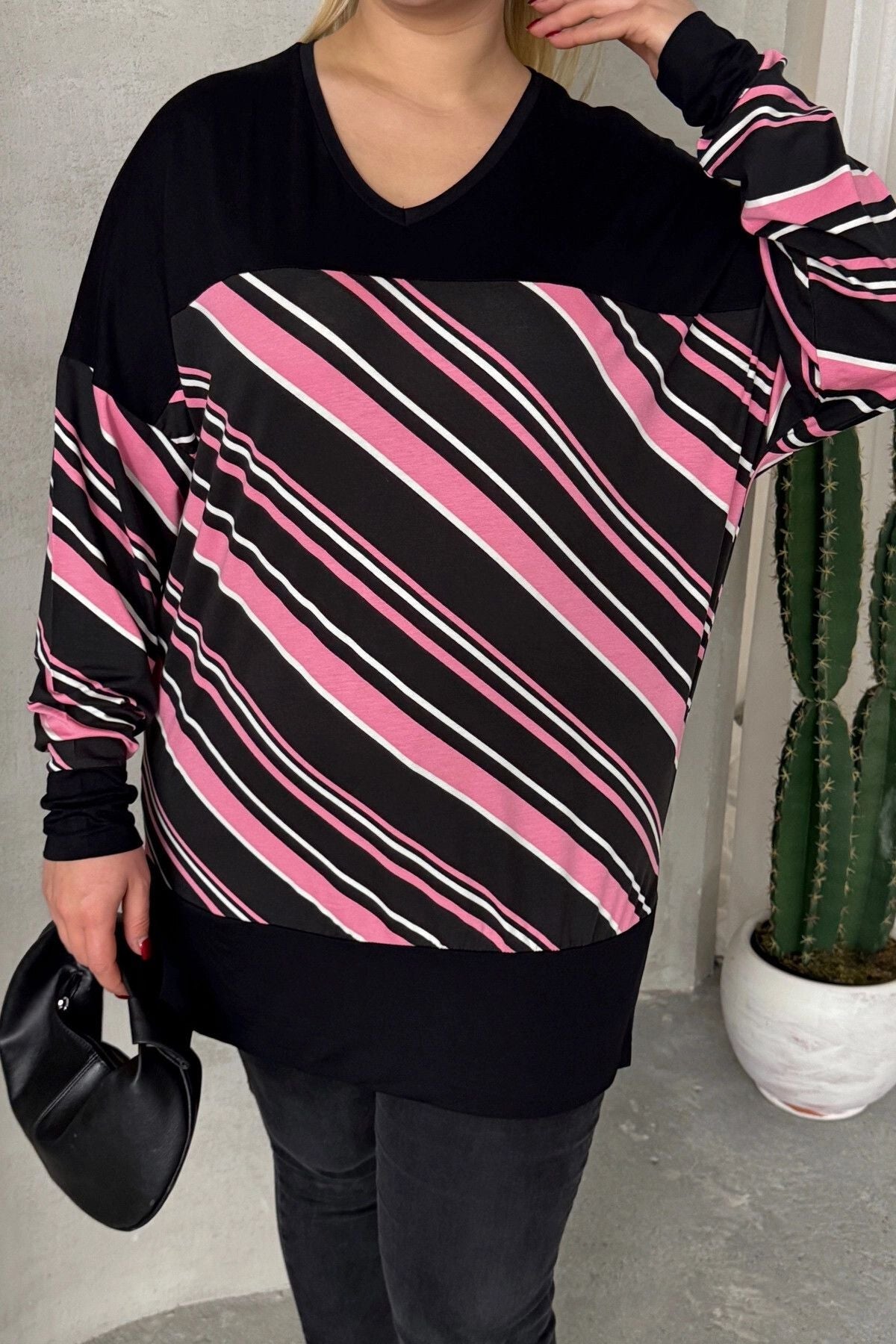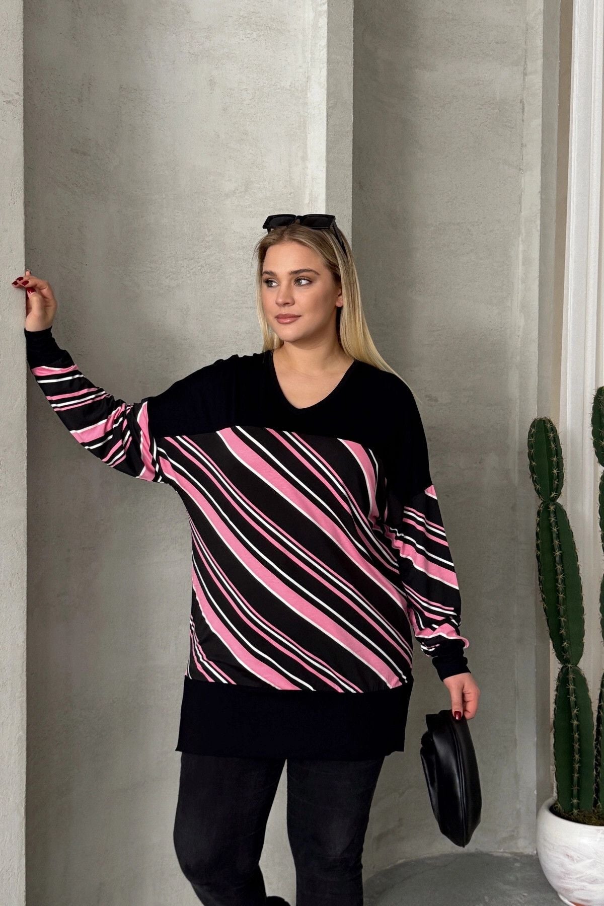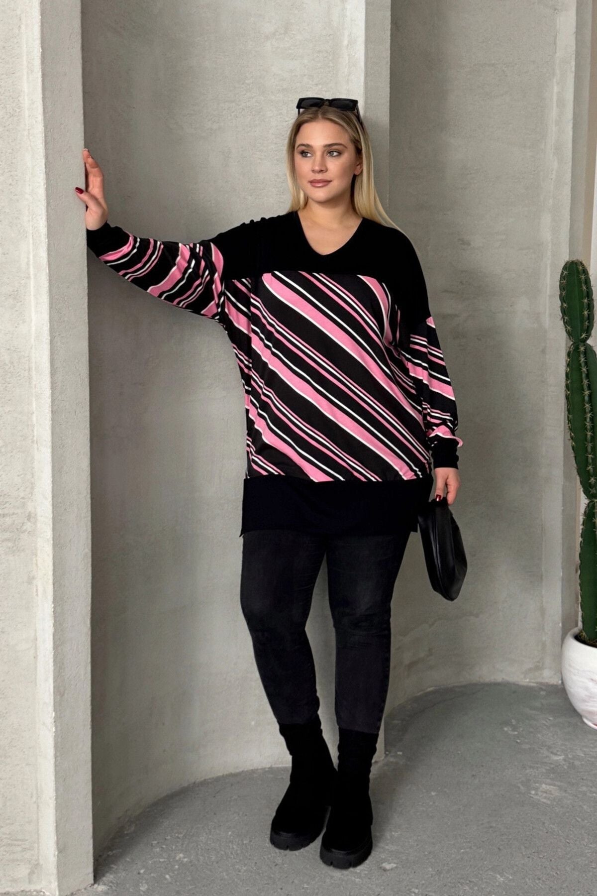 Moda Notu: Canlı renkleri ve modern çizgileriyle dikkat çeken bu tunik, V yaka detayı ve rahat kesimiyle konforu ön planda tutuyor. Yandan yırtmaçları hareket özgürlüğü sağlarken, tayt veya dar paça pantolonlarla mükemmel bir uyum yakalar.