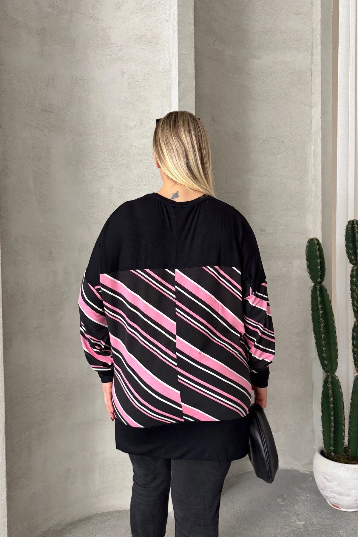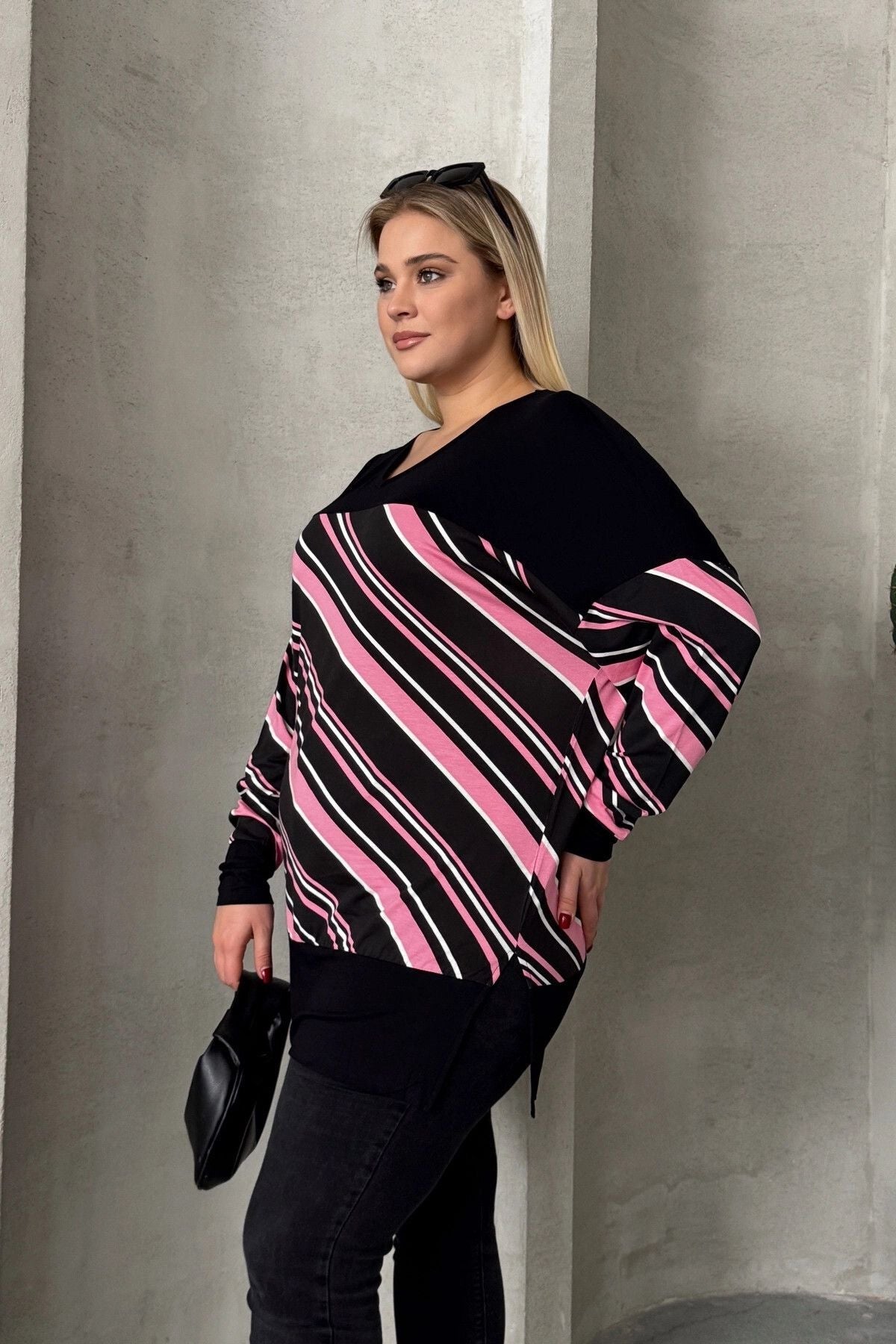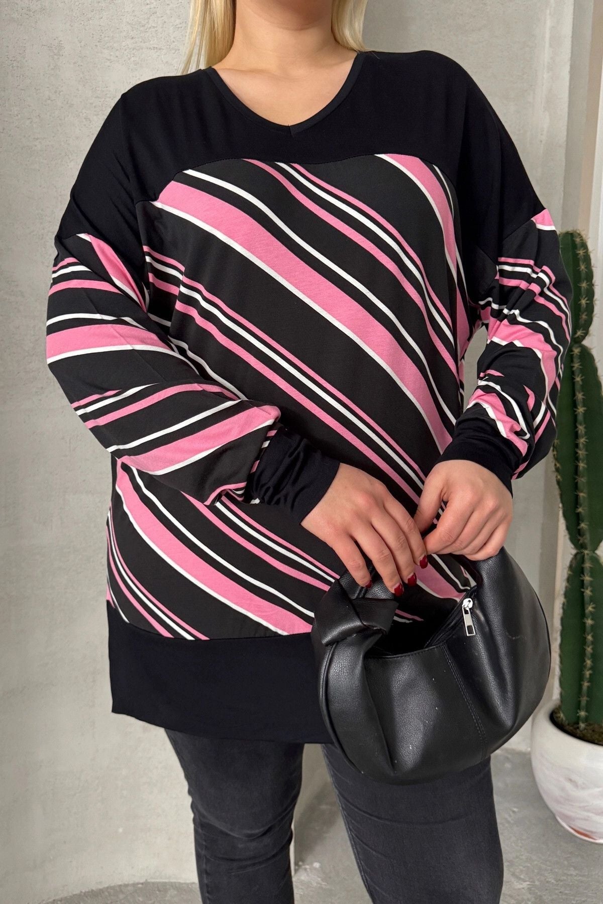 Moda Notu: Canlı renkleri ve modern çizgileriyle dikkat çeken bu tunik, V yaka detayı ve rahat kesimiyle konforu ön planda tutuyor. Yandan yırtmaçları hareket özgürlüğü sağlarken, tayt veya dar paça pantolonlarla mükemmel bir uyum yakalar.