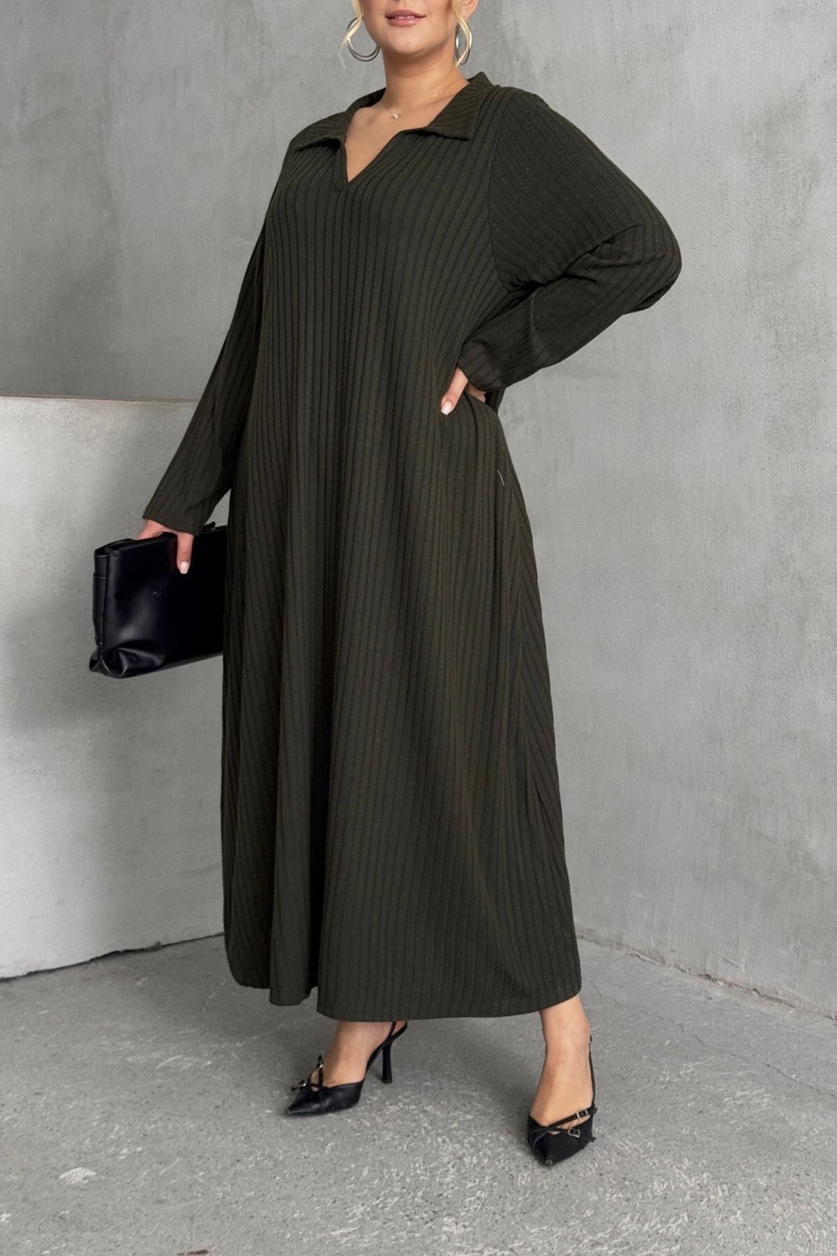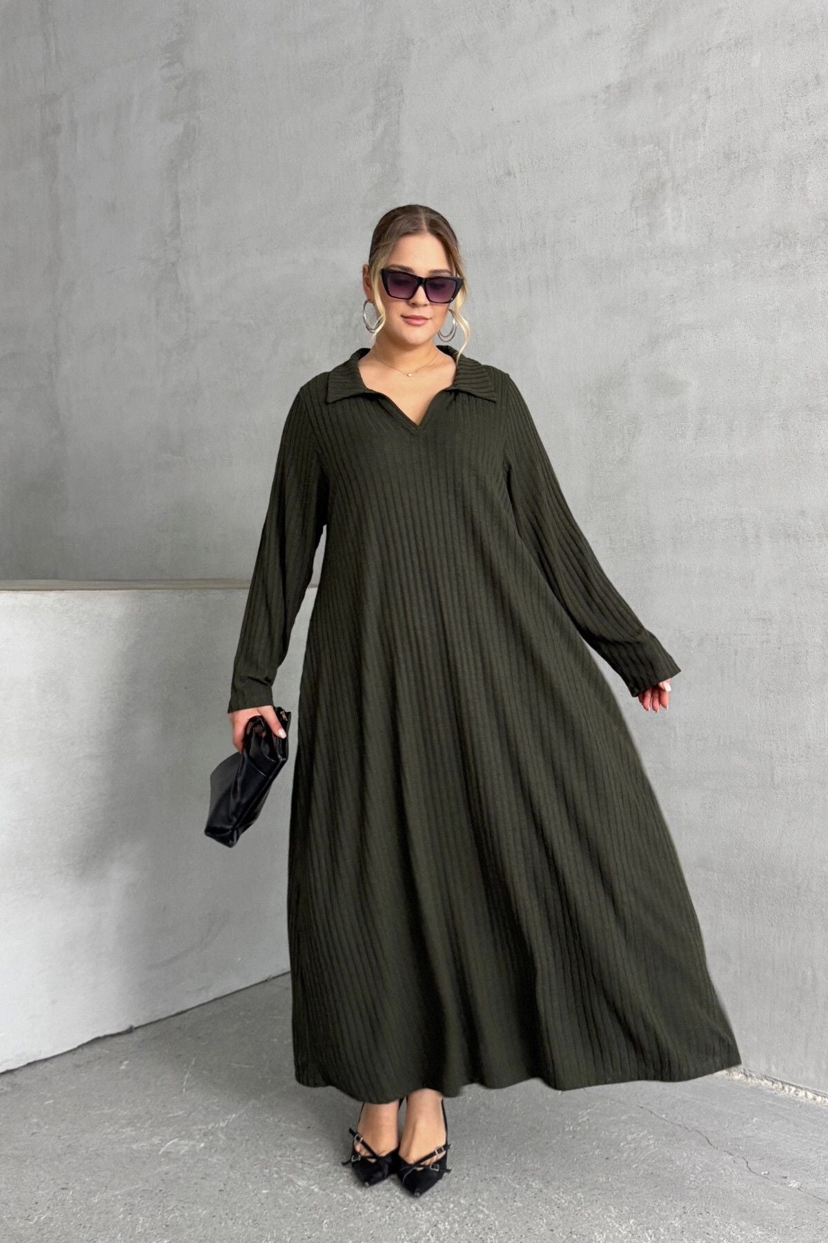 Büyük Beden V Yaka Uzun Kollu Fitilli Eteği Bollaşan Uzun Elbise 322182