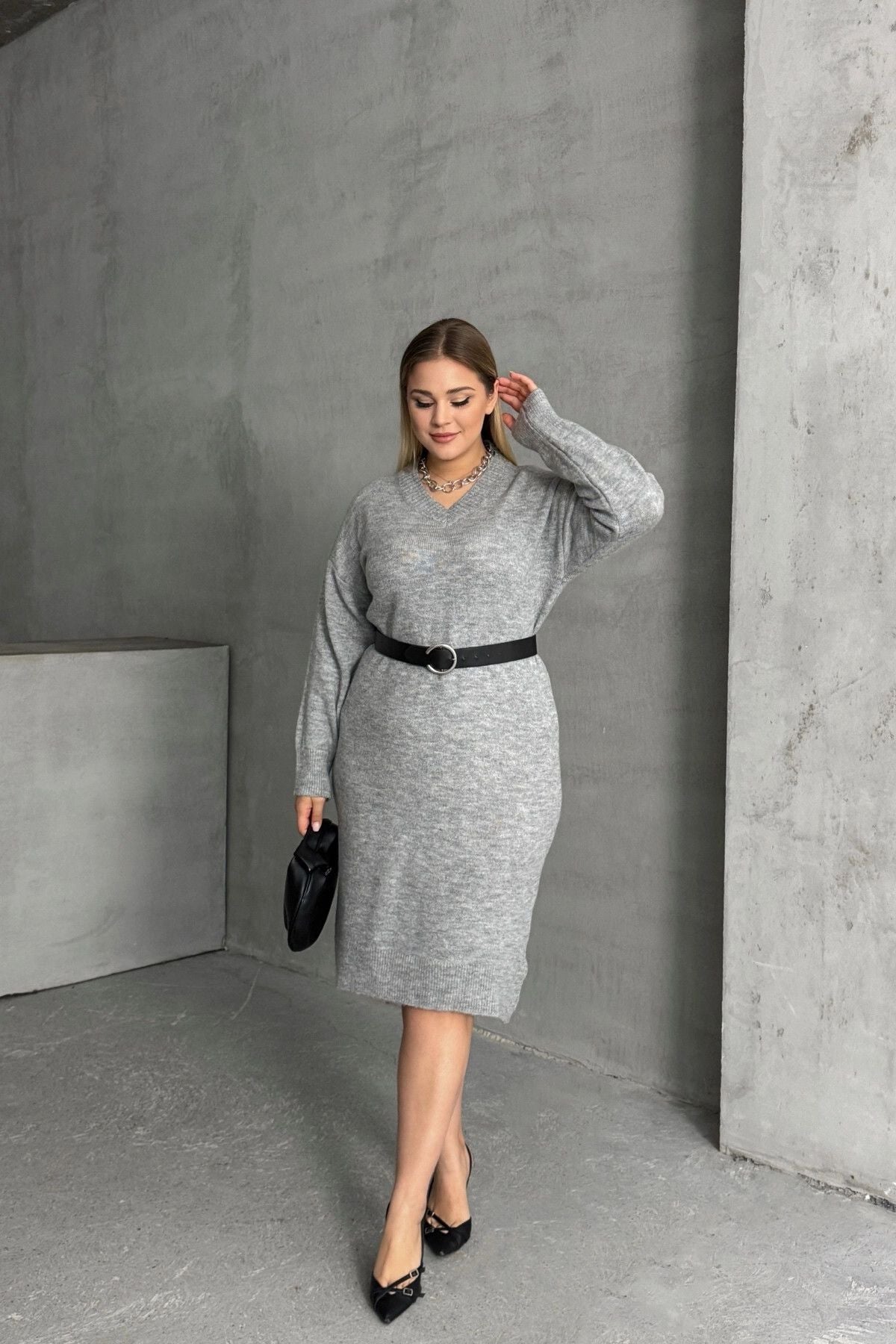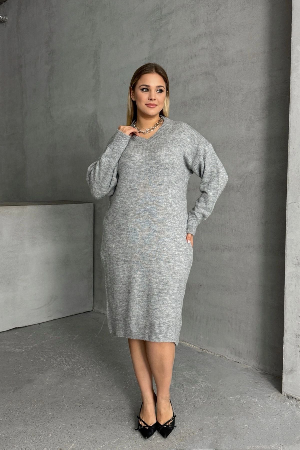 Büyük Beden V Yaka Uzun Kollu Örme Kazak Elbise 302335