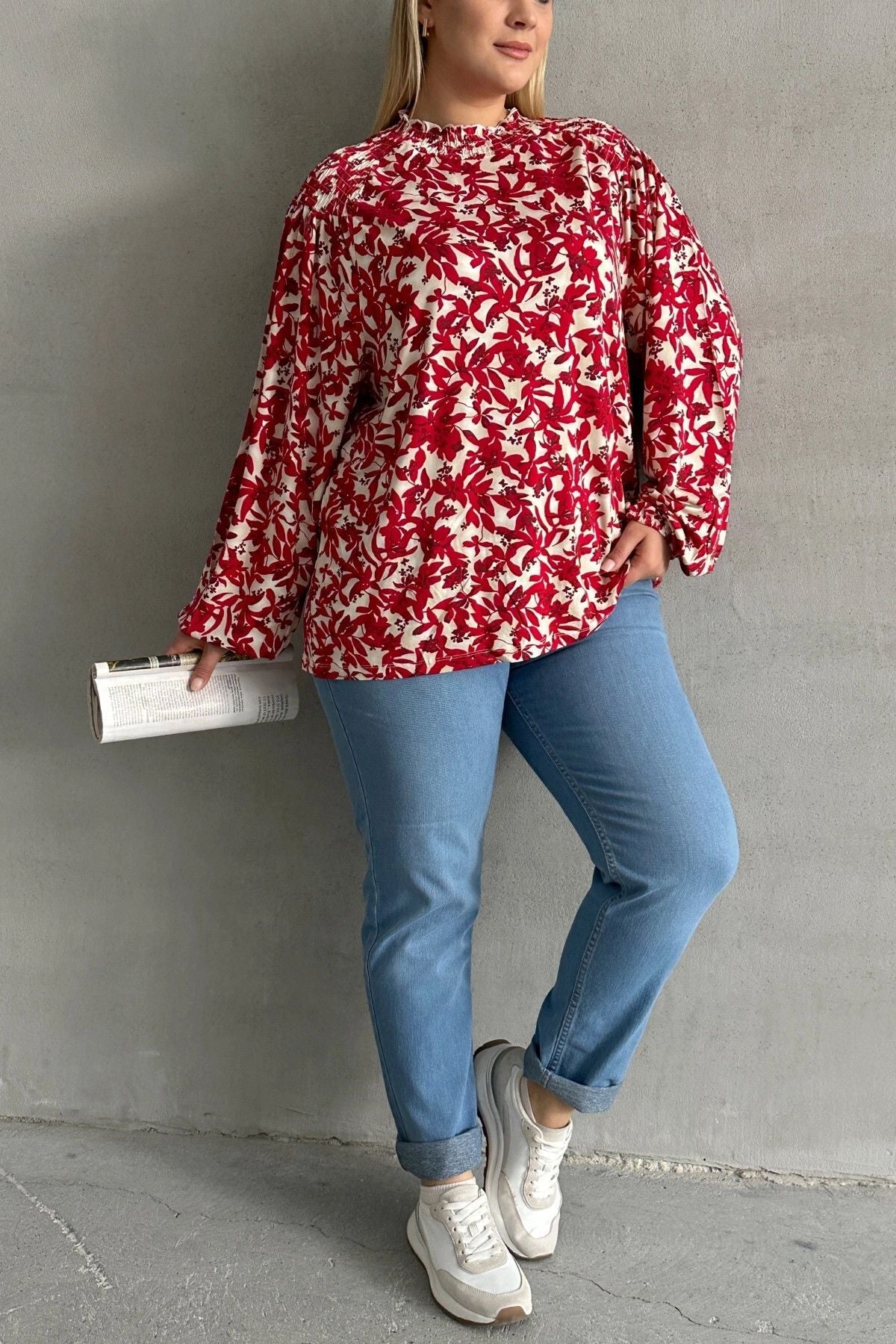 Büyük Beden Yakası Büzgülü Uzun Kollu Desenli Bluz E15233